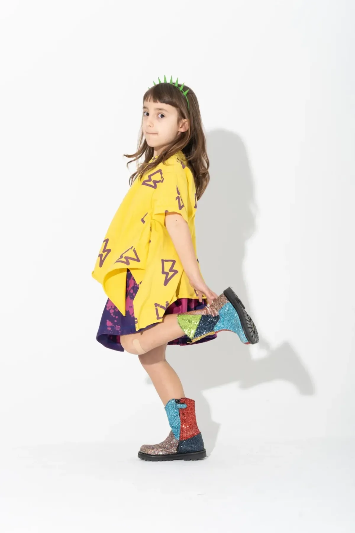 A yellow jersey t-shirt with a vivid scene of purple thunder all-over-print. It's got short sleeves, side flaps, and a round neck – a match made in kid's fashion heaven!