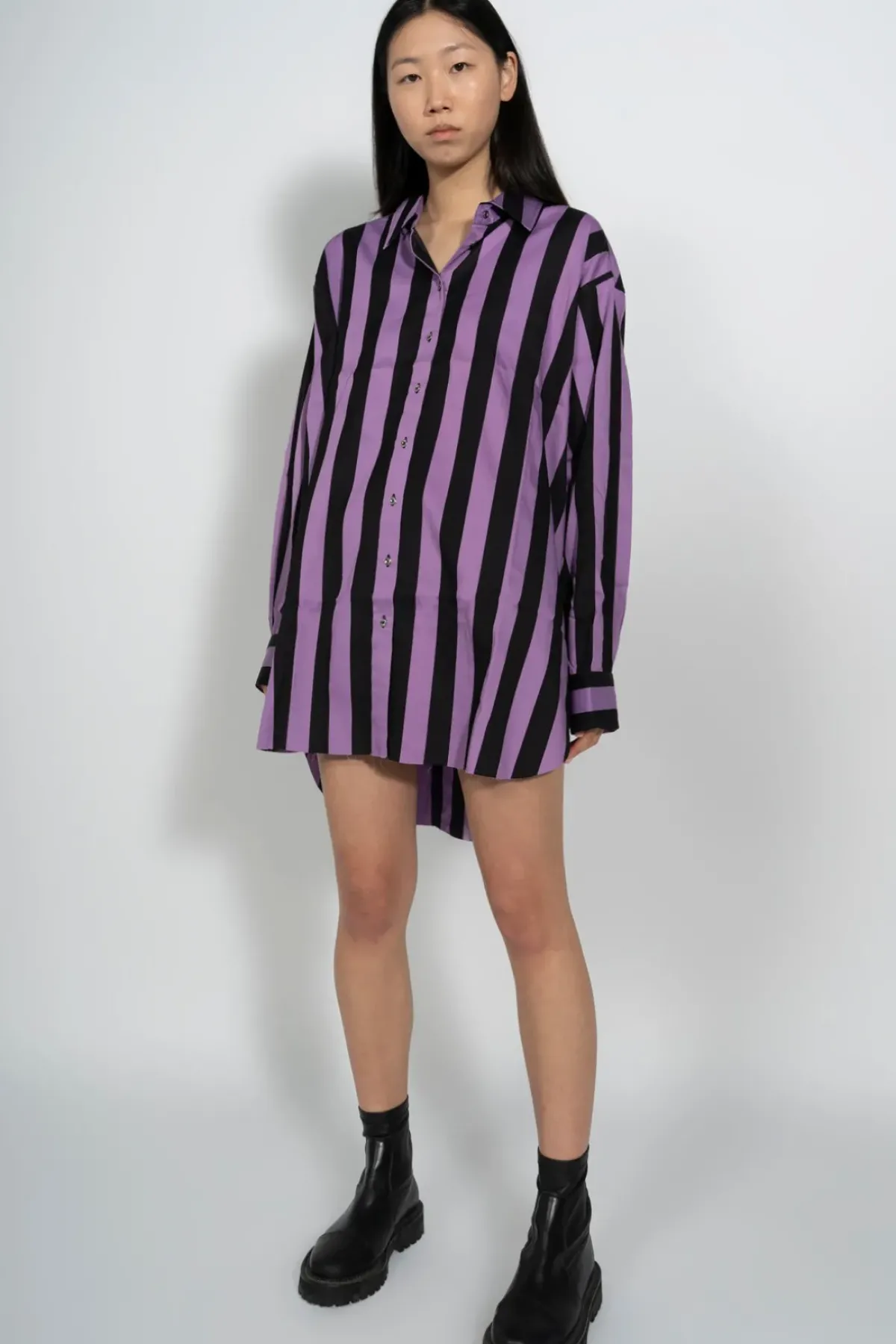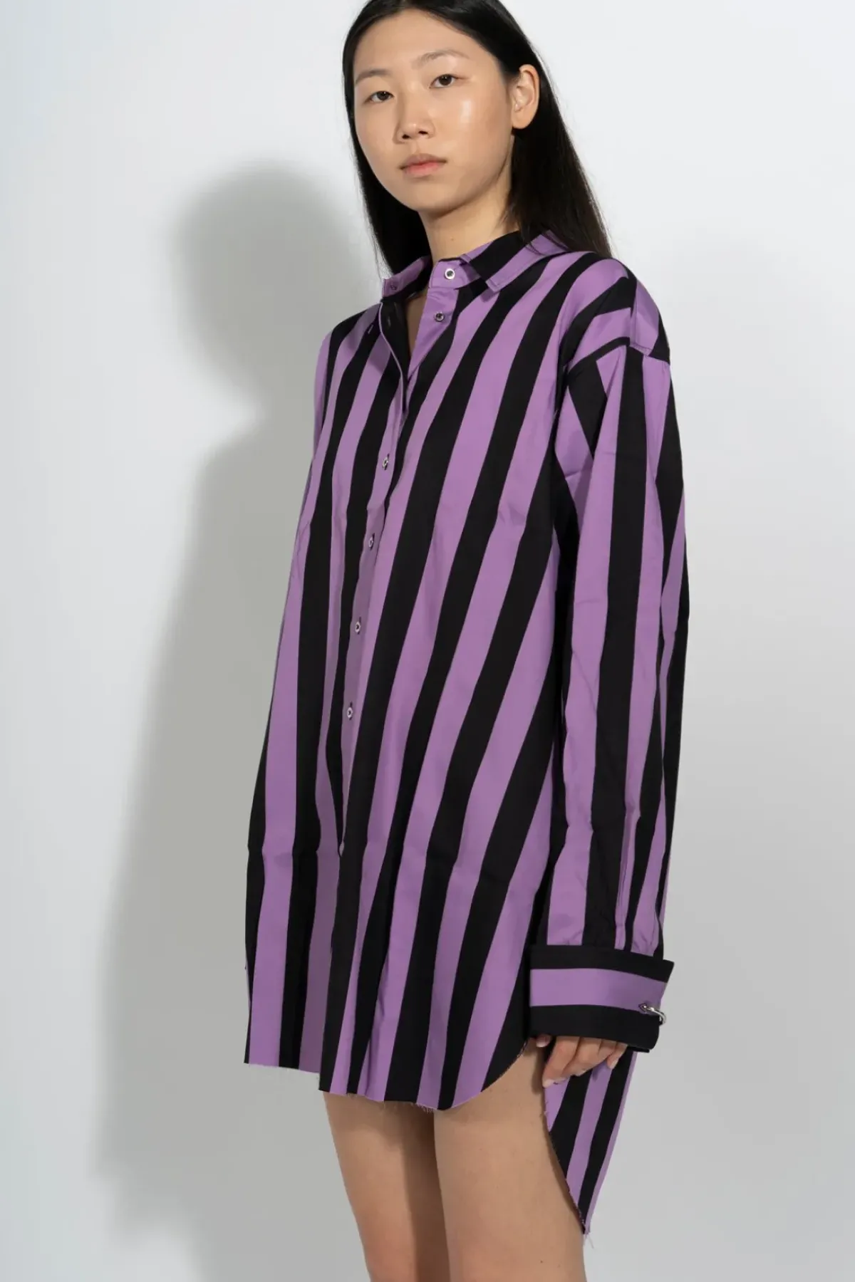 Our XXL long-sleeve cotton button-up shirt in black and lilac stripes features high neck collar, fold up cuffs with metal ring and unfinished asymmetrical hem.