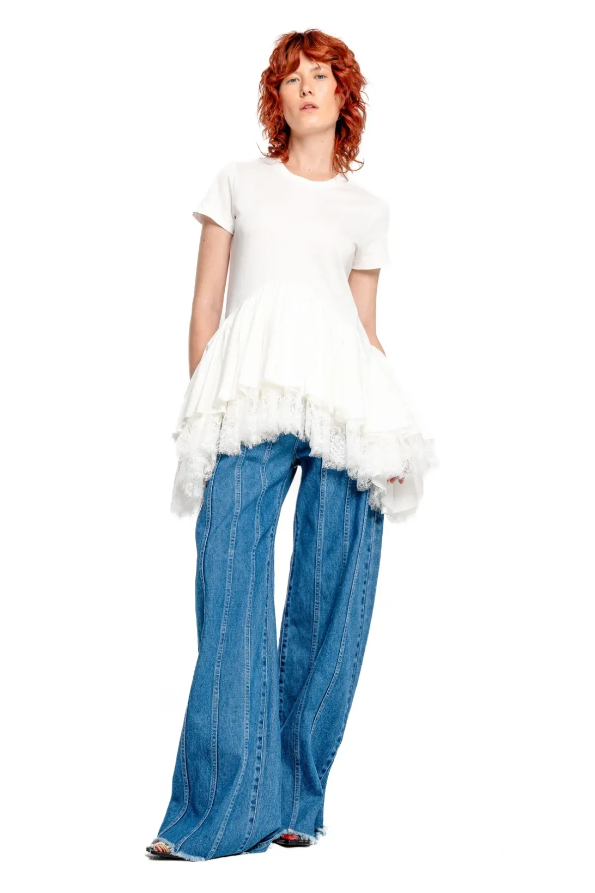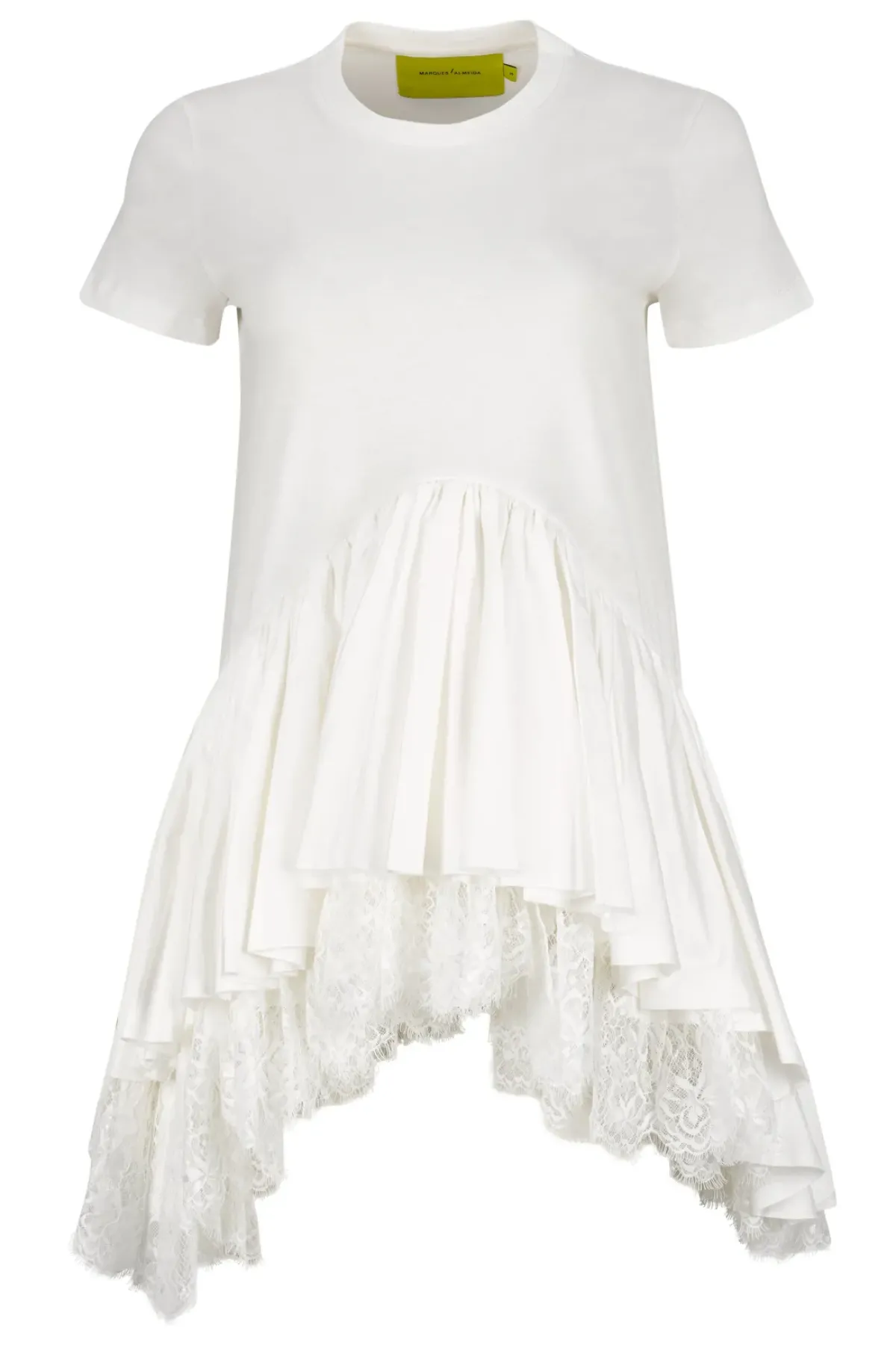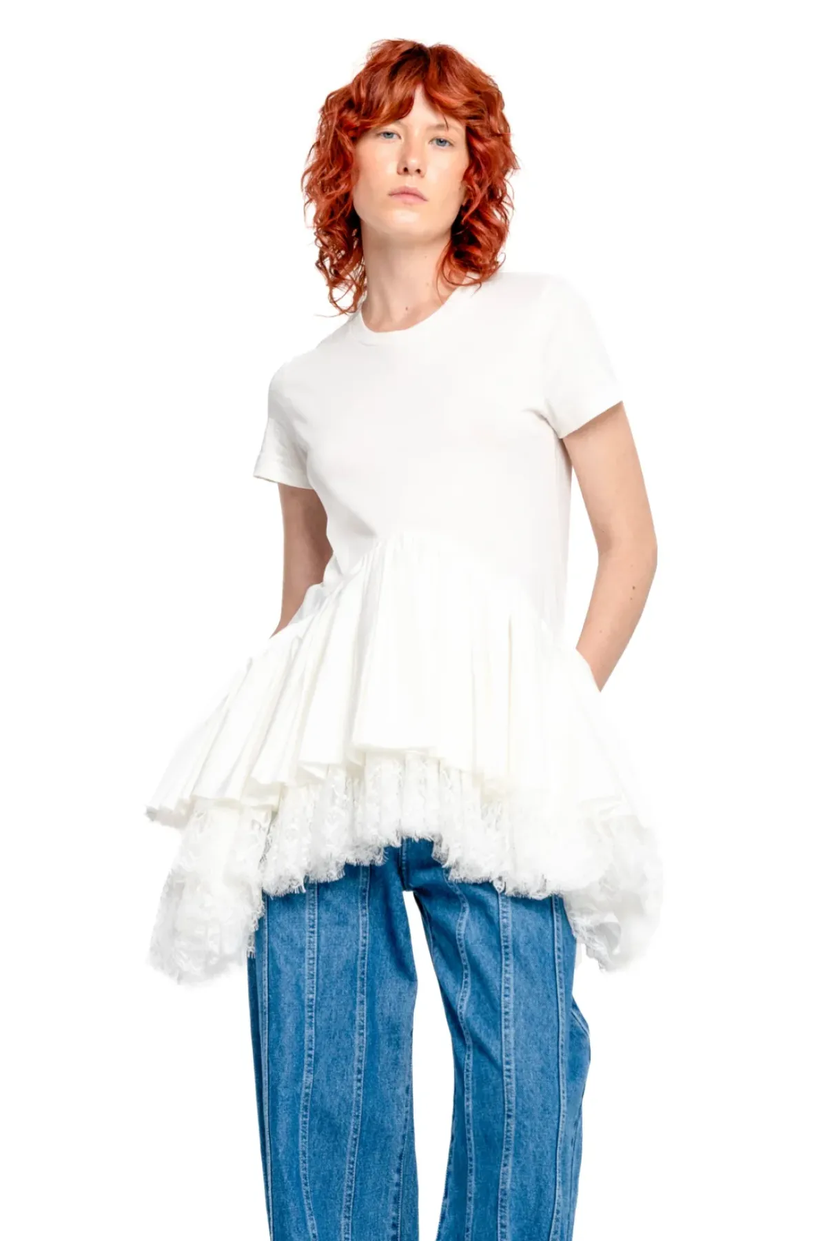 Indulge in the comfort of our cap sleeve t-shirt, made from soft white jersey cotton. Complete with a round neck, delicate bottom frill and lace hem, this shirt is the perfect addition to any wardrobe.