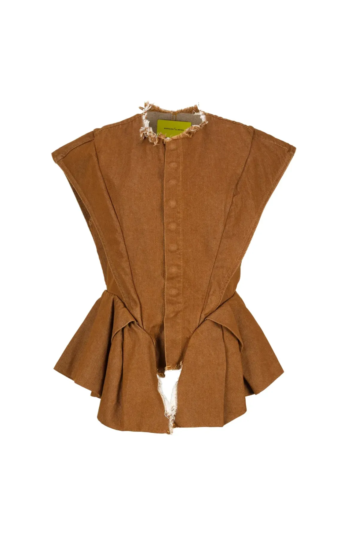 Transform your wardrobe with our Brown Denim Top! Featuring structured shoulders, front buttons, a cinched waist and hip frills, this sleeveless top is the perfect blend of fashion and functionality. Elevate your look and embrace the versatility of this must-have piece today!