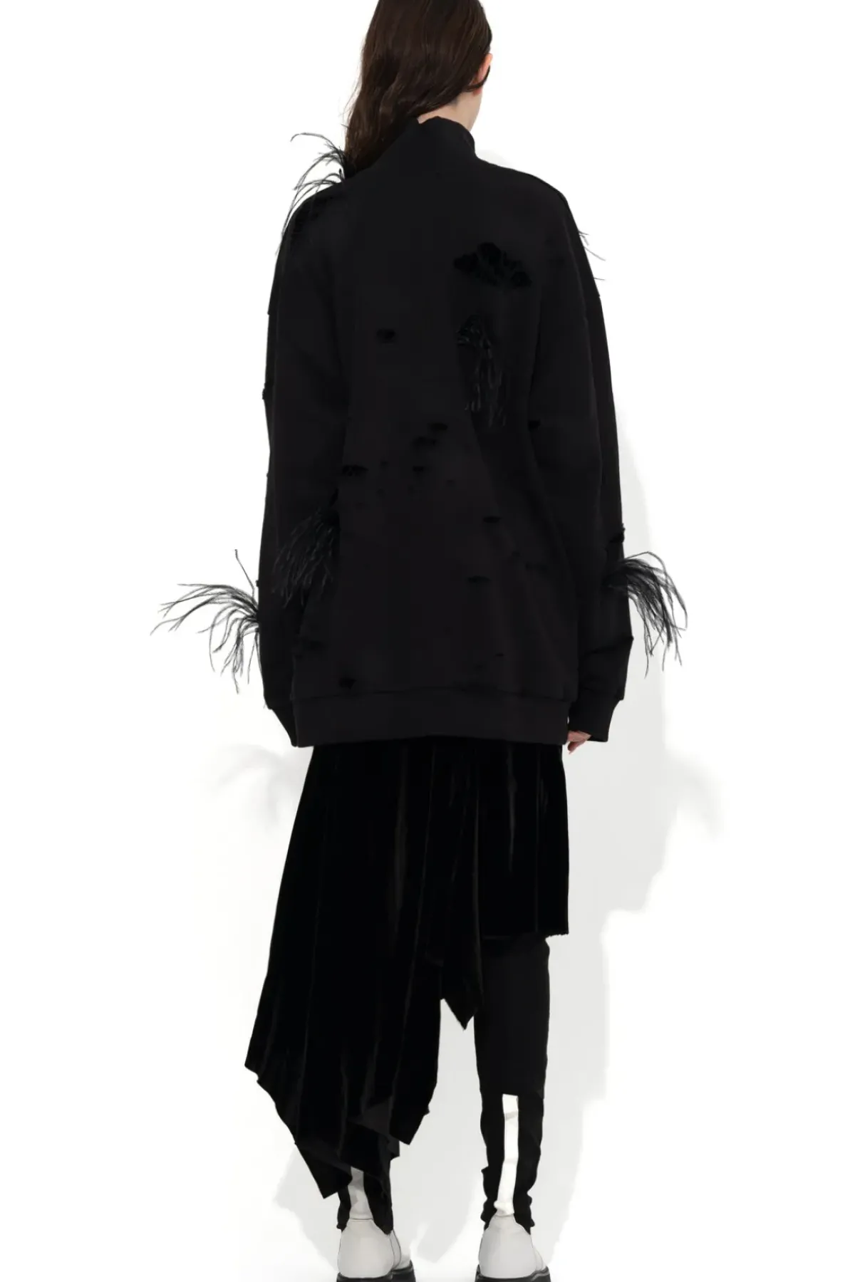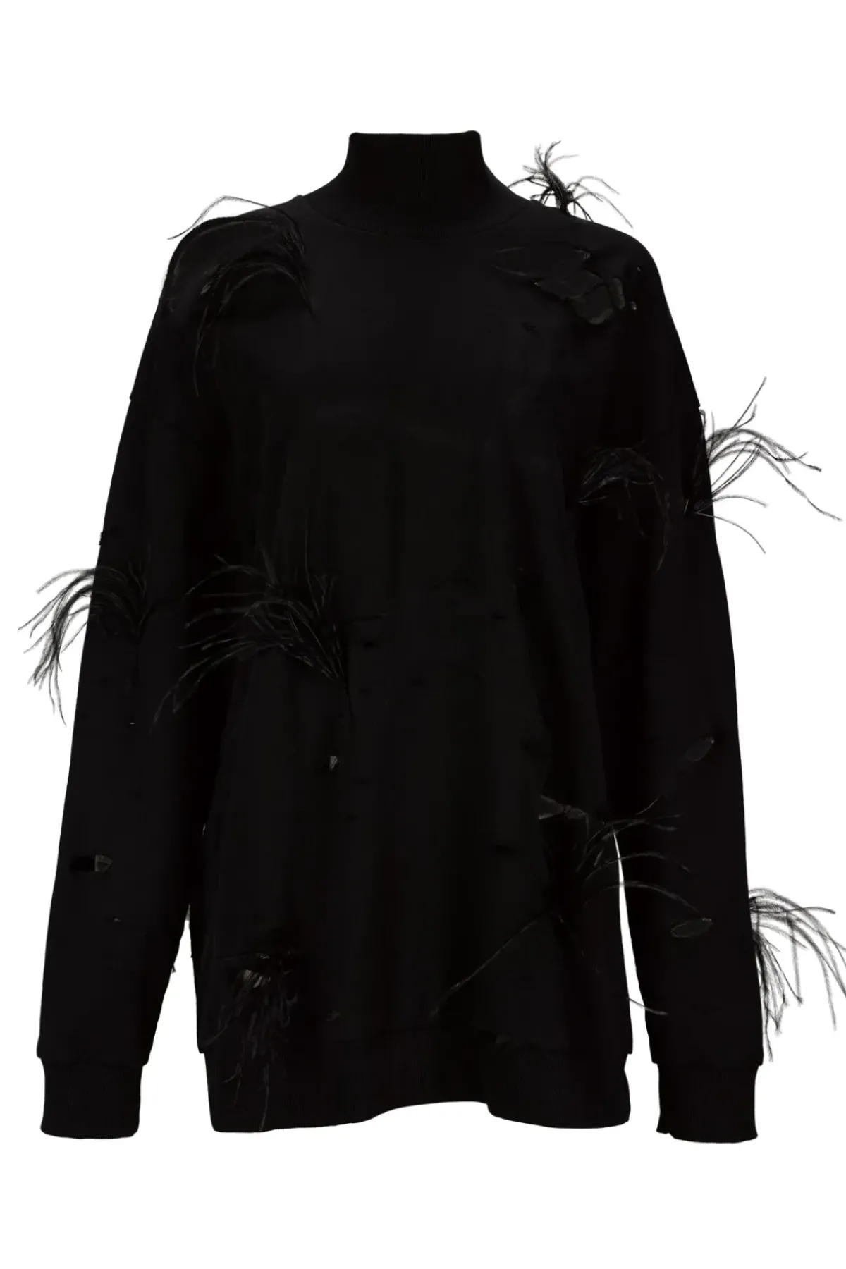 Experience our black oversized jumper featuring a ribbed turtleneck, long sleeves and feathers delicately adorning the openings.