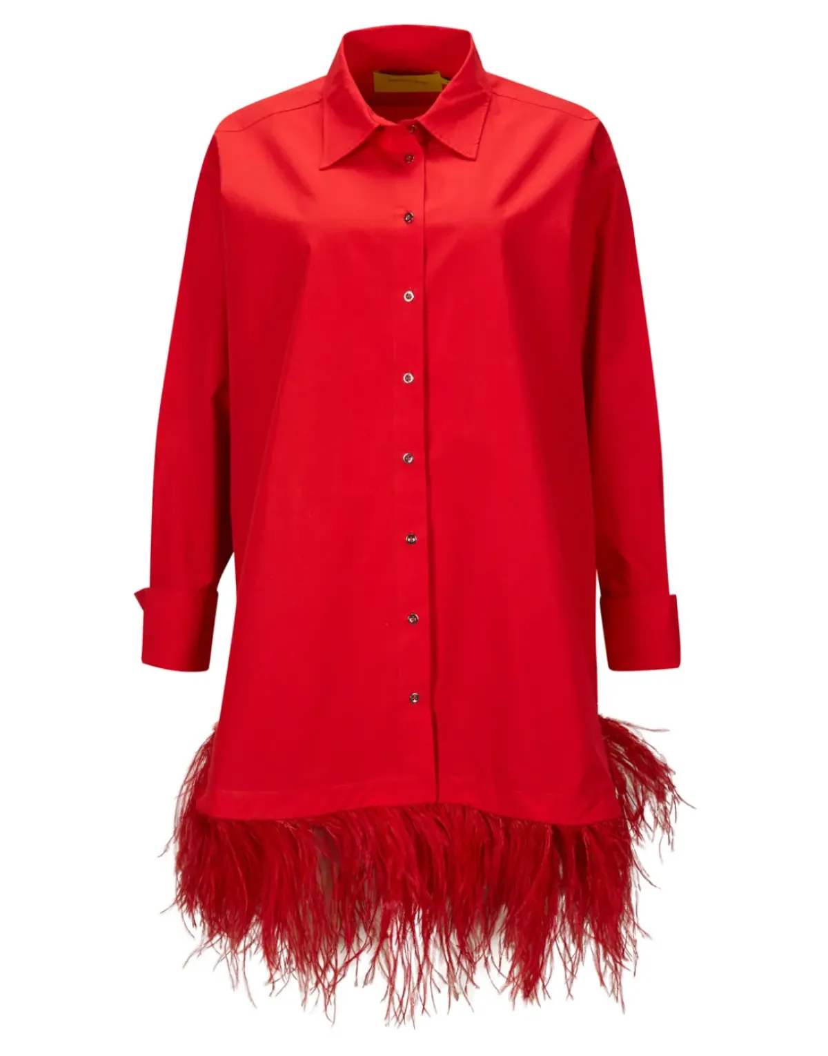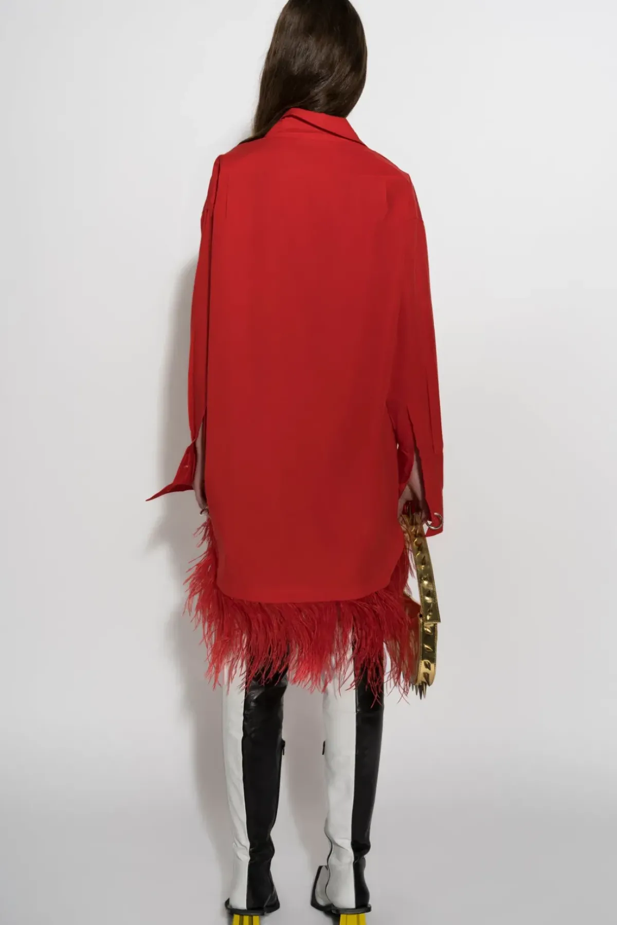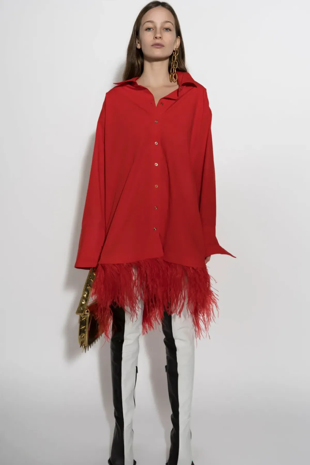 This oversized, organic cotton button-up shirt is perfect for any occasion! Show off the long sleeves with metal ring detail and an eye-catching red ostrich feather hem.