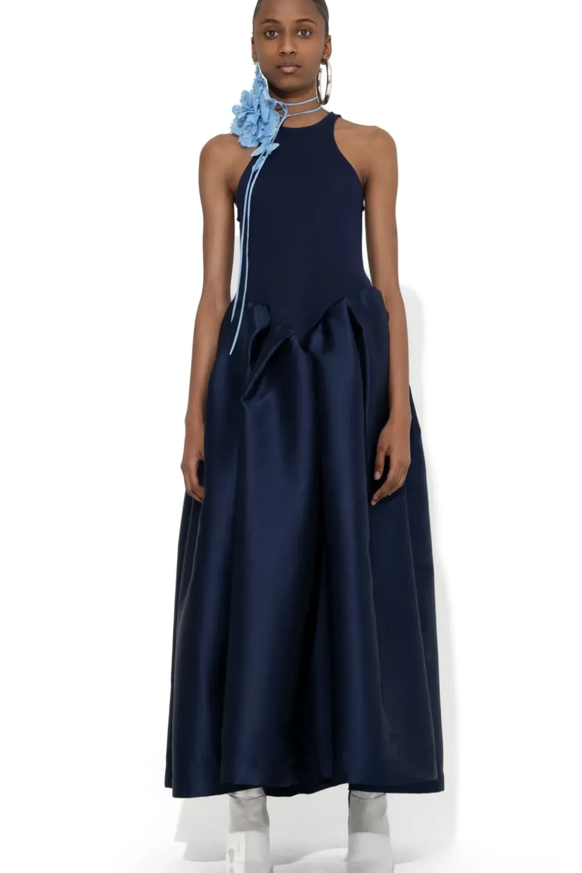 This dress captivates with a vibrant navy tank top in rib jersey and paired with a navy puff long skirt in mikado! Experience comfort like never before!