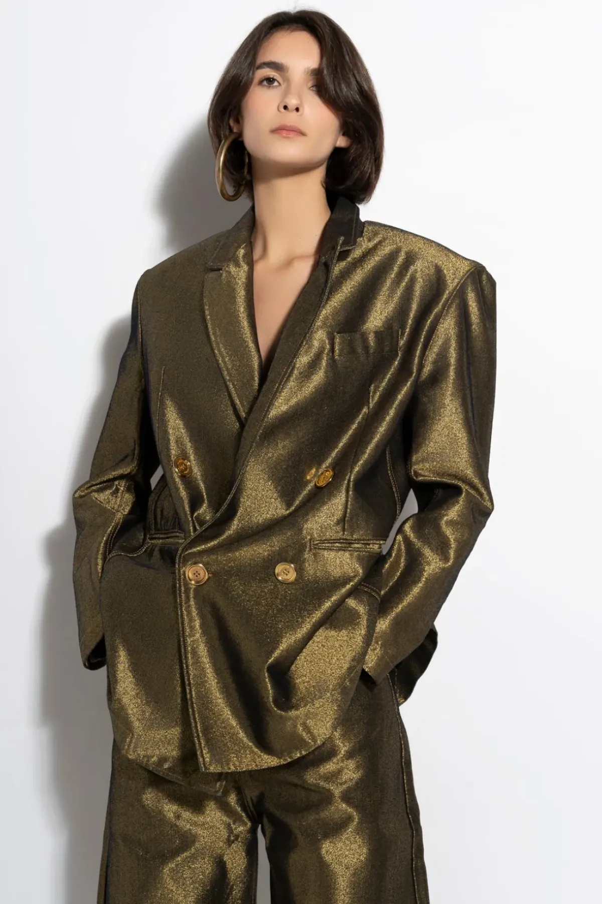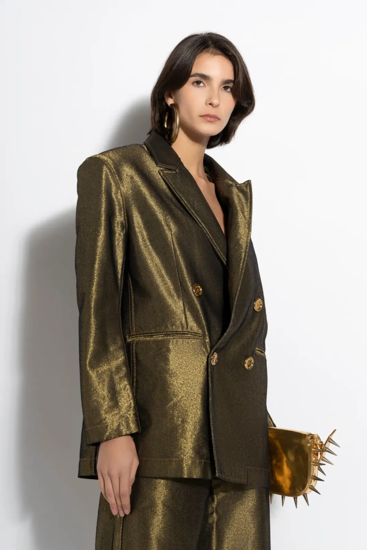 Oversized blazer crafted from shimmering gold lurex denim, it features shoulder pads, gleaming golden buttons and two pockets for all your essentials.