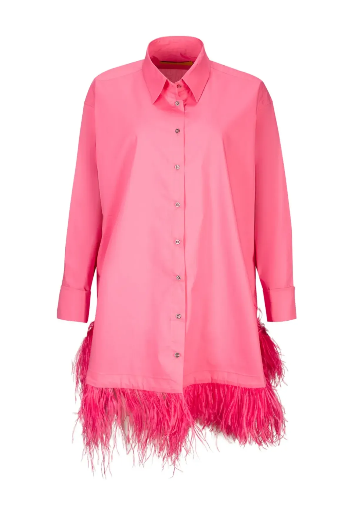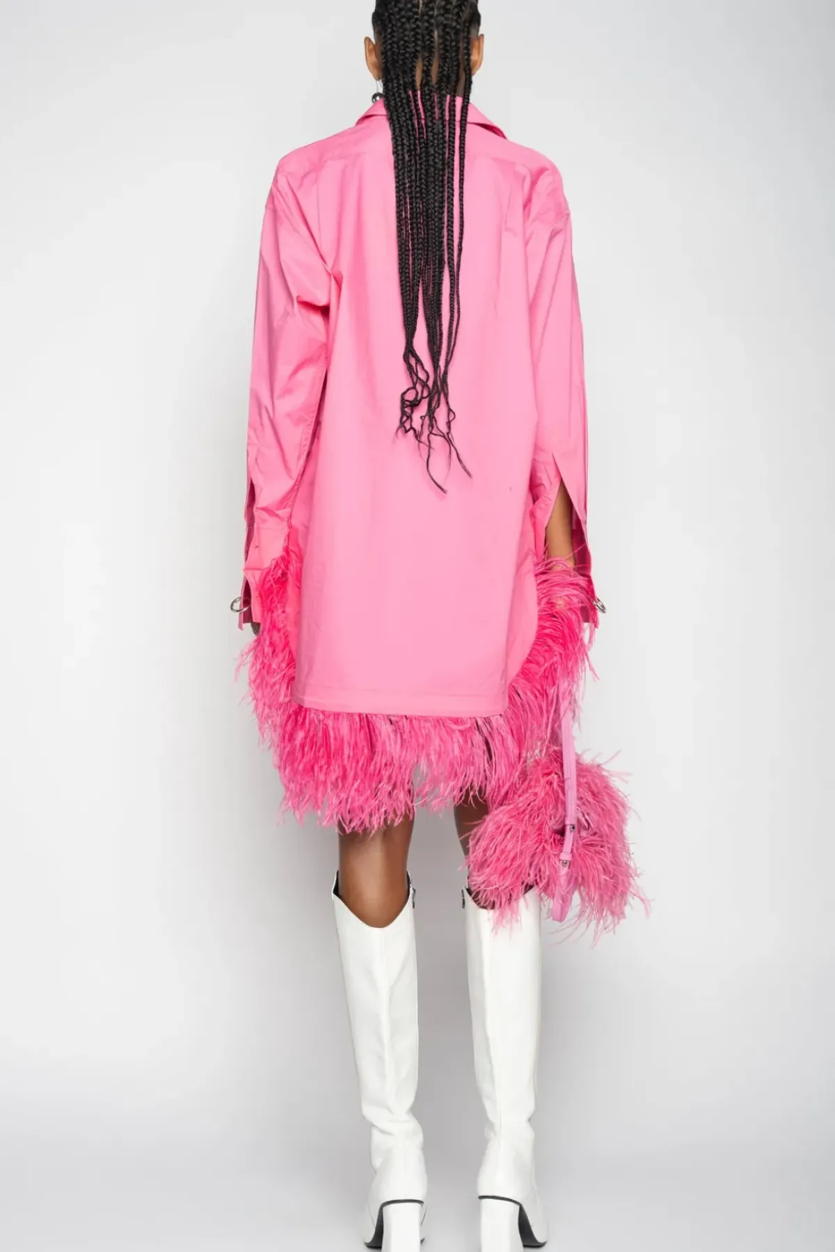 Oversized button-up shirt dress in radiant pink organic cotton features long sleeves with metal ring and a pink ostrich feather hem.