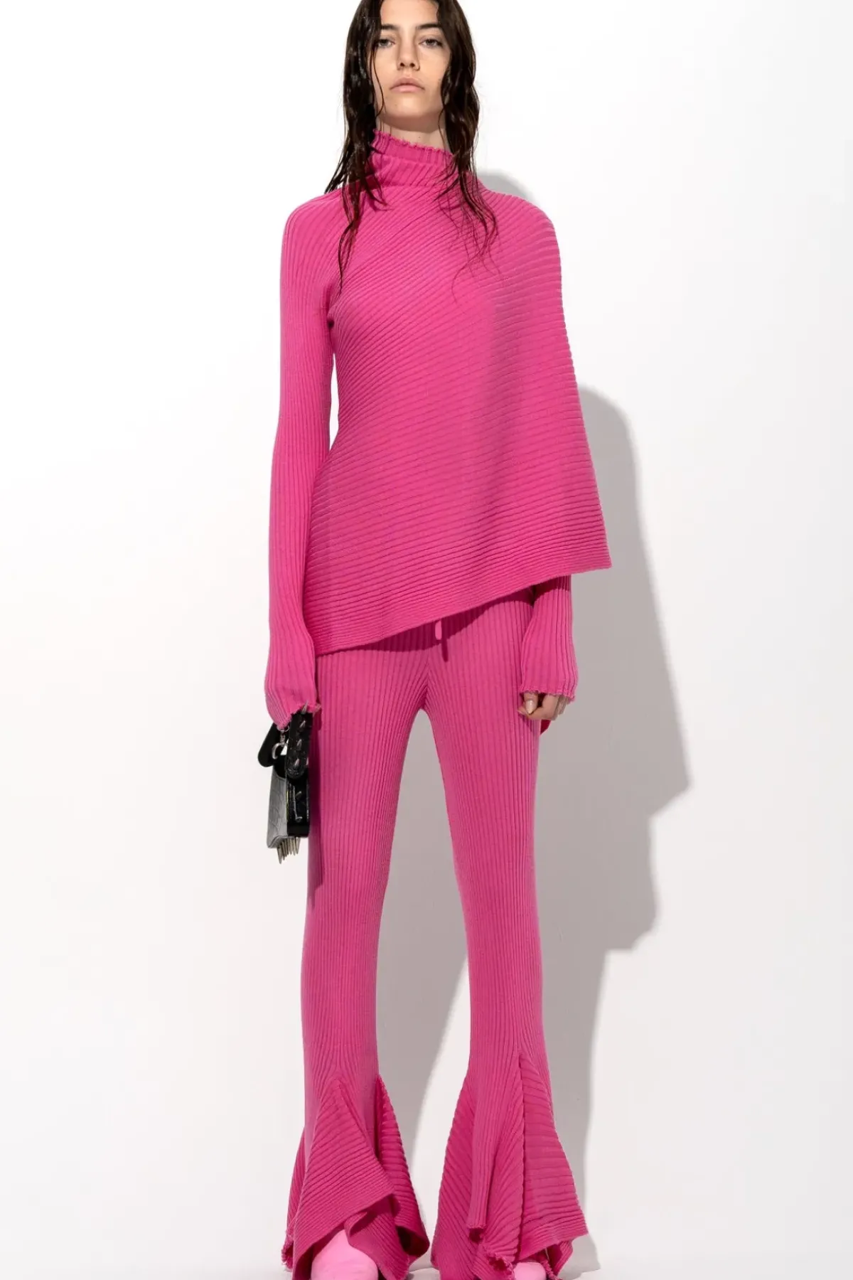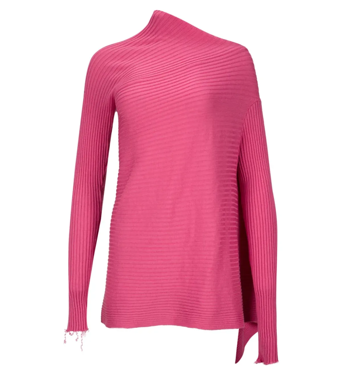 An asymmetrical knit sweater crafted from pink merino wool. Showcasing a striking cowl neck and signature M'A raw hemlines.