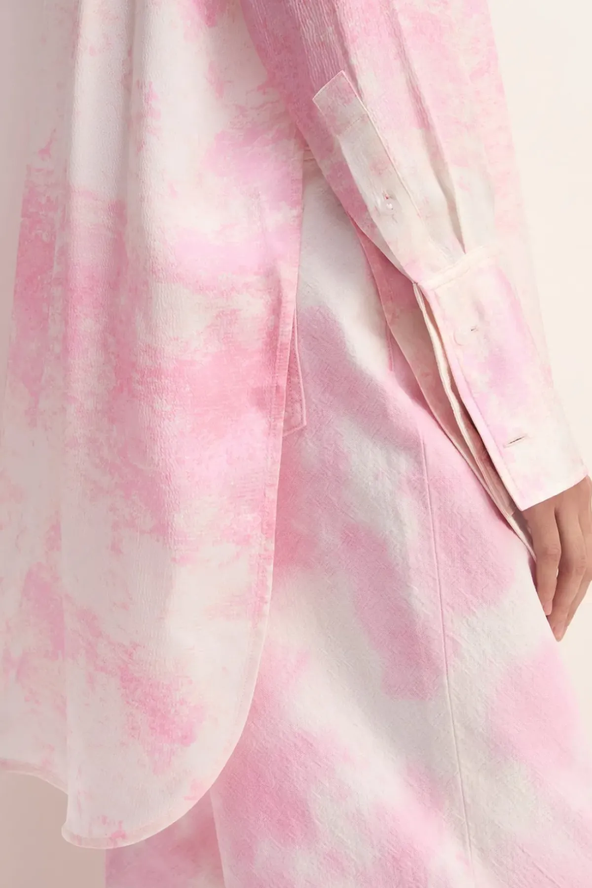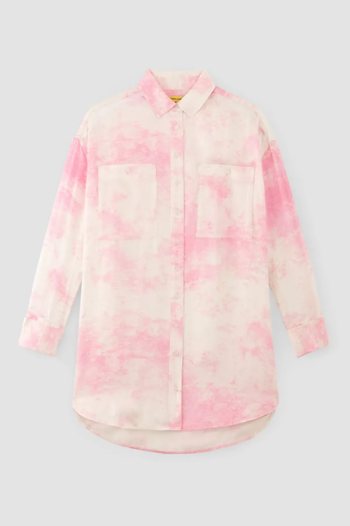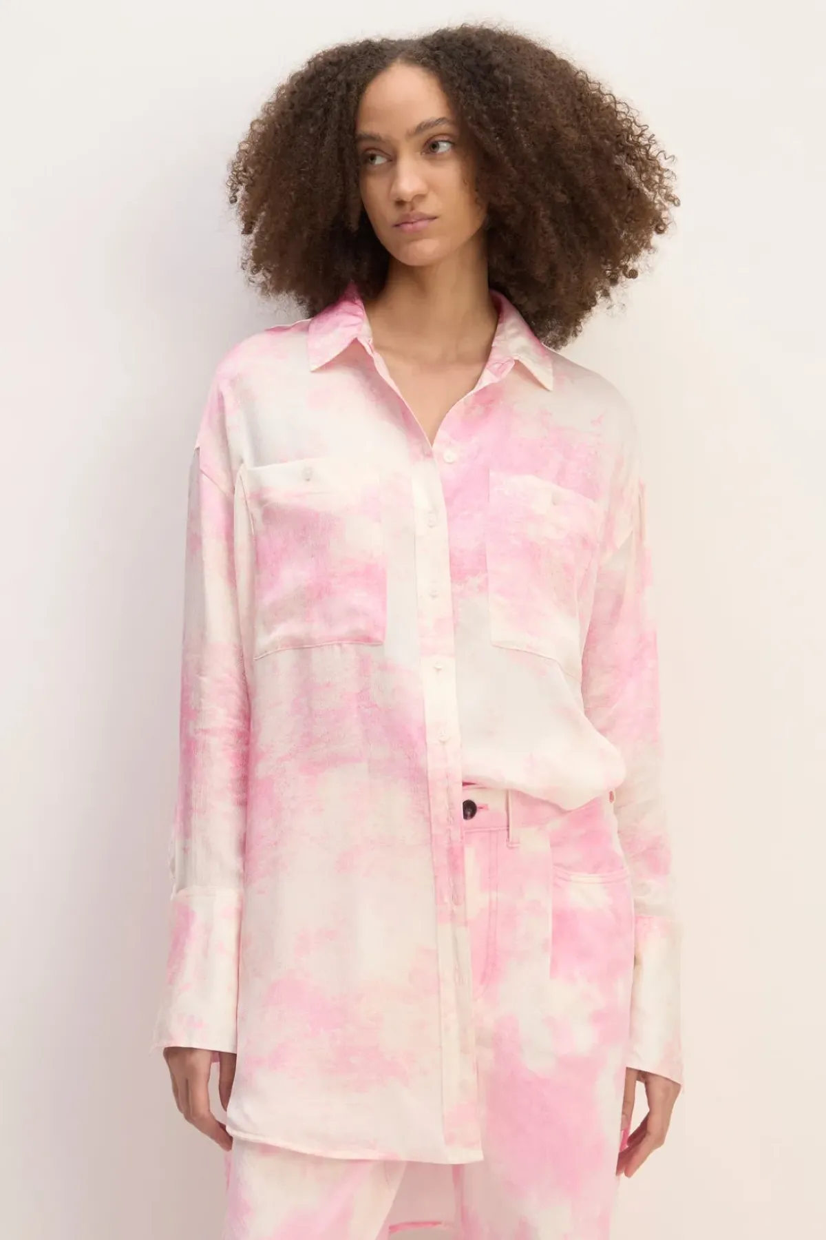 Our pink tie-dye satin oversized shirt awaits! With its long sleeves, button-up front, front pockets, and oversized fit, this must-have piece will be your new go-to.