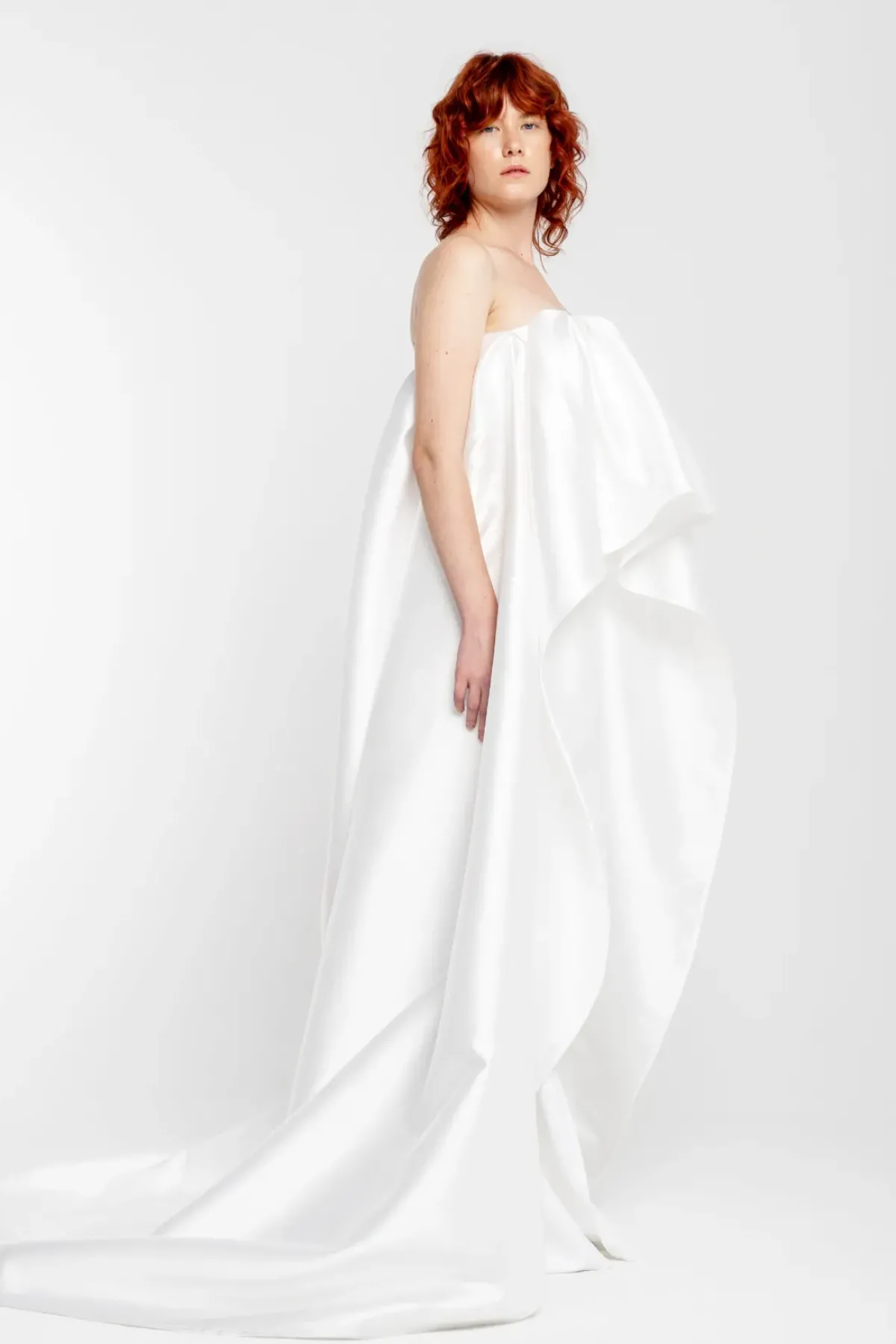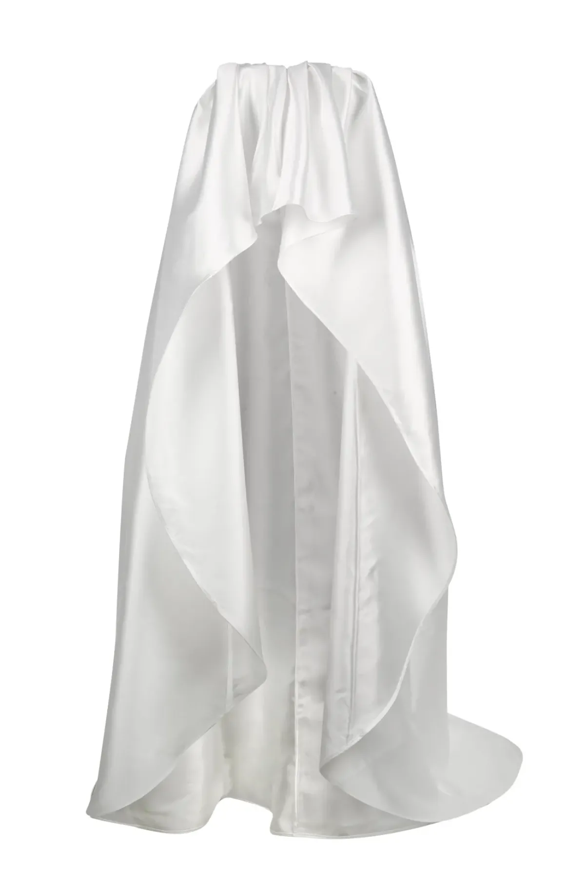 Elevate your bridal collection with this pleated, strapless top made from white mikado fabric. The front is cropped for a modern twist, while the back boasts an elegant train. Complete with a secure zipper closure, this top is a must-have for any bride-to-be!