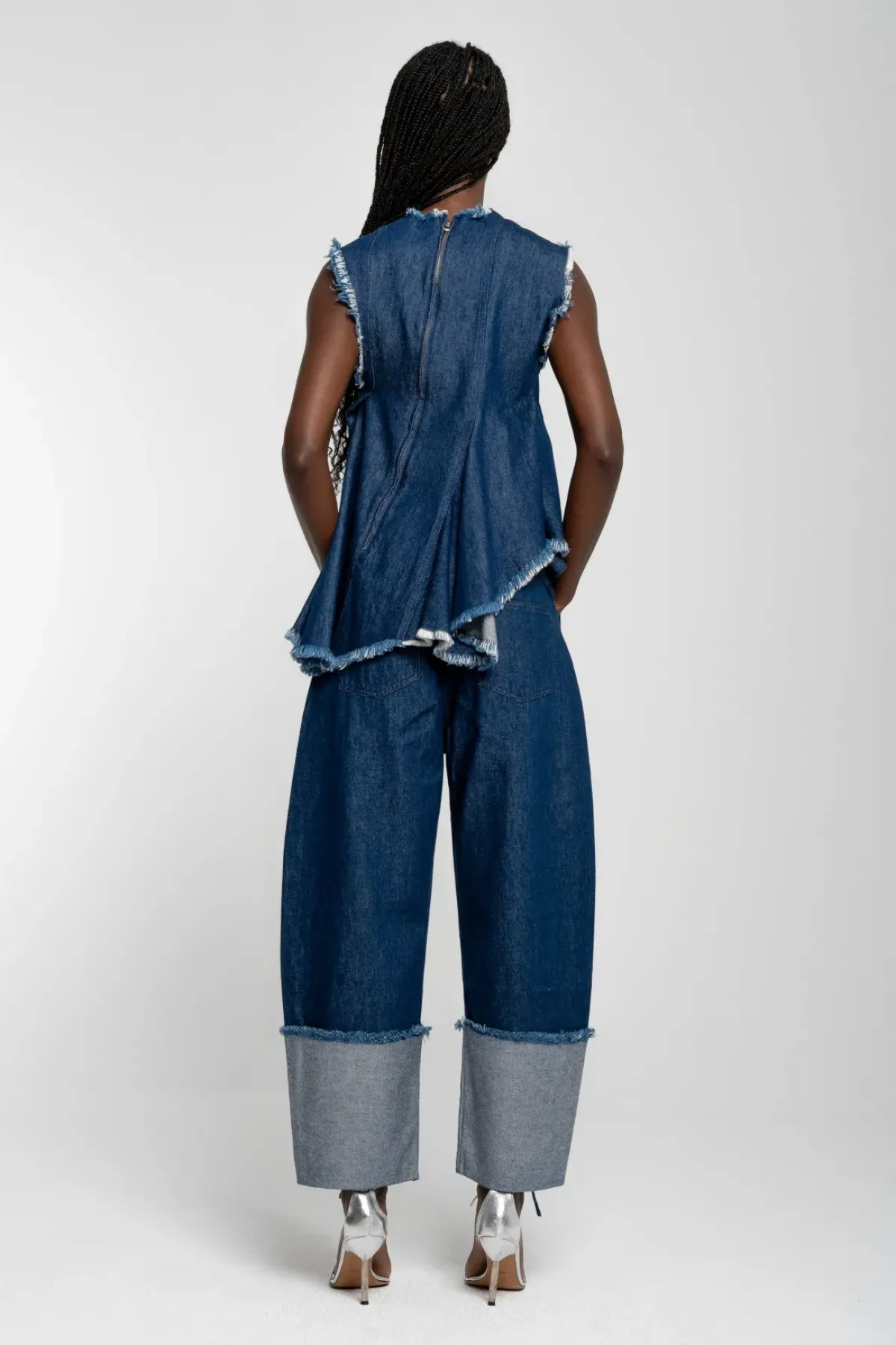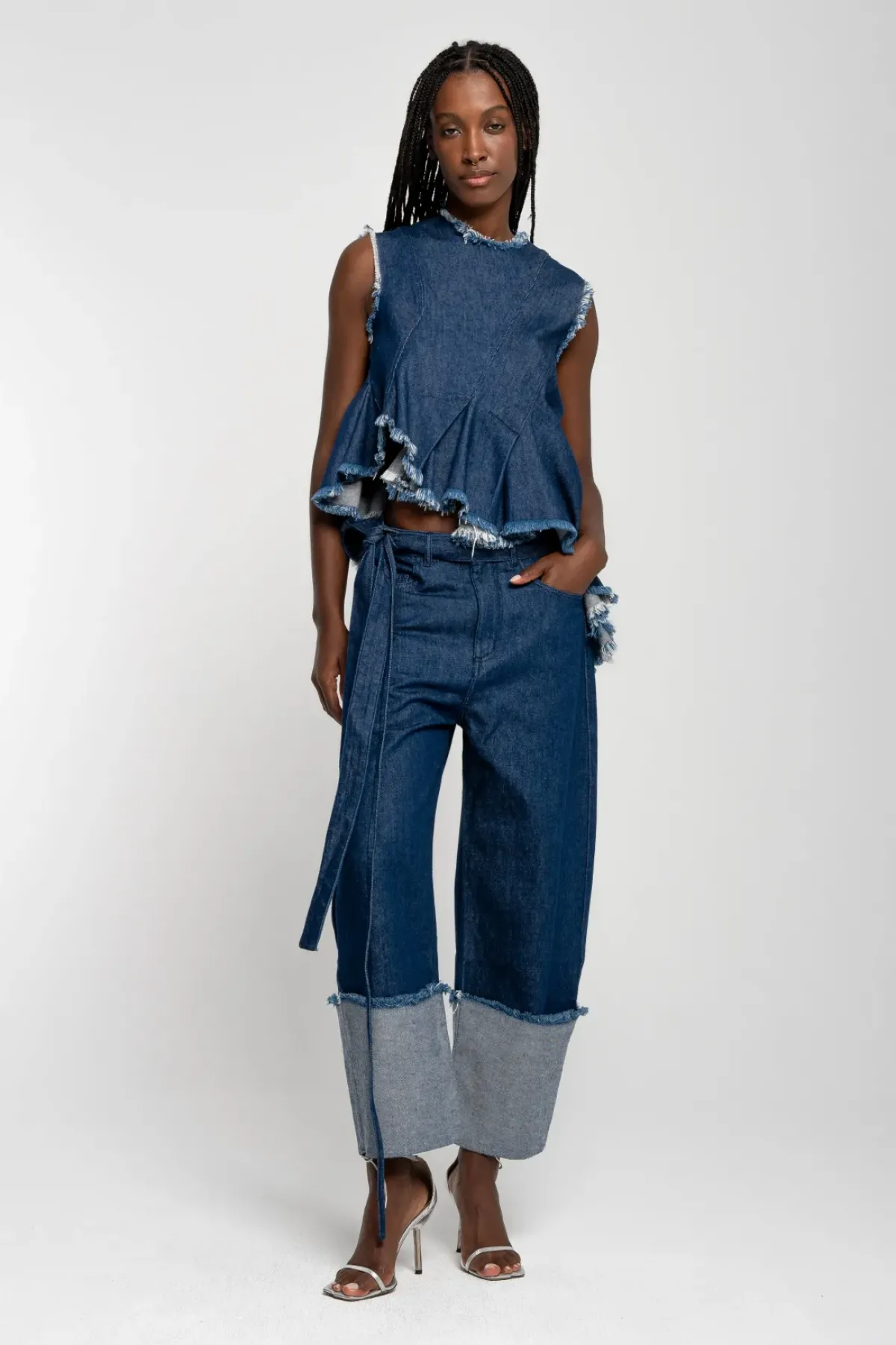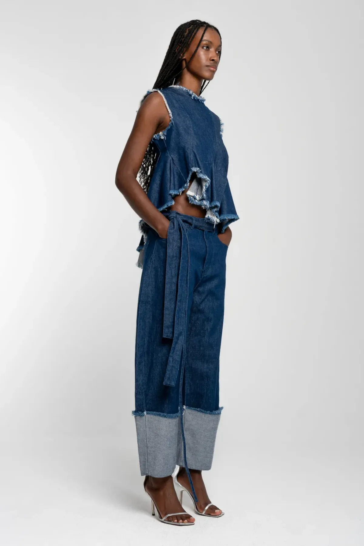 Boost your comfort level with these indigo trousers crafted from soft cotton. With a 5-pocket design and a flattering high waist, they feature a trendy roll up hem and wide-leg cut. Don't miss this must-have addition to your wardrobe, complete with included belts.