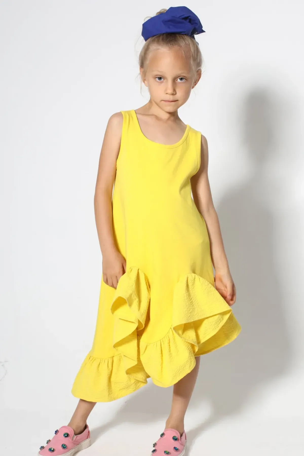 Dress up your kiddo in this U-neckline, sleeveless, mid-length dress featuring a fun bottom flounce!