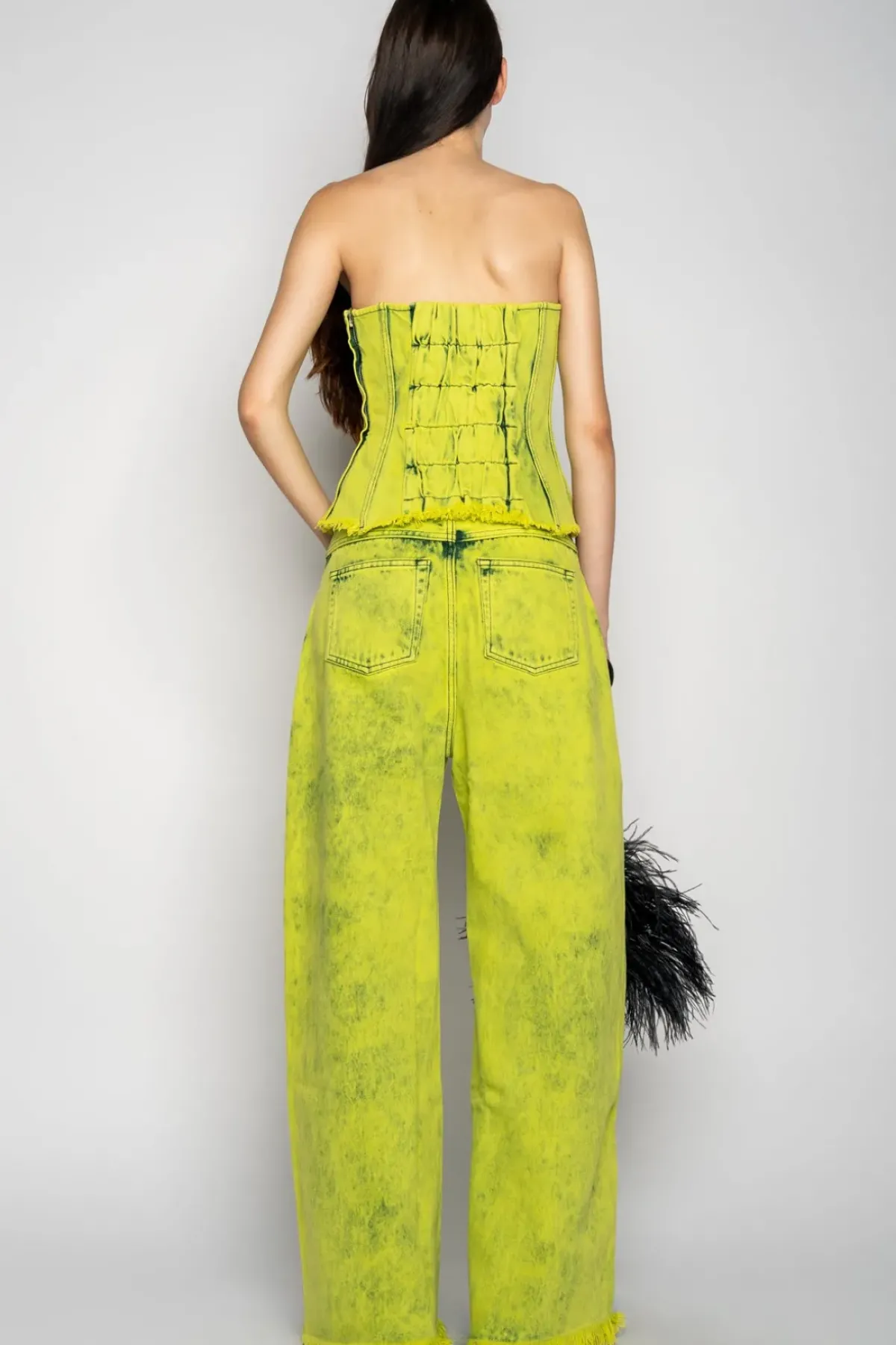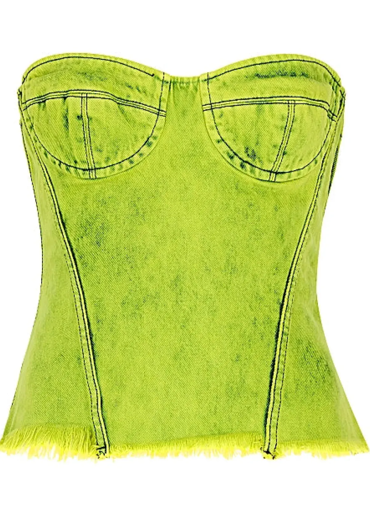 This lime-hued, acid wash denim corset delivers an alluring silhouette with boning and a side zip fastening. The elasticated back ensures a perfect fit with a pinch of stretch for ultimate comfort.