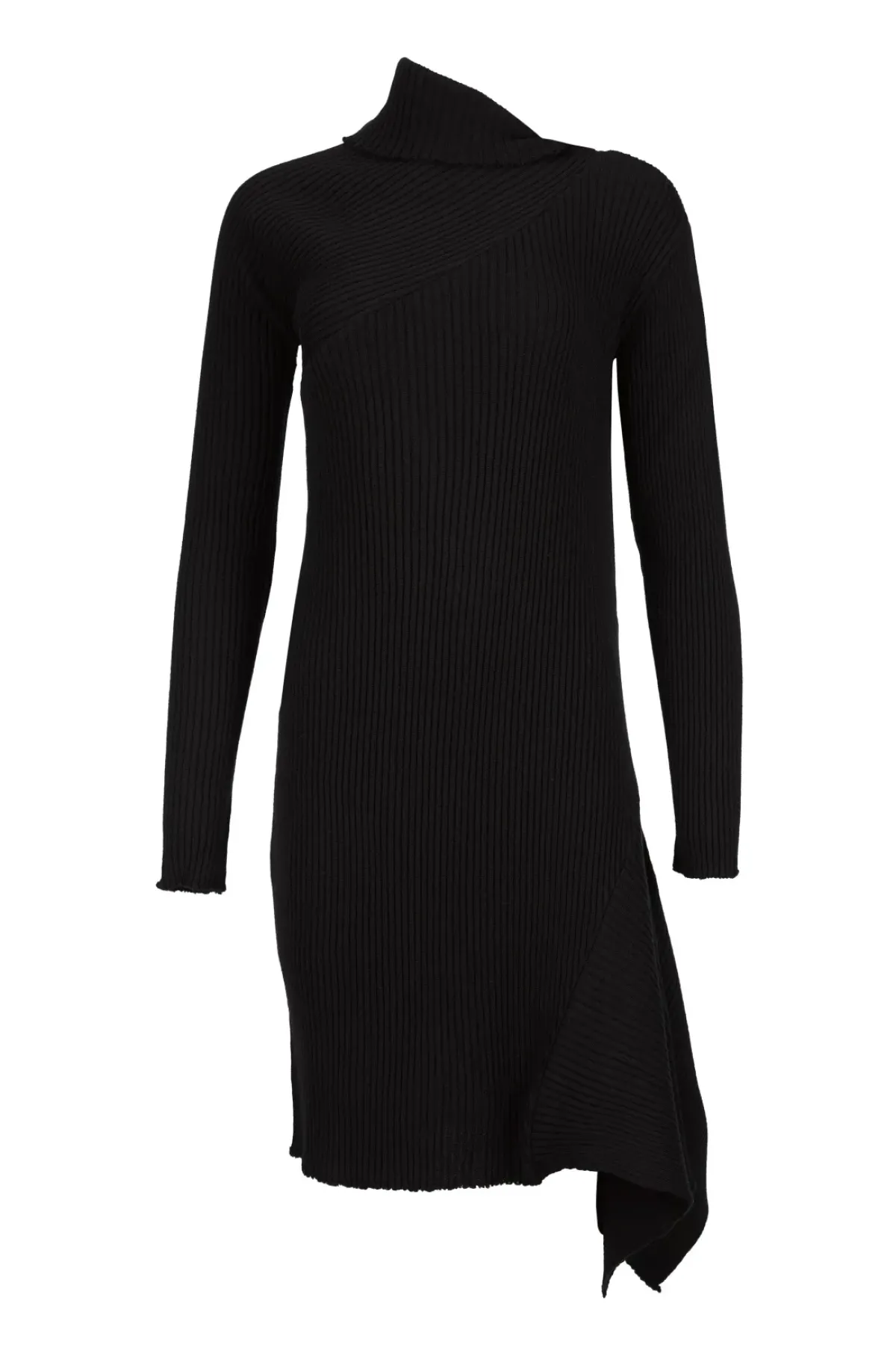 This black midi-dress crafted in merino wool boasts unfinished edges around its draped neckline, cuffs and asymmetric hemline.