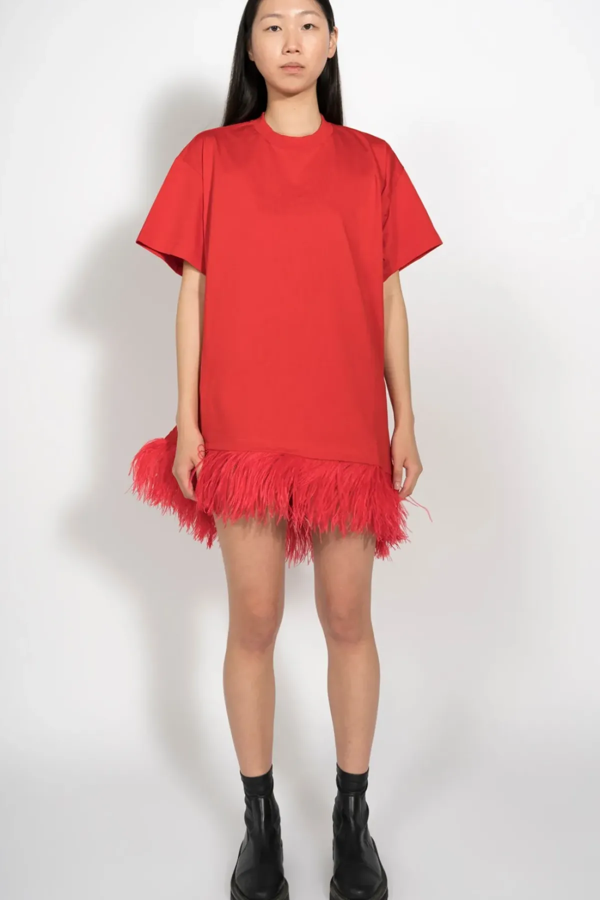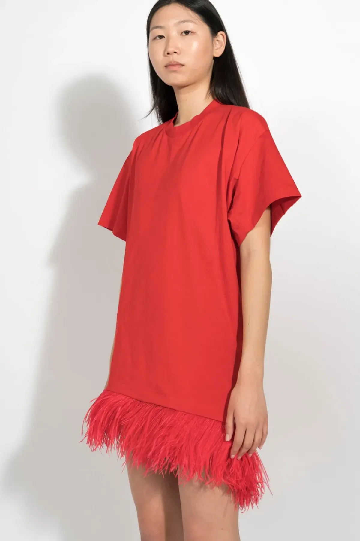 Introducing our red t-shirt – featuring short sleeves, a round neck and a feather hem, this oversized garment will exude confidence!