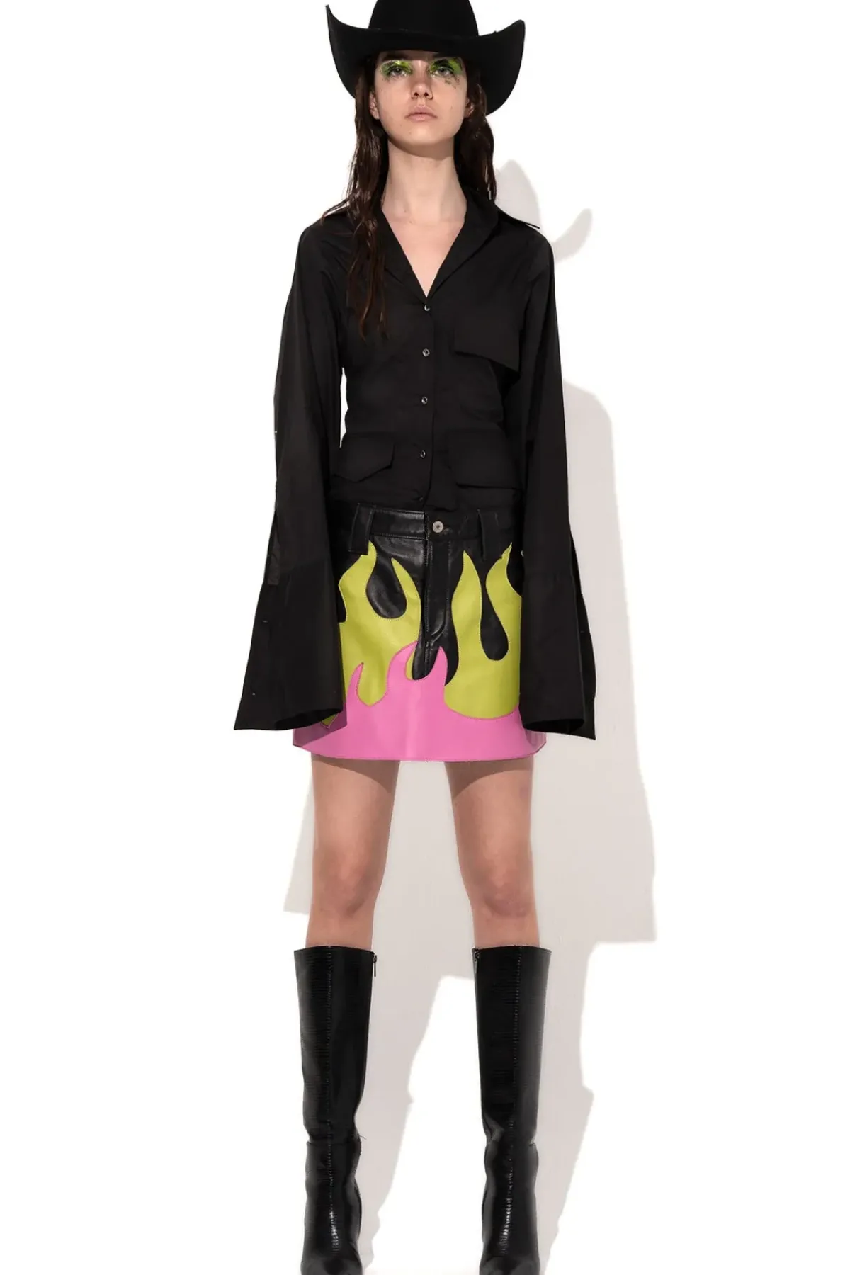 This leather mini skirt is adorned with contrasting pink and lime flame details. It is designed with a front zipper and two functional back pockets for added flair and practicality.
