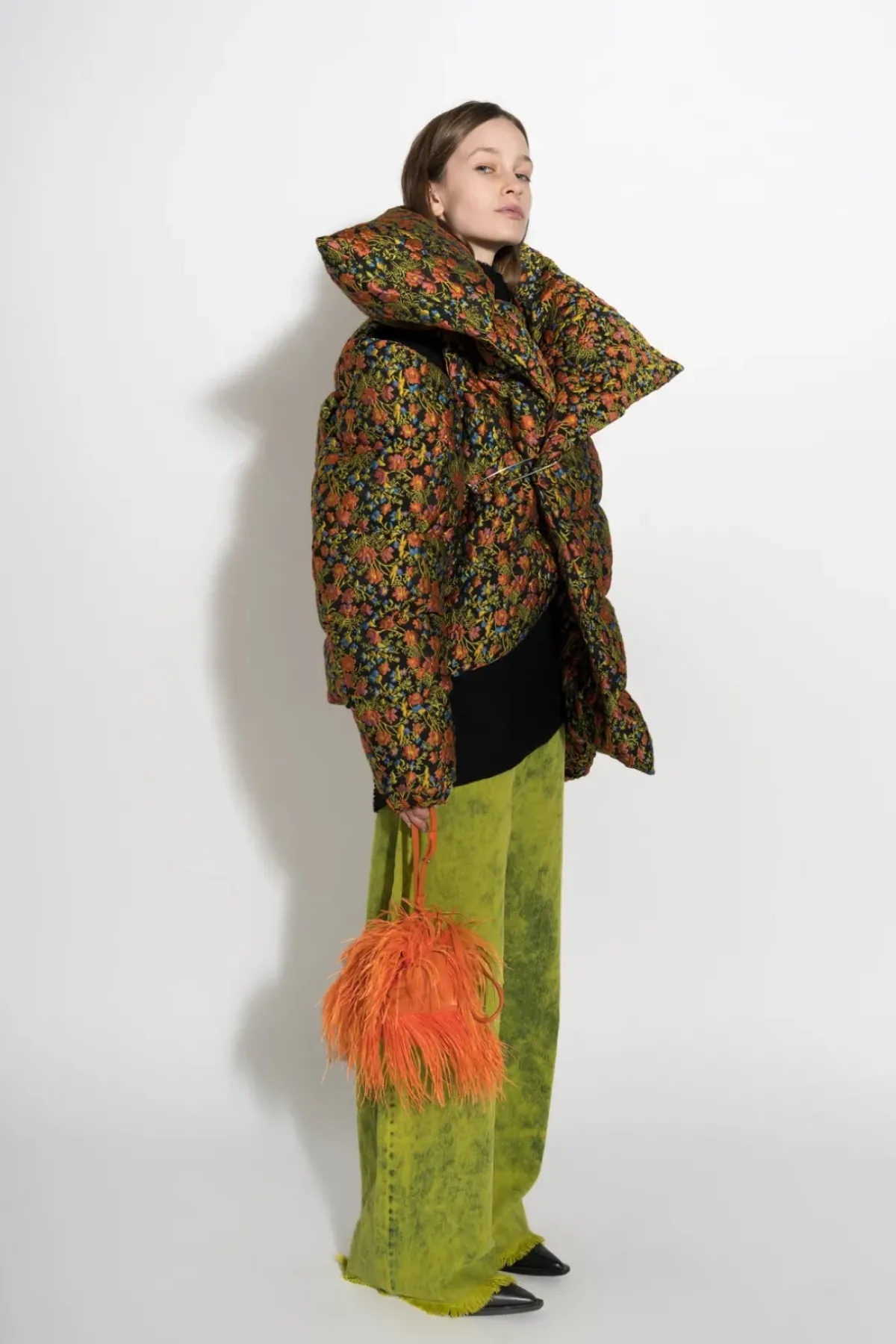 Crafted from floral brocade, this M'A puffer jacket boasts a unique pointed open collar and a sleek silver safety pin closure. The asymmetric hem adds an edgy touch, while the opening on the left shoulder enhances its uniqueness.