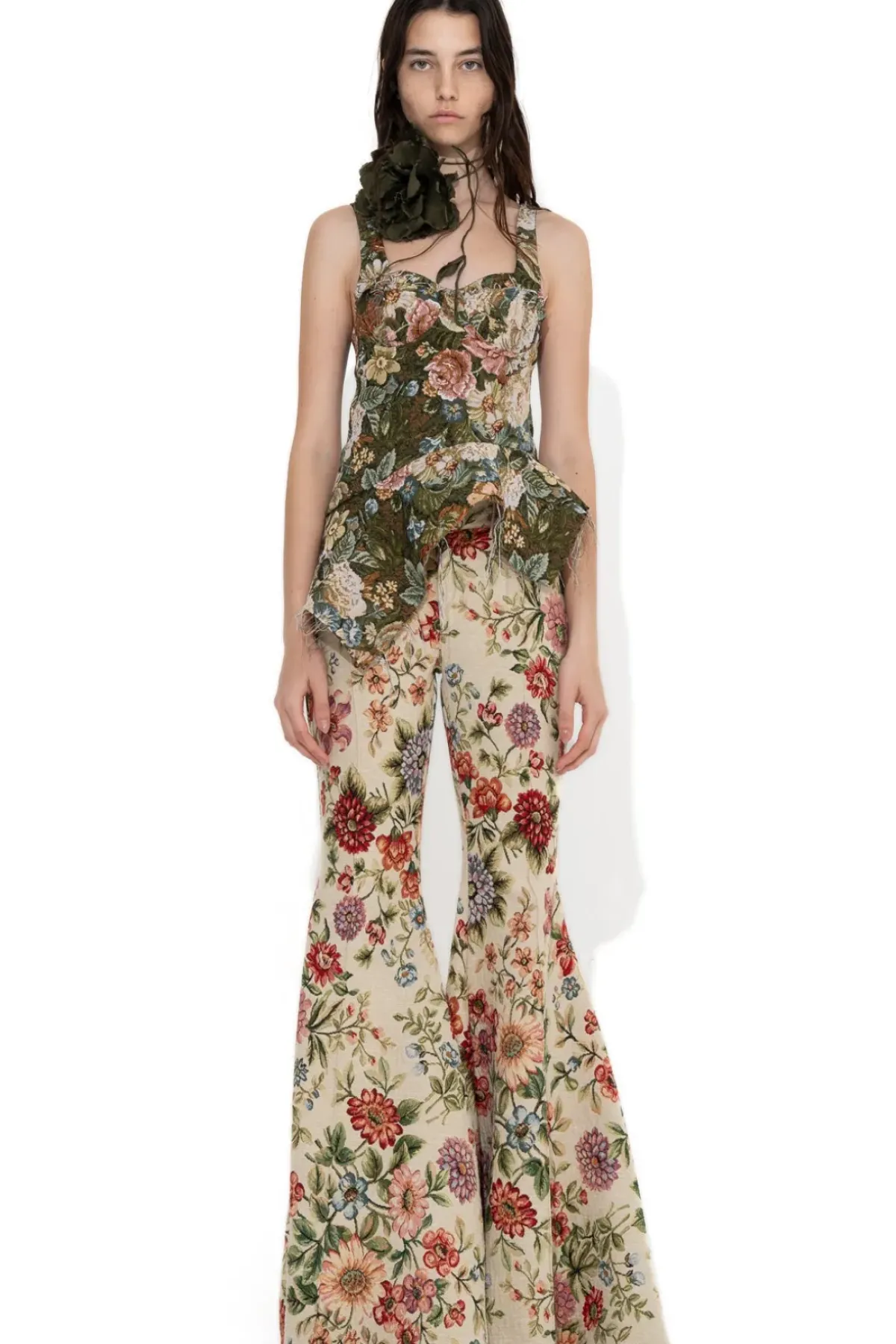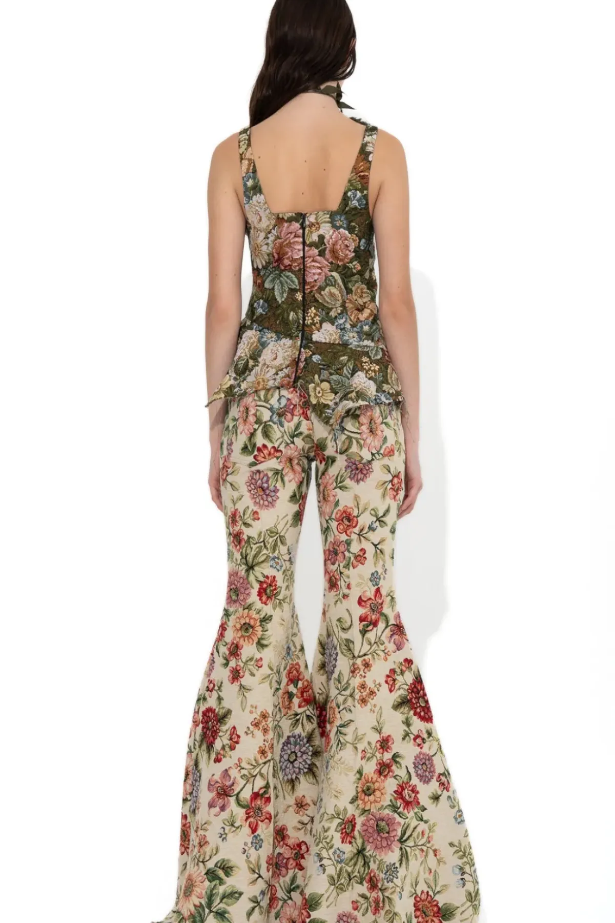 Transform your style with the floral brocade corset featuring a peplum hem, raw edging, built-in bra cups and back zipper.