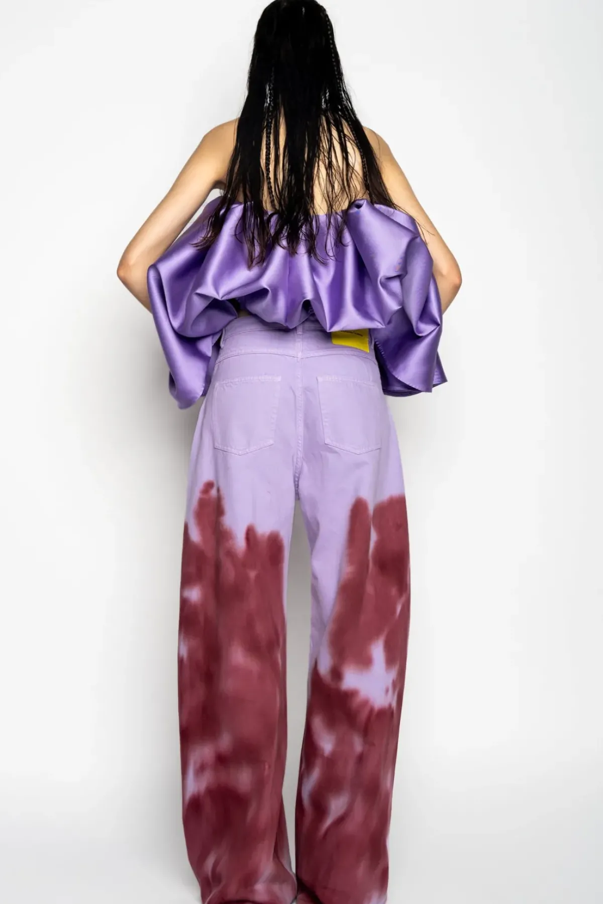 Be bold in our M'A 5-pocket boyfriend trousers in lilac and burgundy tie-dye drill. These wide-leg trousers flaunt a comfortable fit with a high waist, as well as a raw hem.