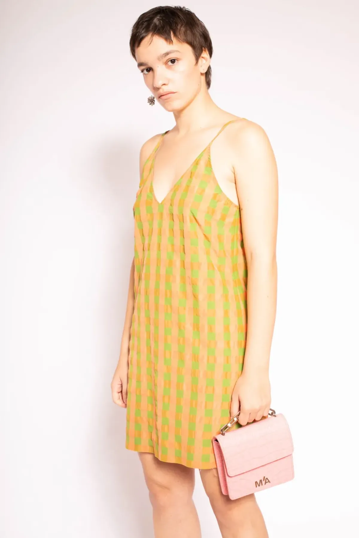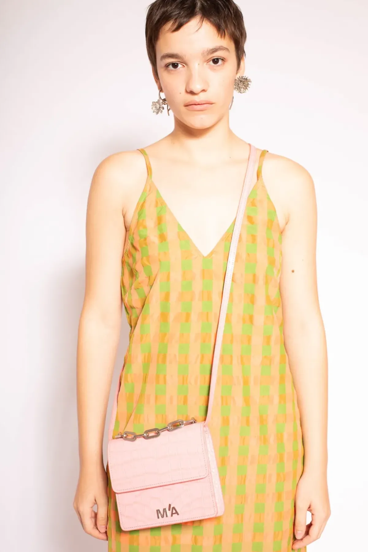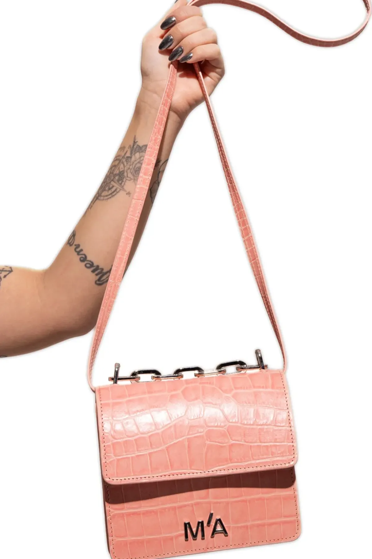 Mini bag in a croc-embossed pink leather with a long cross body strap, a gleaming chain detail handle and a silver M'A logo.