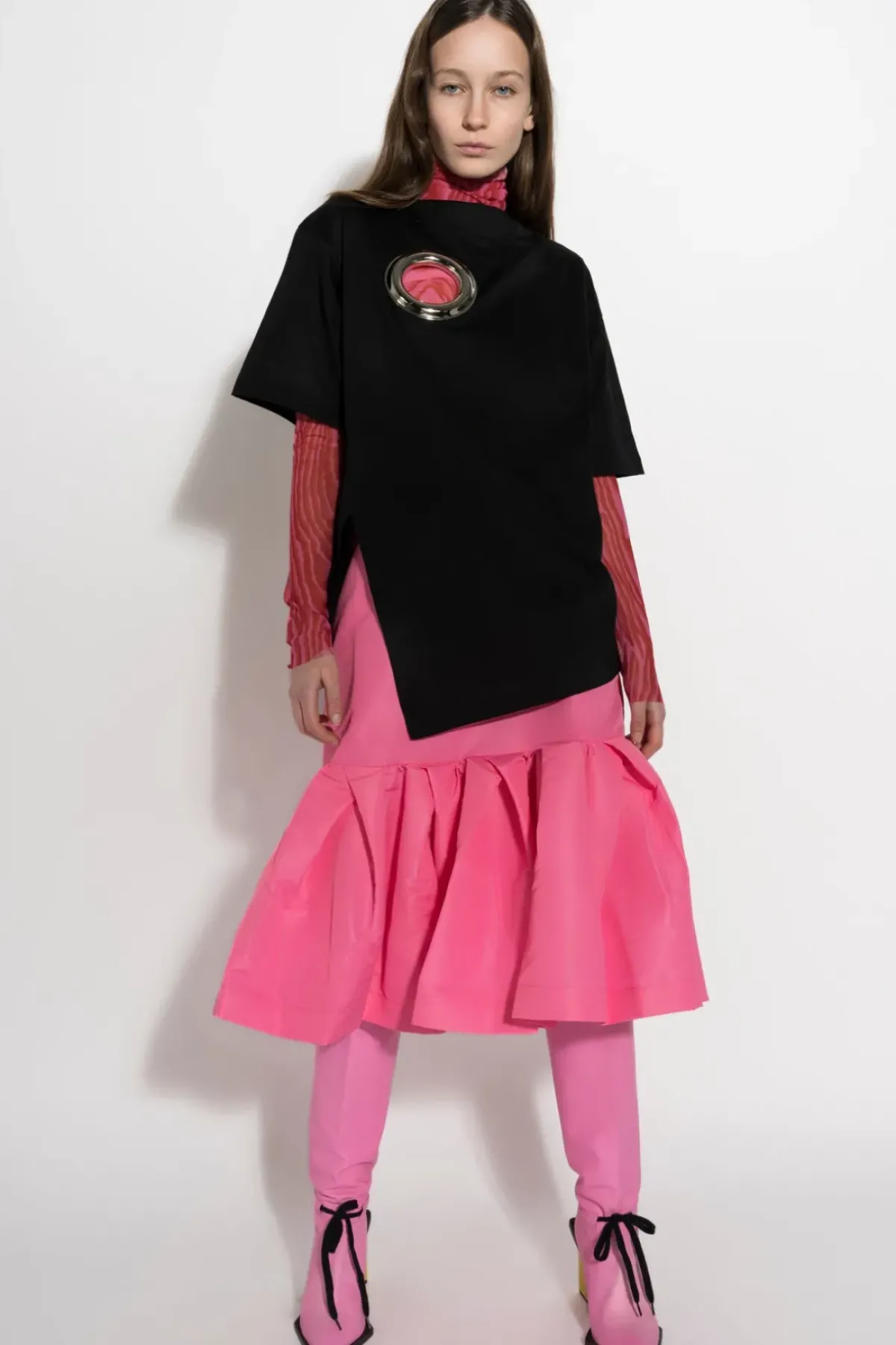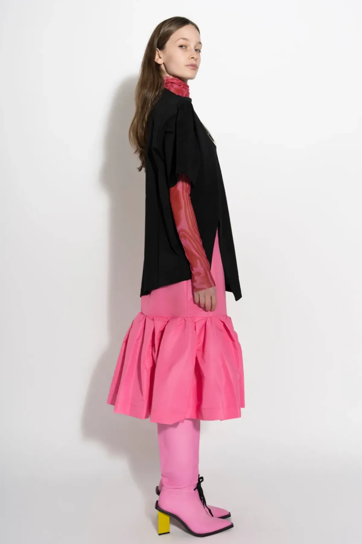 This pink taffeta skirt fits snugly and flaunts ruffles at the hem for an unforgettable look.
