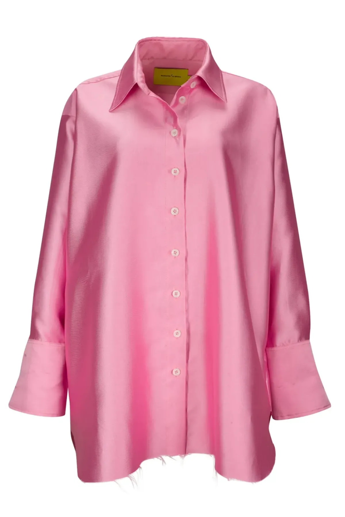 This pink mikado overshirt with long sleeves, button-up front, raw hem and oversized fit, it's a must-have for any stylish individual.