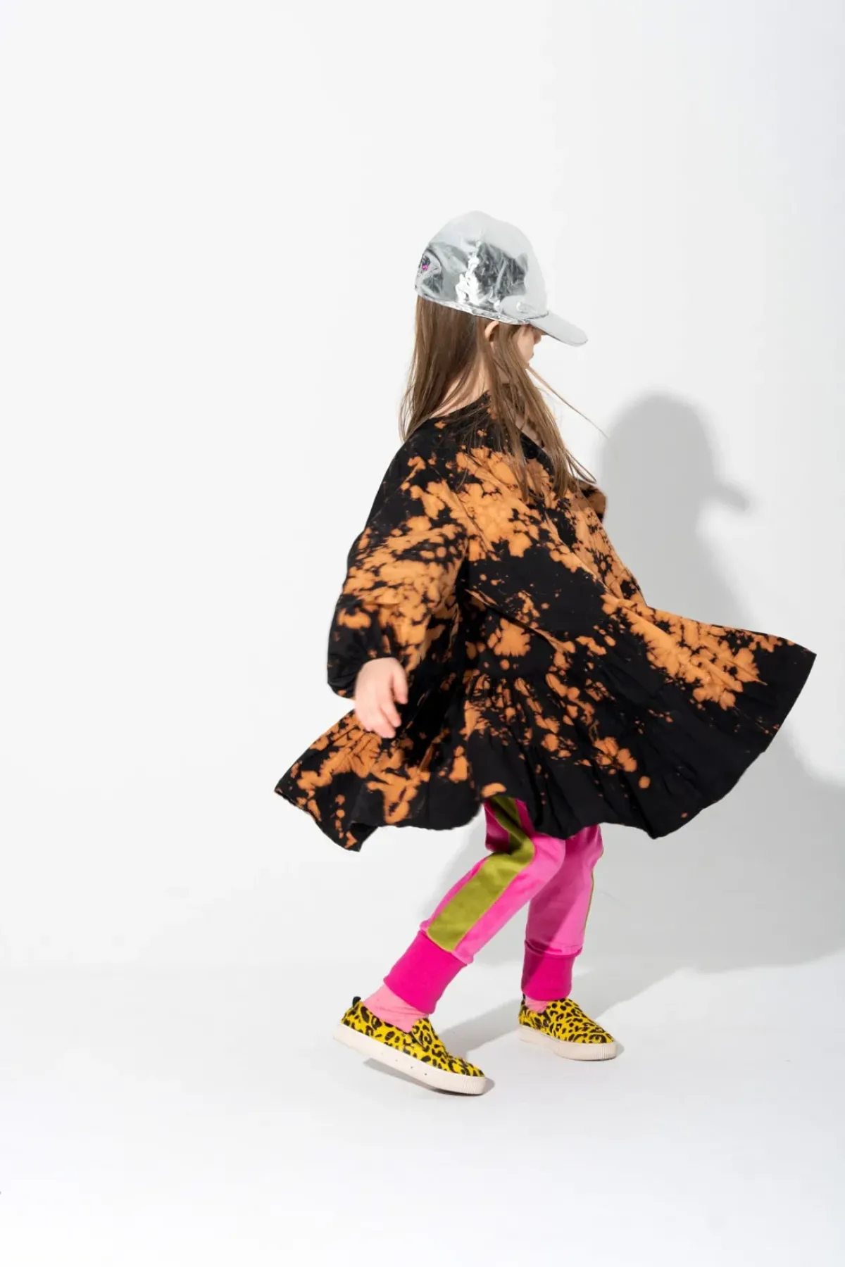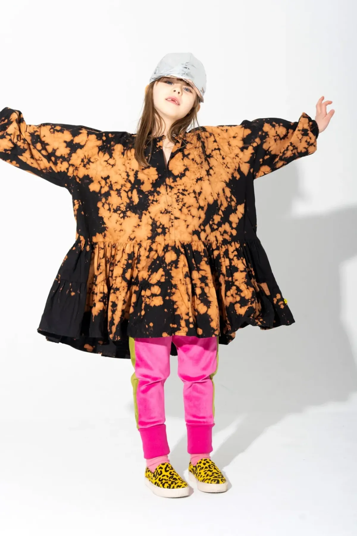 This dress will splatter your kid's style with an orange and black spatter-dye of shirting that's gathered in all the right places. The long sleeves and the V neckline – perfection!