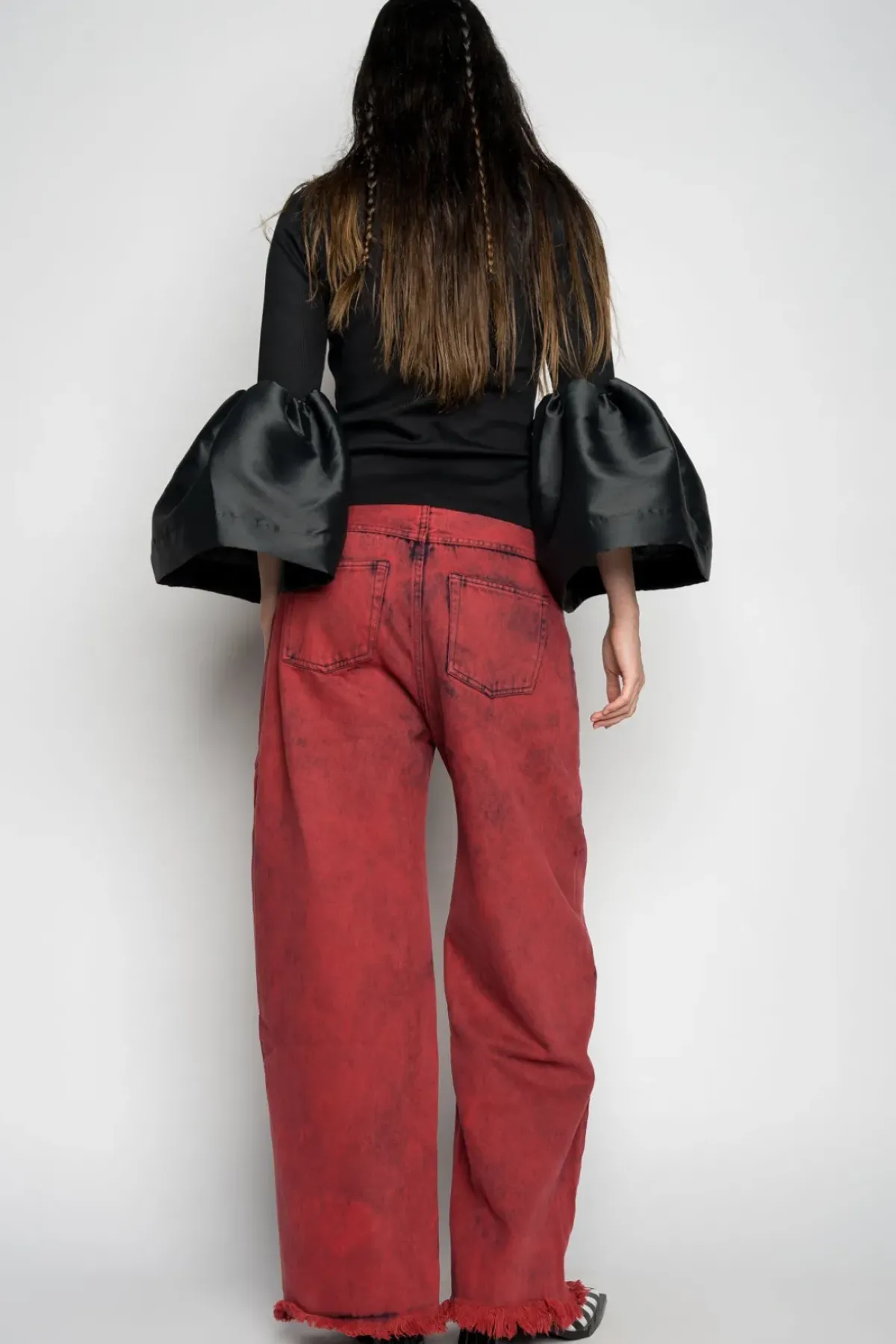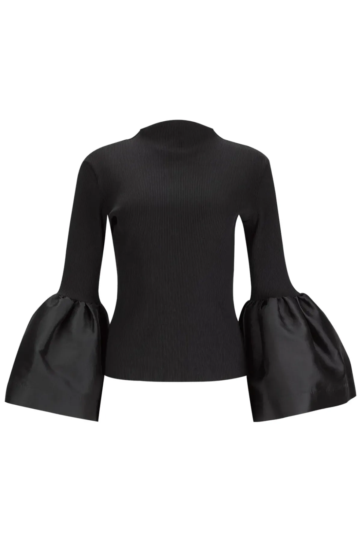 This sleek black top makes a statement with its high neck and mikado puff sleeves!