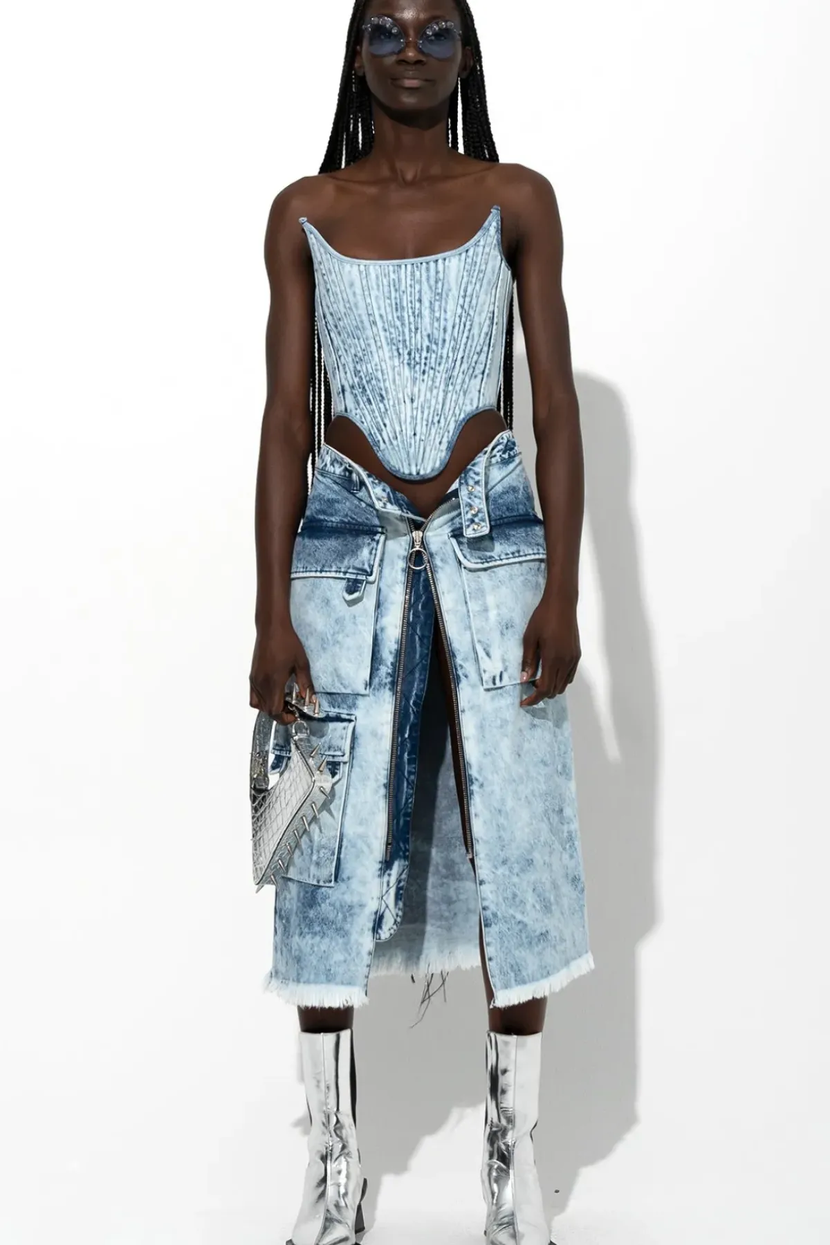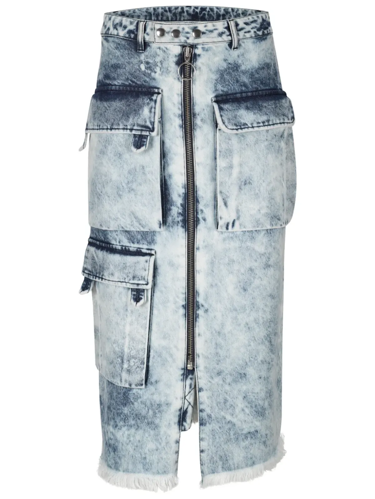 This acid wash denim midi skirt features multiple pockets, raw hem and a front zip fastening for an effortlessly cool look.