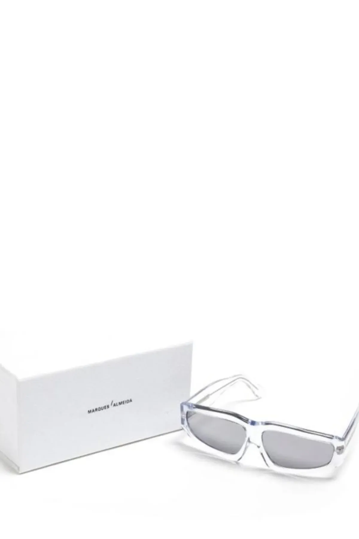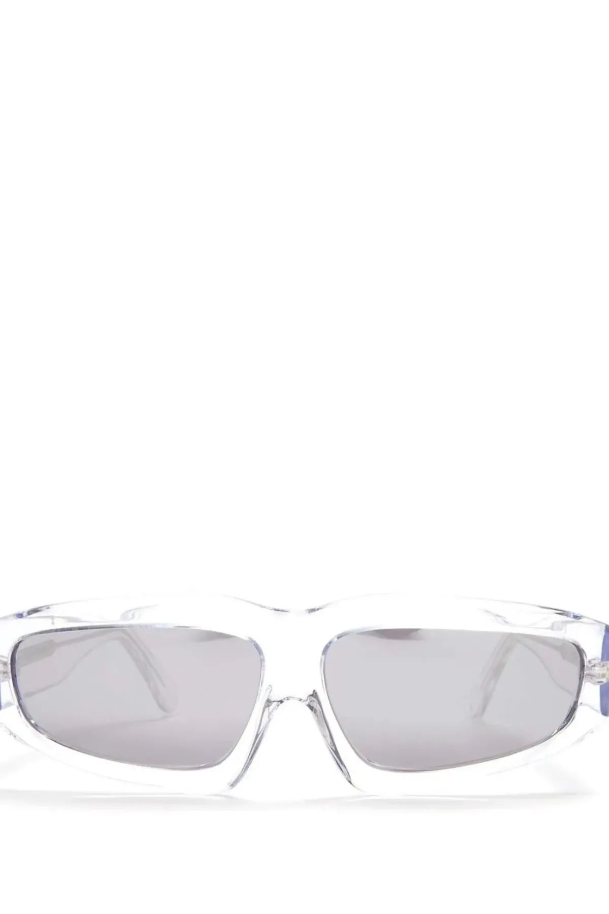 Angular sunnies, emboldened with a transparent frame, grey-mirrored lenses, and the silver debossed logo on the arms.