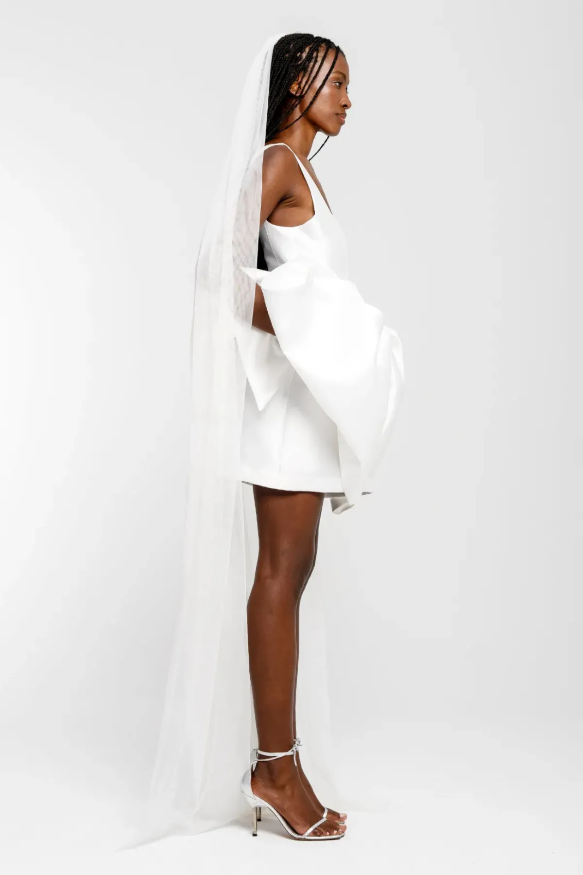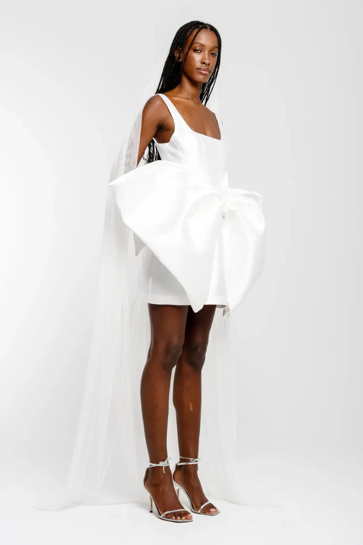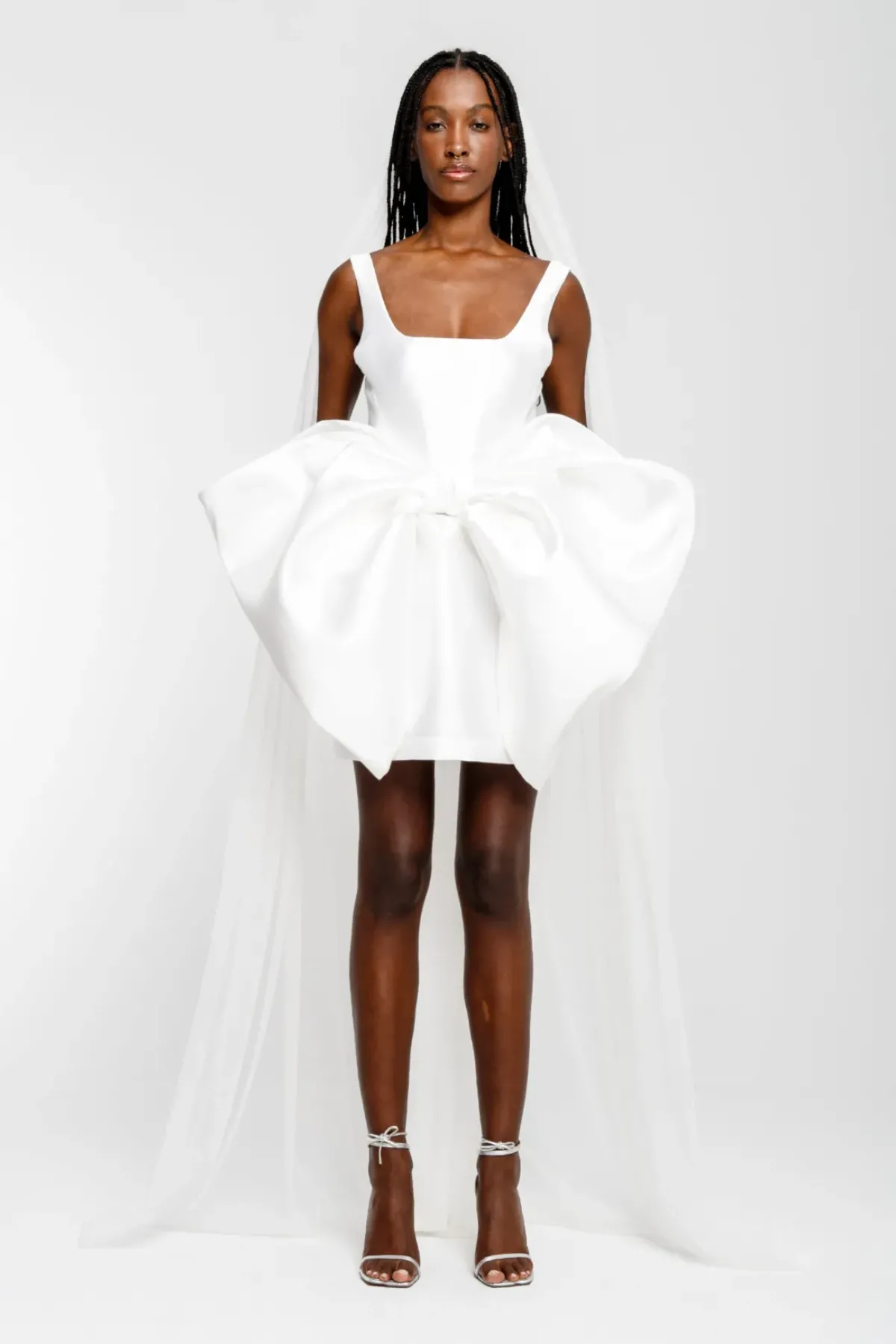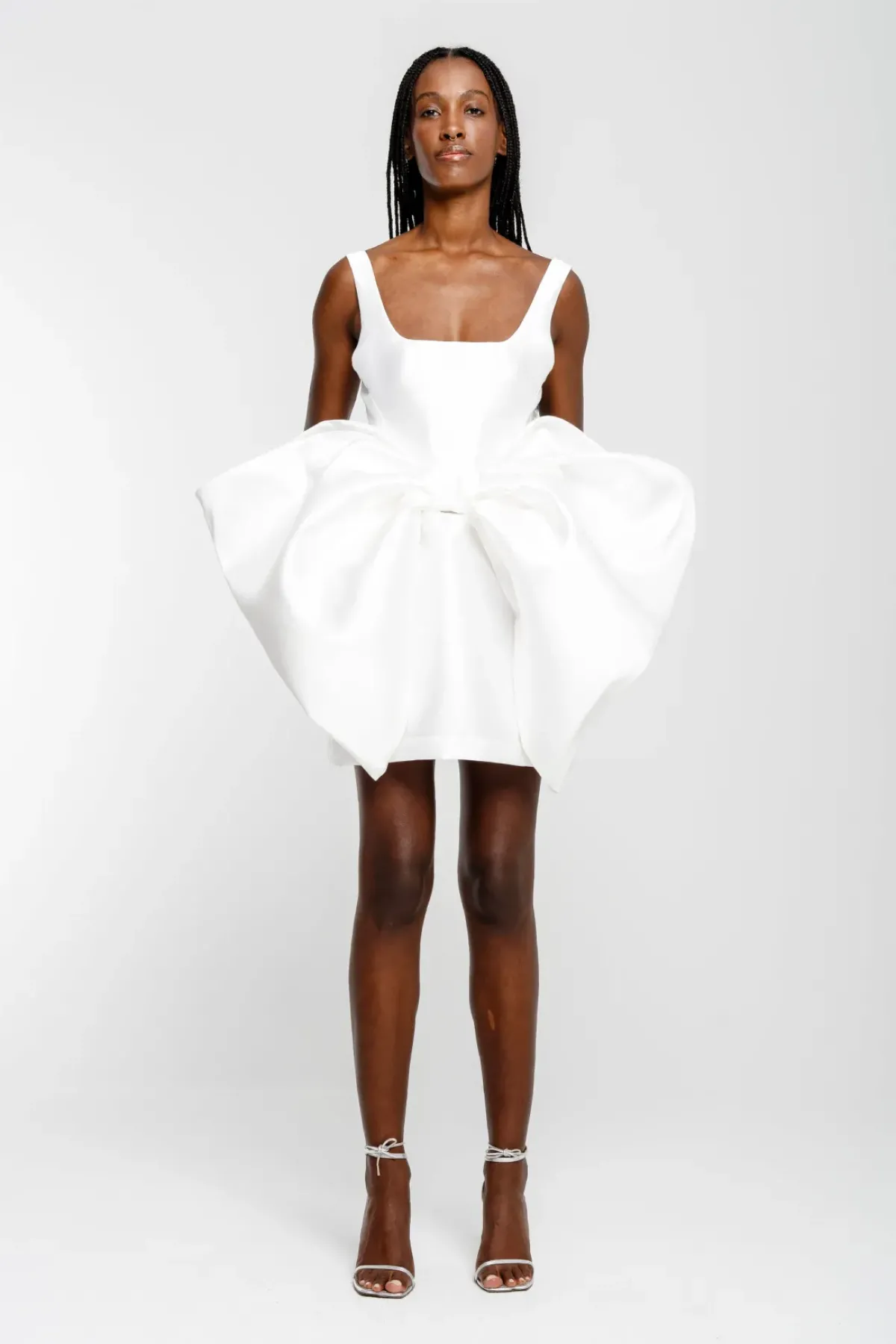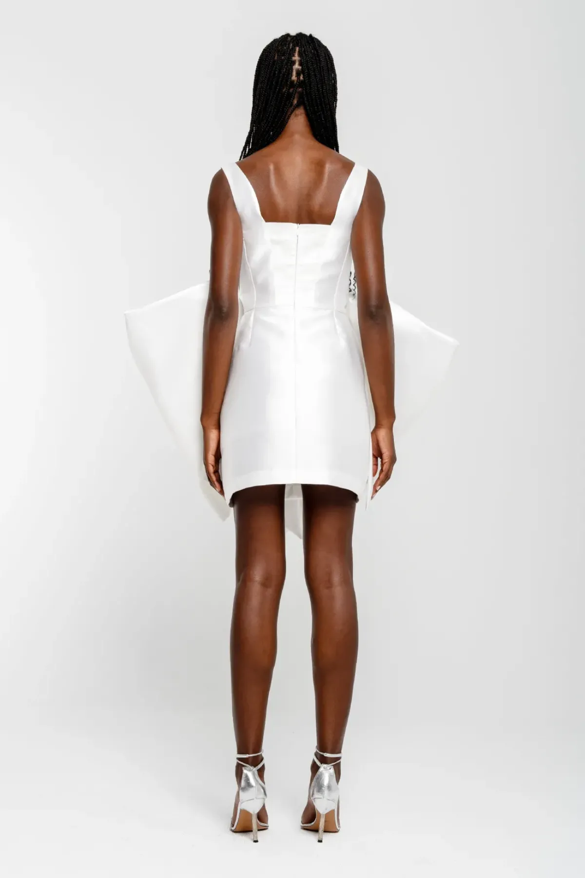 Introducing the White Big Bow Mini Dress from our bridal collection! Made with white mikado, this dress features a U-neckline and thick straps for a trendy and timeless look. The fitted design is accentuated by a big bow on the front, adding a touch of elegance to your overall look.