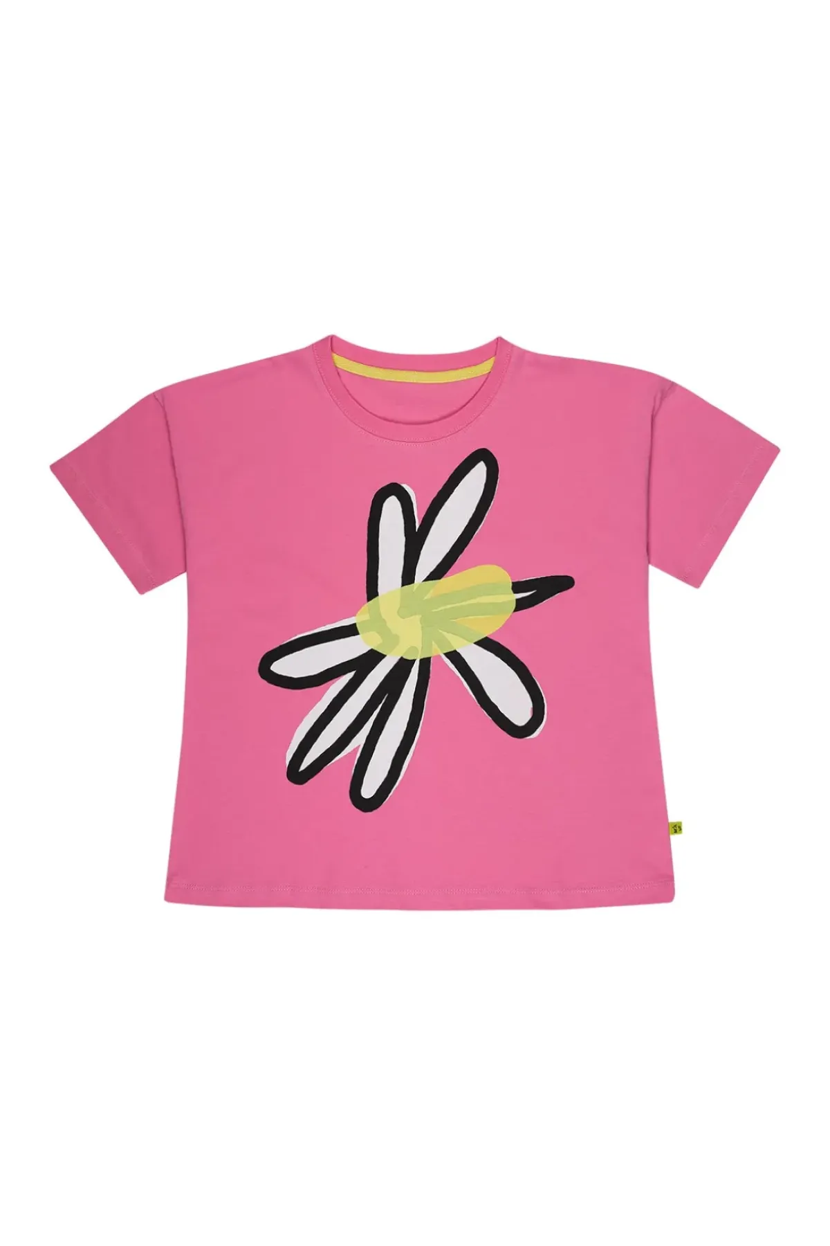 Made with soft pink jersey, this top boasts a comfy fit with short sleeves and a round neck for maximum comfort. Perfect for your little flower child, this shirt is sure to brighten up any outfit and make them the talk of the playground.