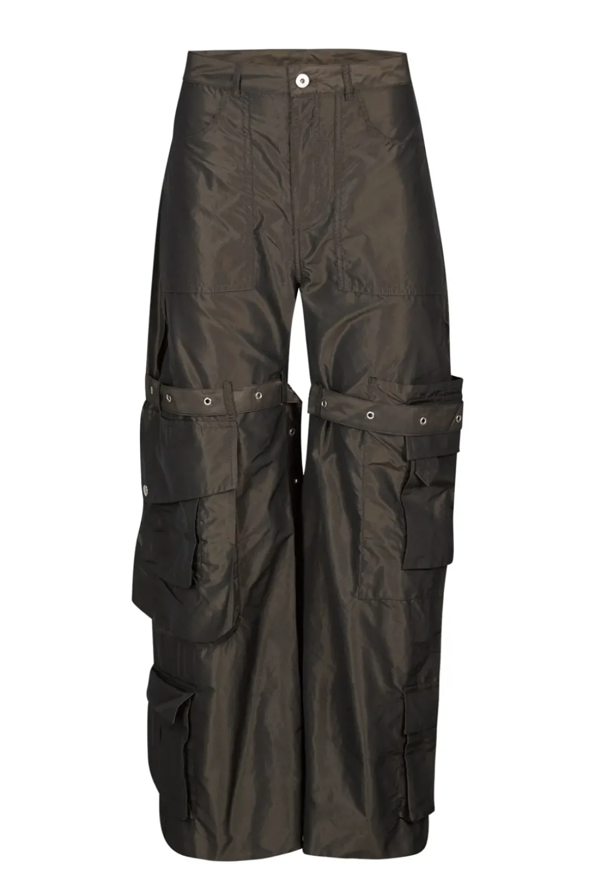 Multipocket boyfriend cargo trousers in dark brown taffeta. These raw hem wide-leg trousers have a relaxed fit with a dropped waist and rise.