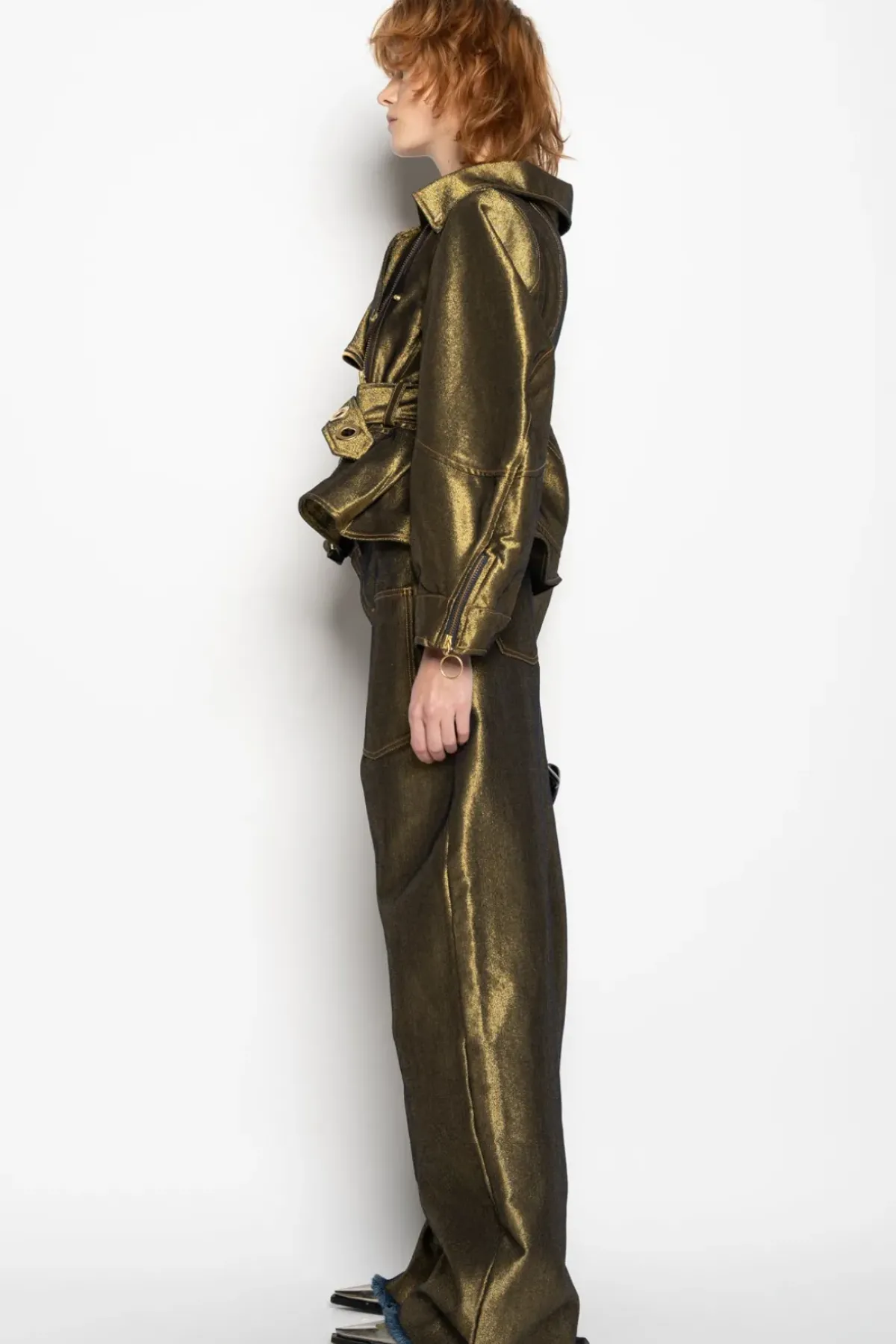 Gold lurex denim boyfriend trousers, flattering high-waist fit, front patch pockets, raw-hems and wide-leg design, these jeans are a must-have for any wardrobe.