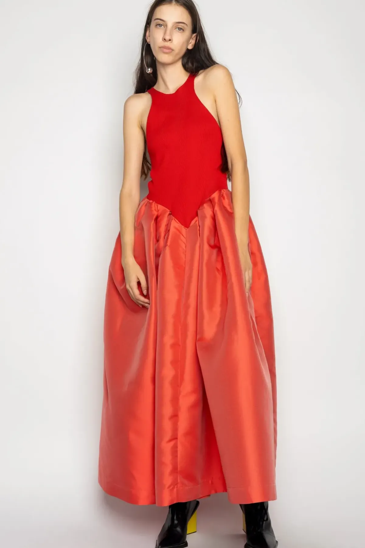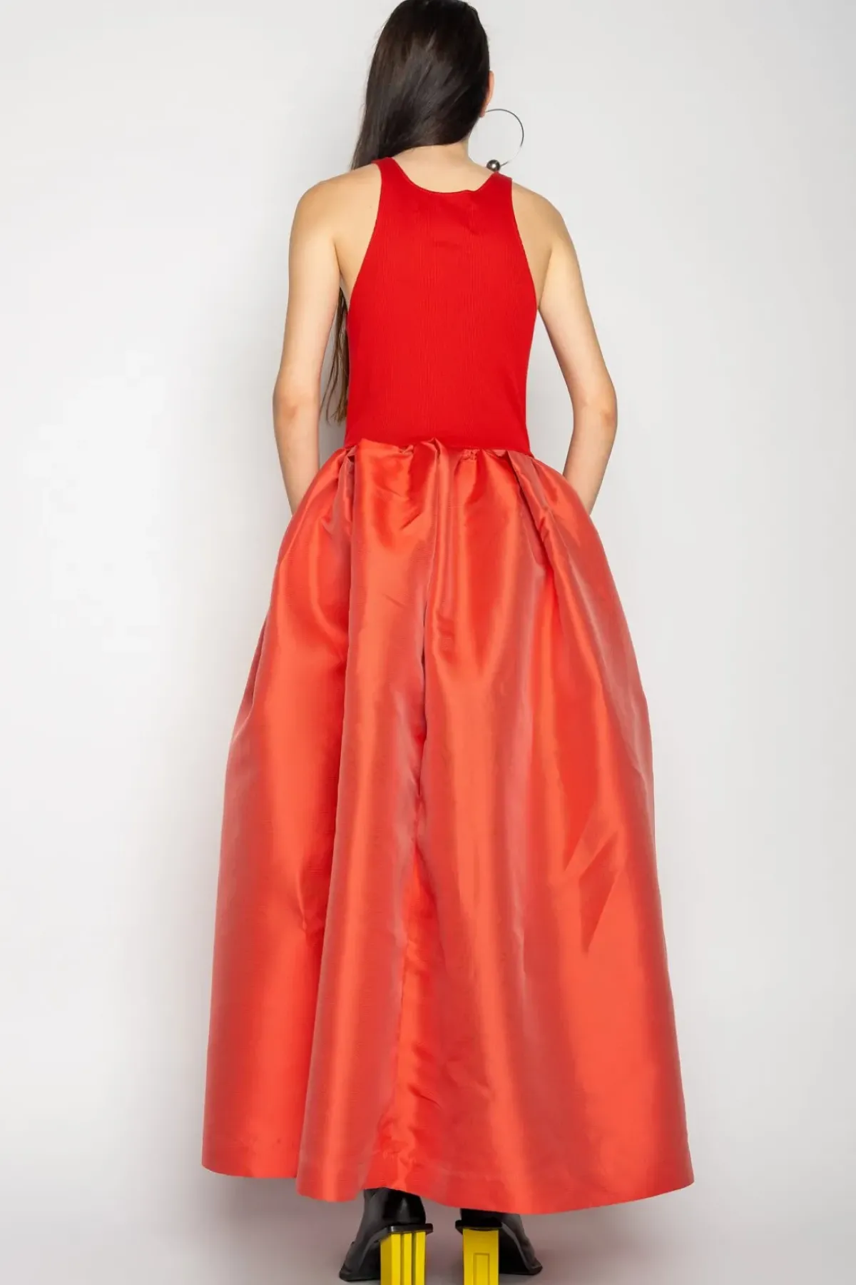 This amazing dress captivates with a vibrant red tank top and rib jersey, paired with a lovely red puff long skirt! Experience luxury & comfort like never before!