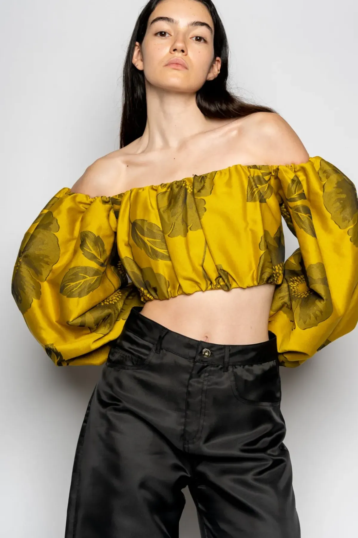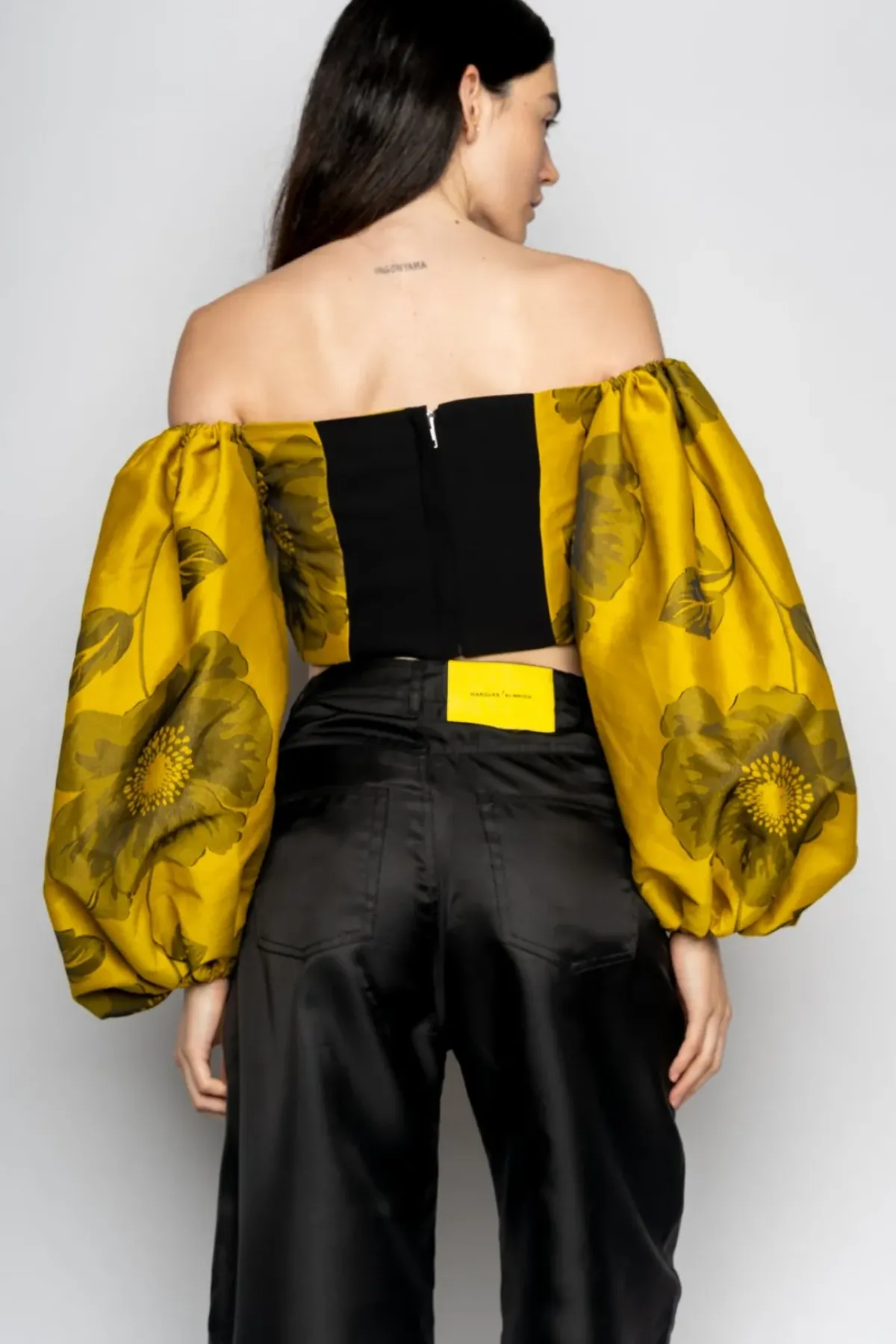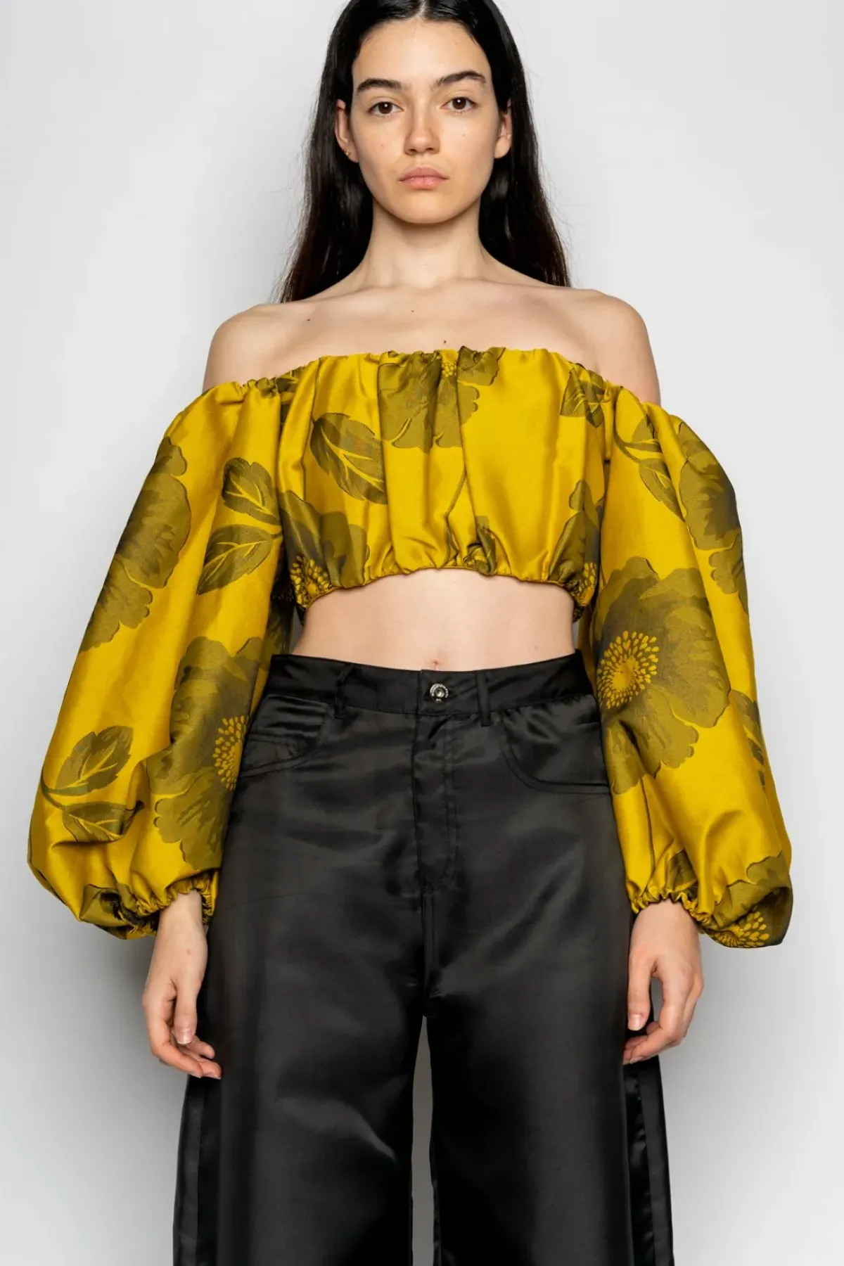This mustard floral jacquard off-shoulder top features puff sleeves, an elasticated back and a detachable back zipper, providing a flattering look.