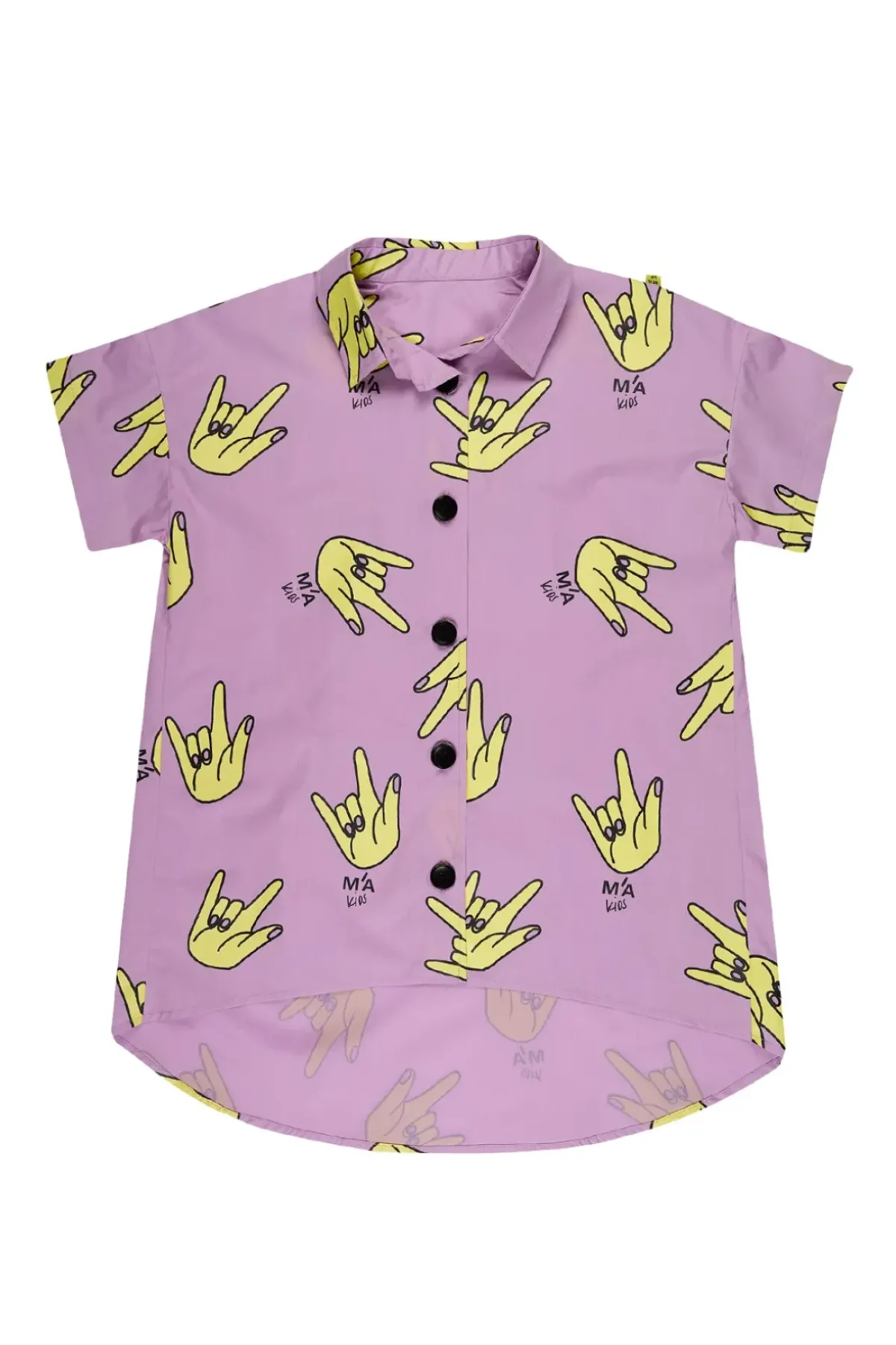 Oversized shirt in lilac with all-over hands printed shirting with short sleeves, pleated back and front buttons. Get hands-on fashion for kids. This shirt is as comfy as it is cool, perfect for their daily adventures!