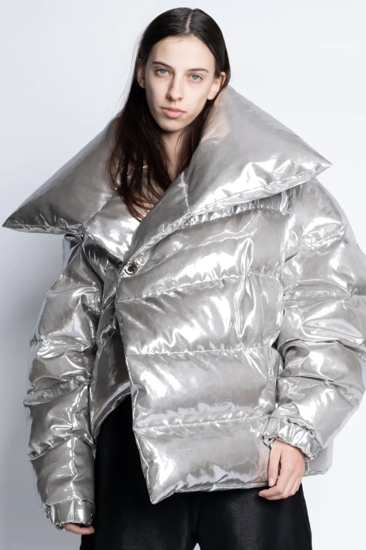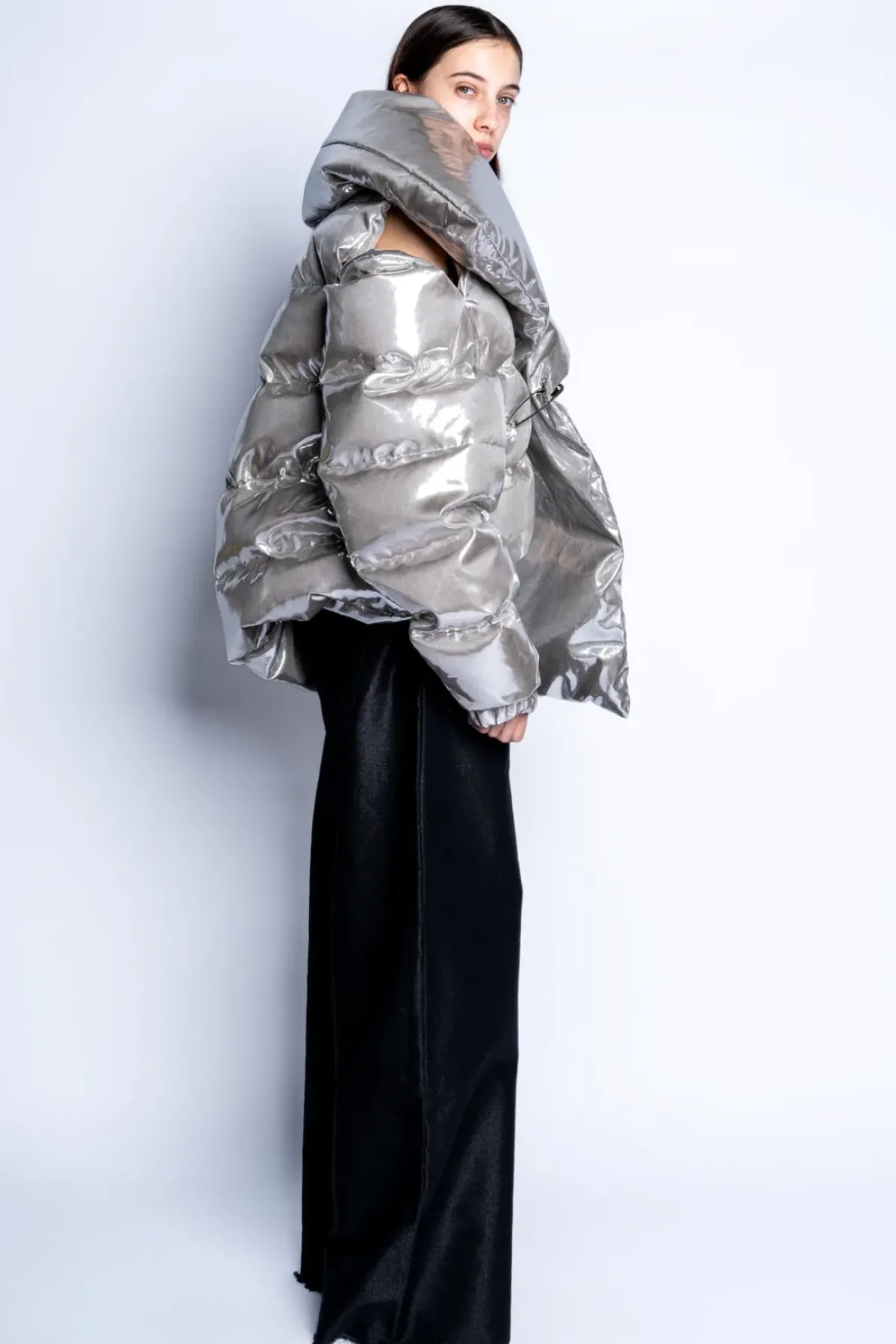 Classic M'A Puffa Jacket in silver – flaunt this pointed open-collar silhouette, secured by a silver safety pin closure. Boasting an asymmetric hem and an opening on the left shoulder, this jacket is a must-have in your wardrobe.