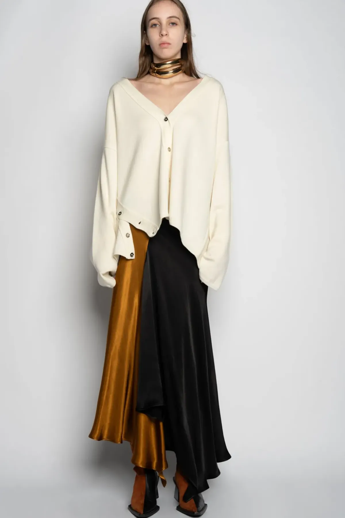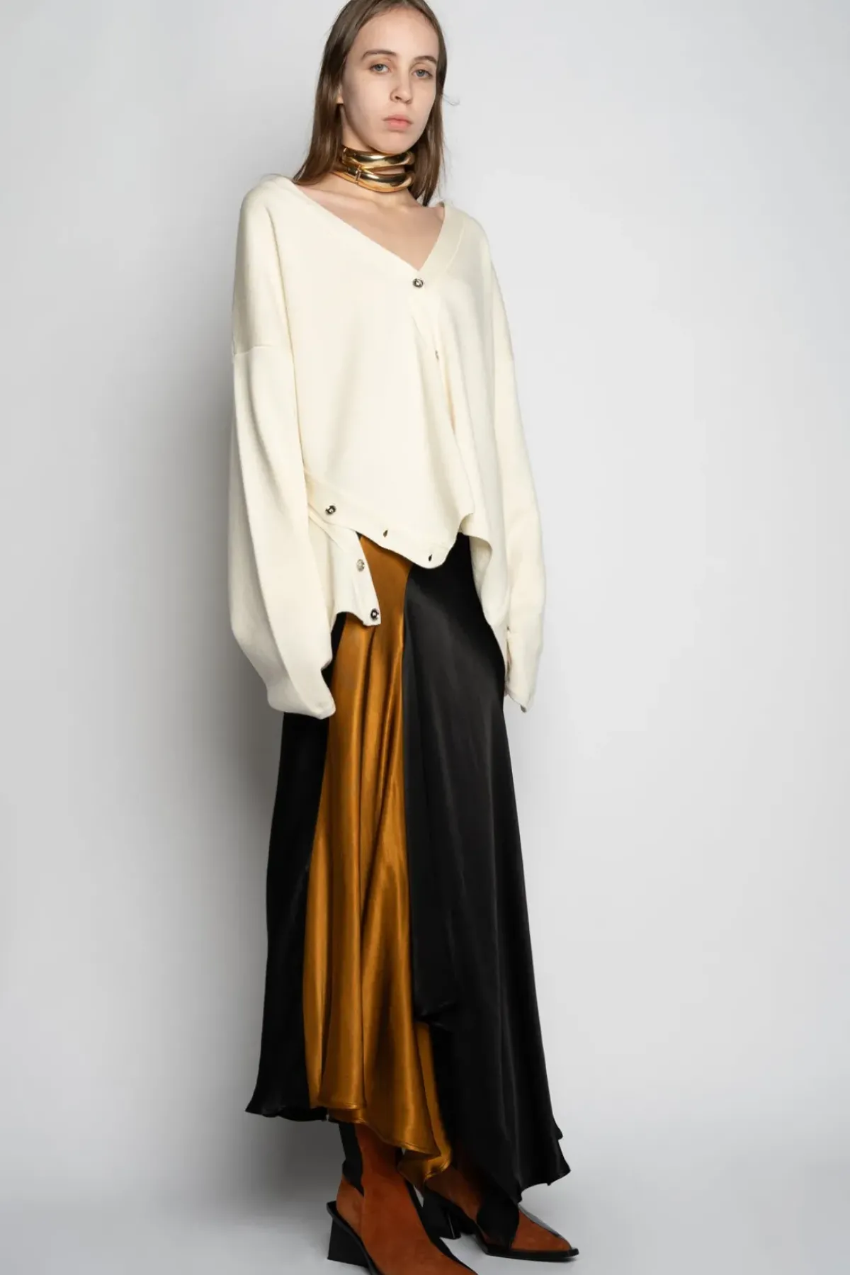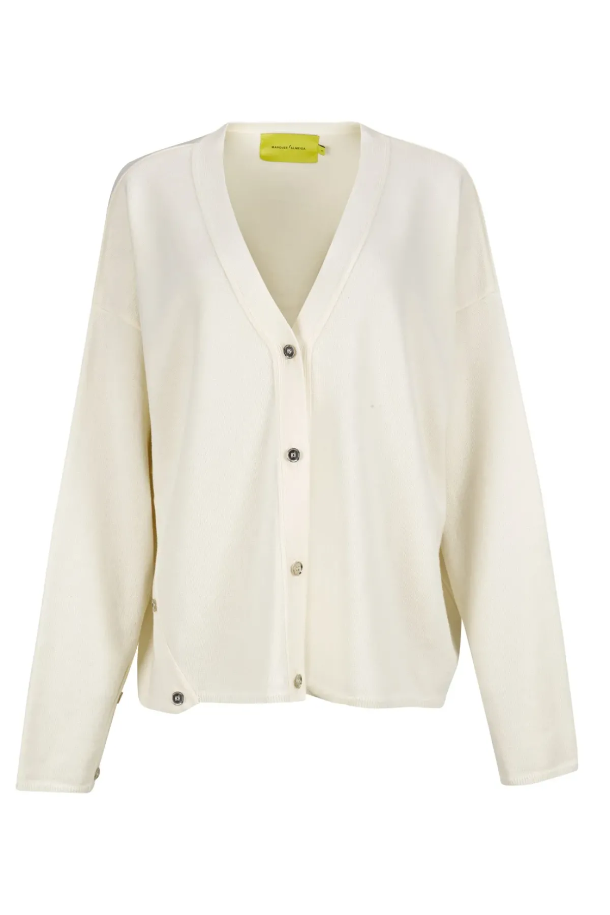 Crafted from a supple merino fabric, this off-white cardigan boasts a unique deconstructed design fastened with asymmetrical front buttons for an effortlessly chic silhouette. It also features a v-neck for added flair.