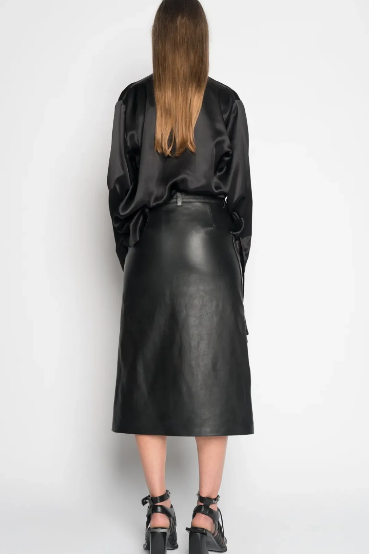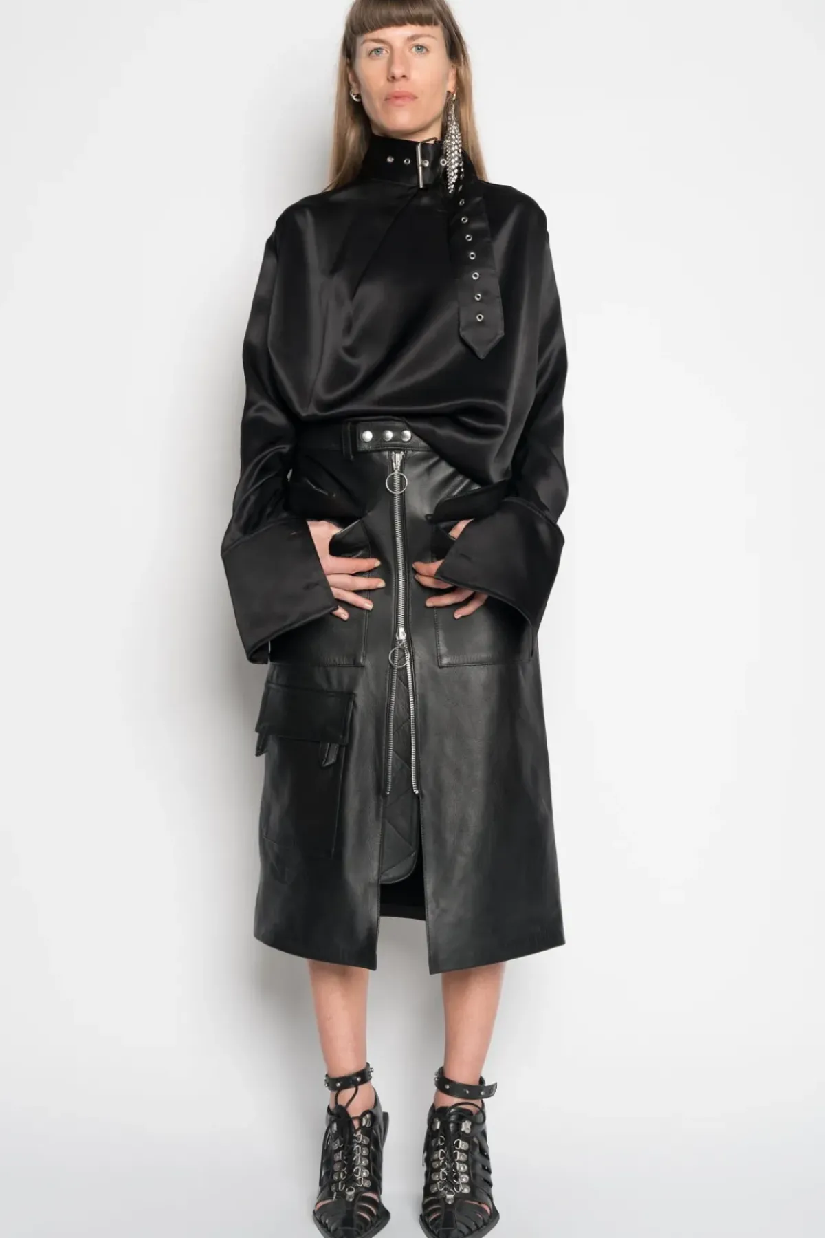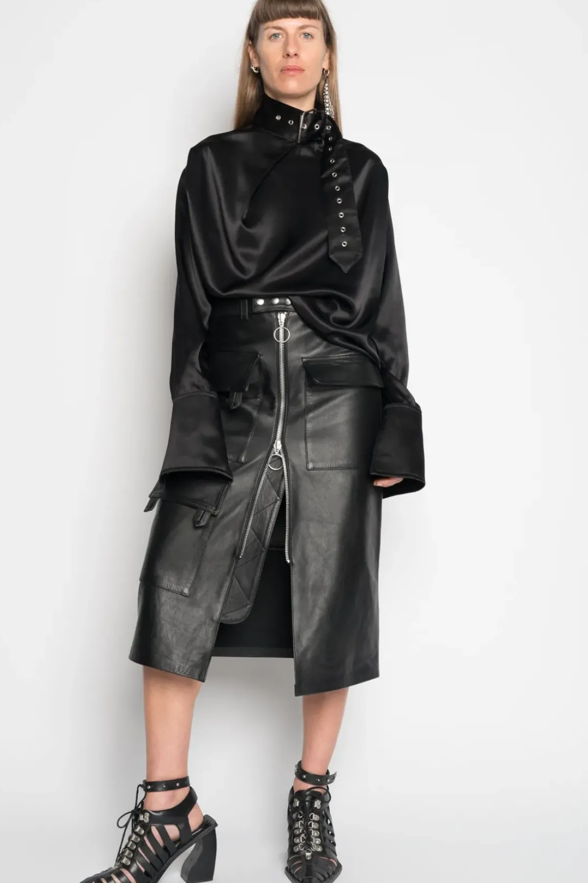 This timeless black leather midi skirt offers a stunning silhouette, with multiple pockets and a front zip fastening for an effortlessly cool look.
