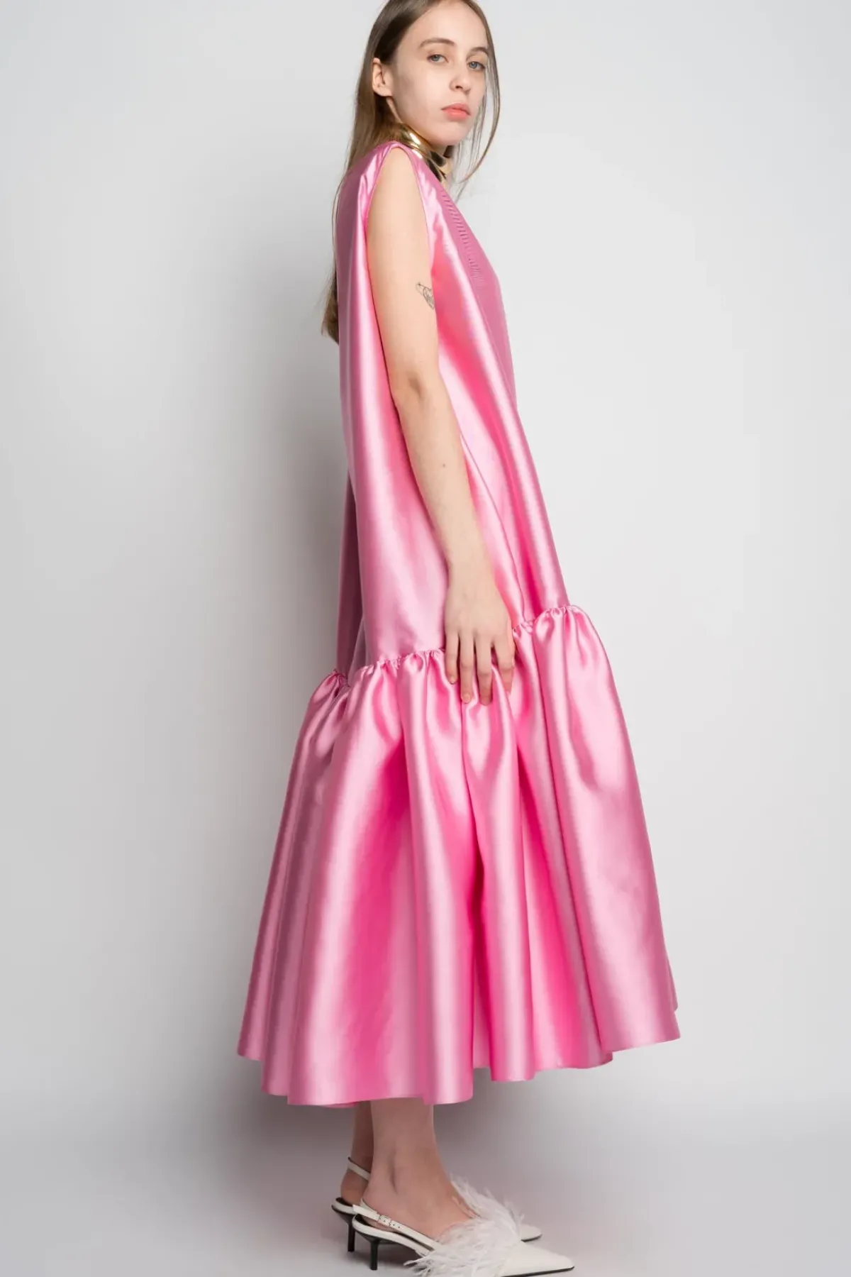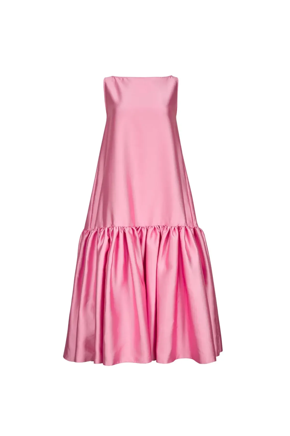 Introducing our pink midi sleeveless puff hem dress: a mikado fabric dress in a soft light pink colour with a flattering midi length, puff hem and boat neck. This dress is perfect for any special occasion.