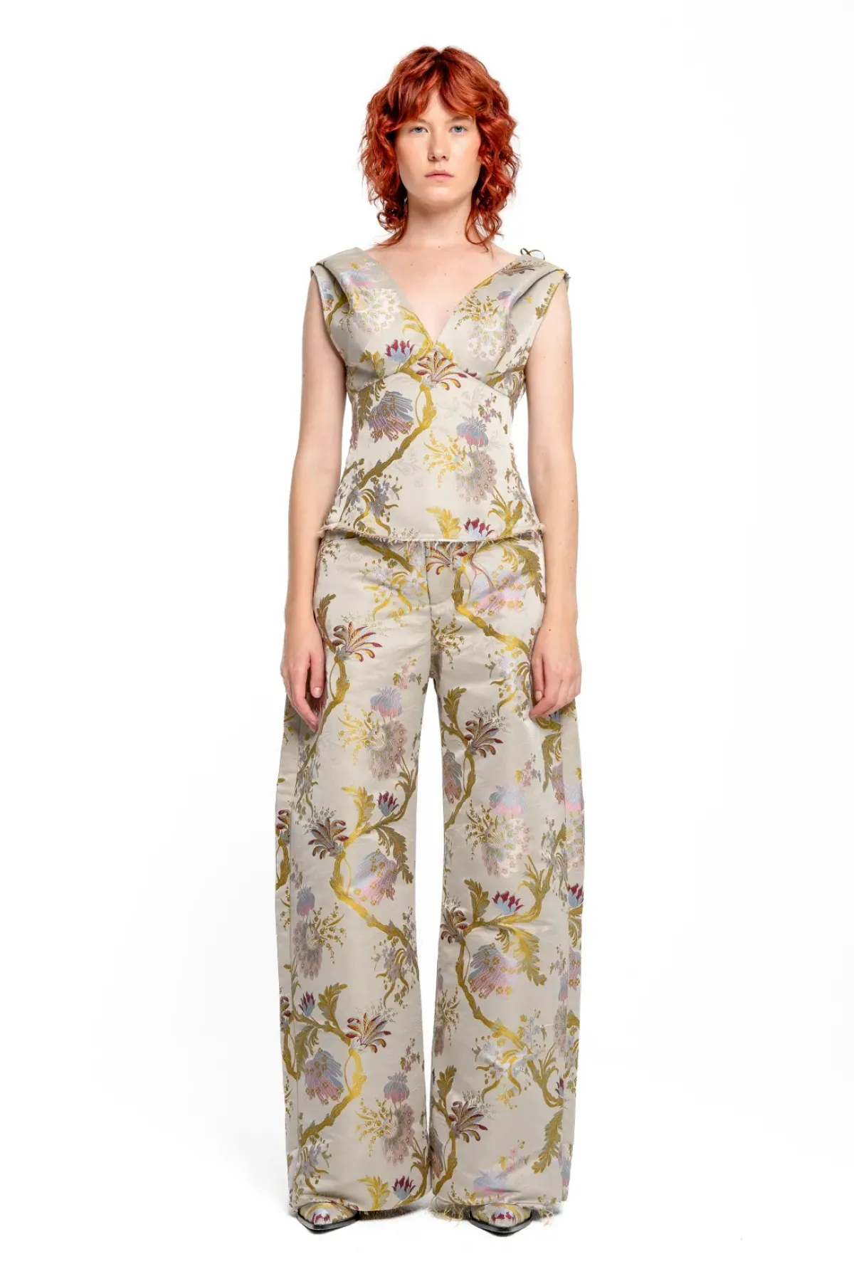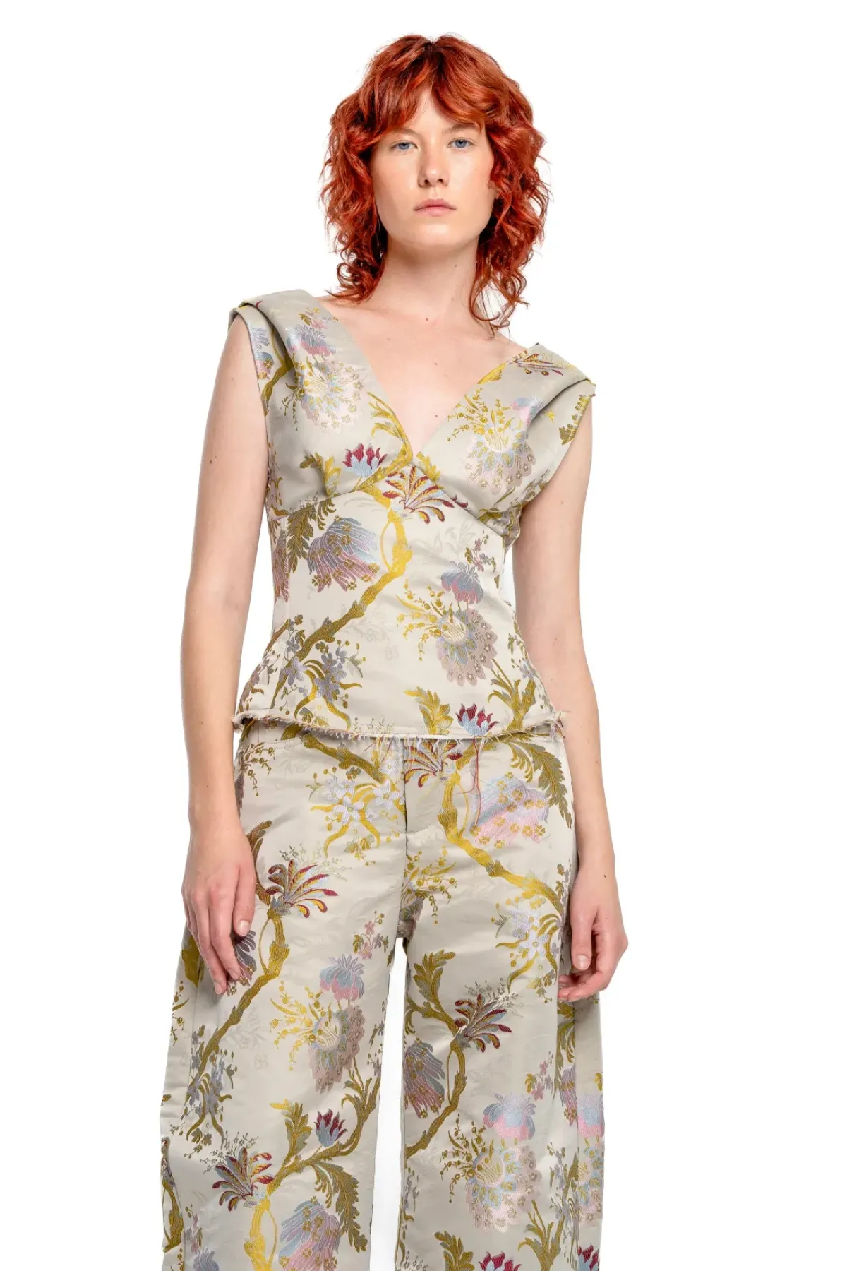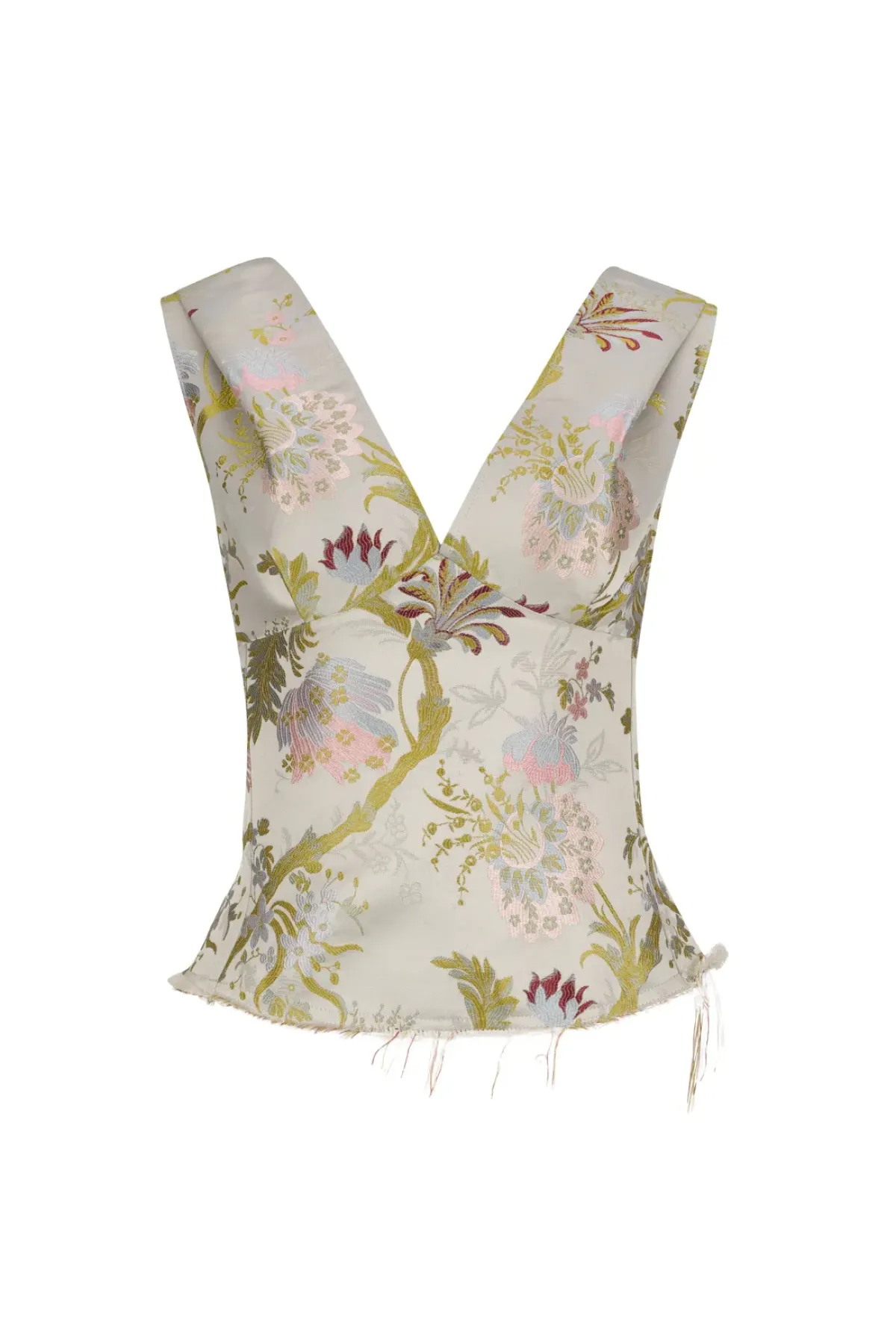 This top is crafted from a grey satin brocade and boasts a fitted design, off-shoulder cut, and a flattering v-neckline. The raw hem adds a hint of edginess, making it a wardrobe essential for any occasion.