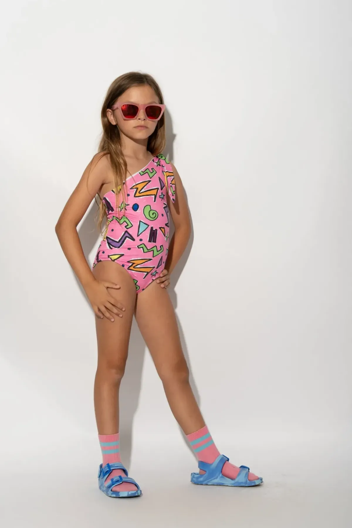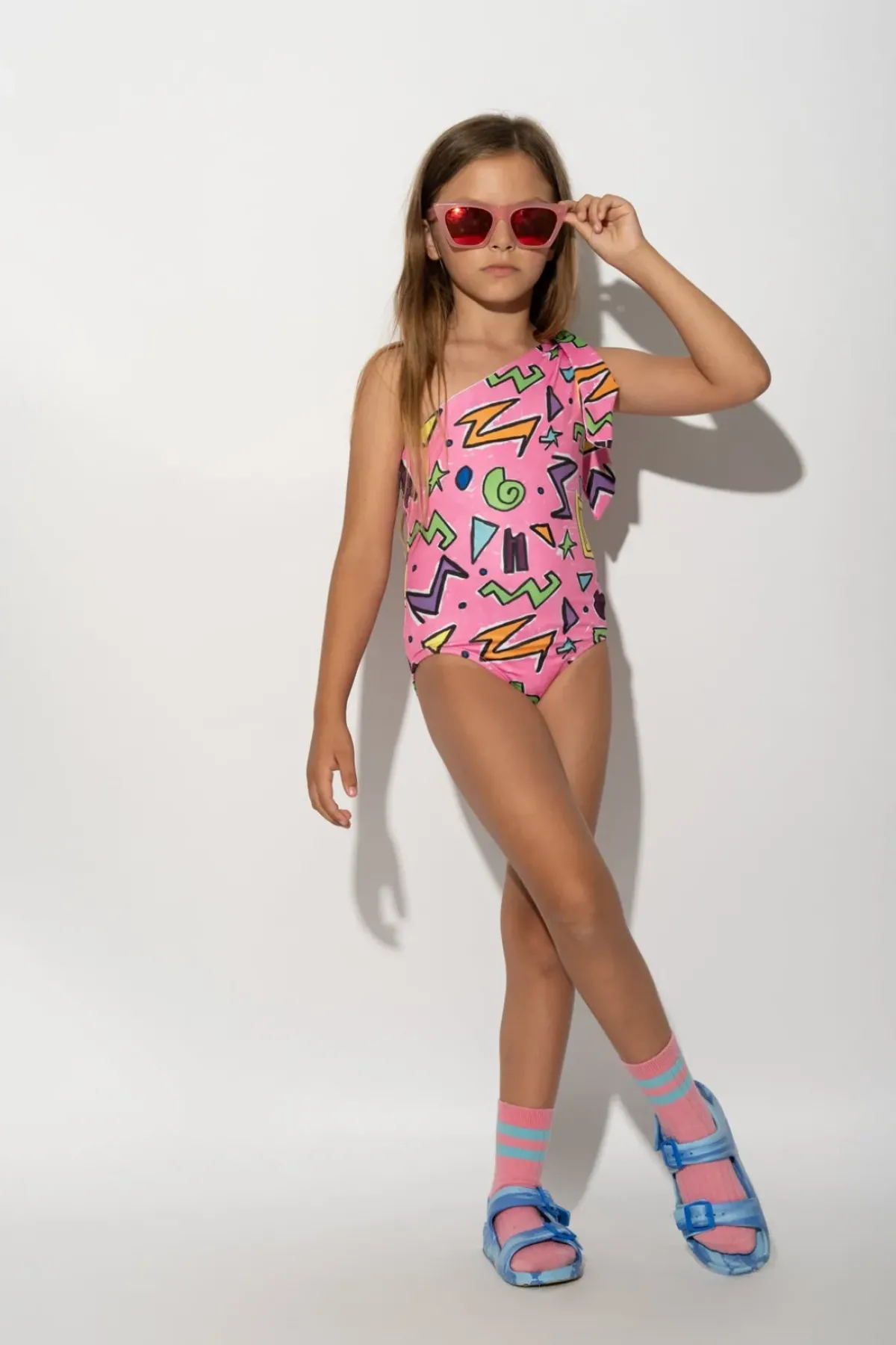 This swimsuit is a real catch – it's one-shoulder look and bold pink squiggle print make it the ultimate statement piece for kids who are serious about having fun in the sun!