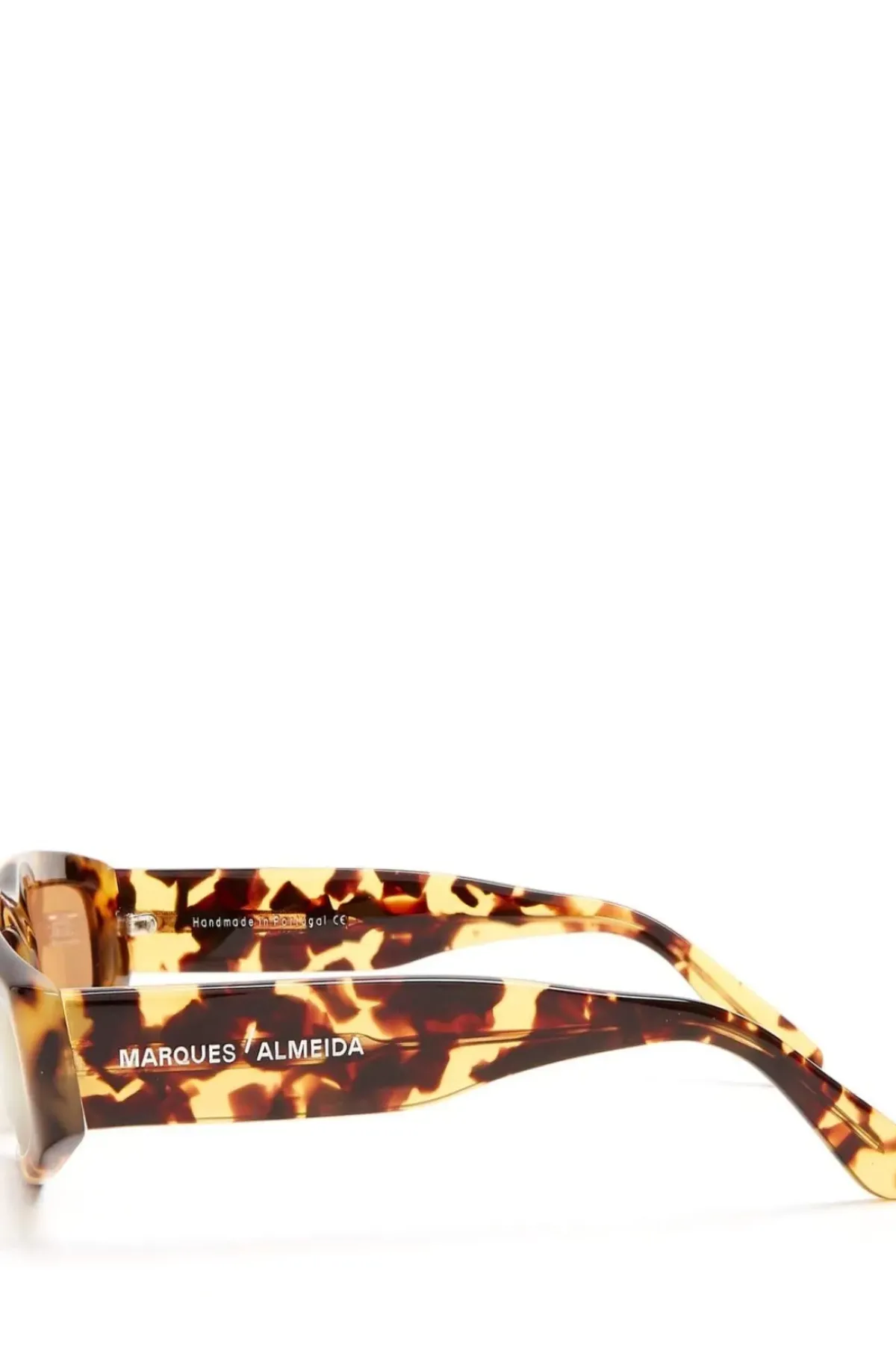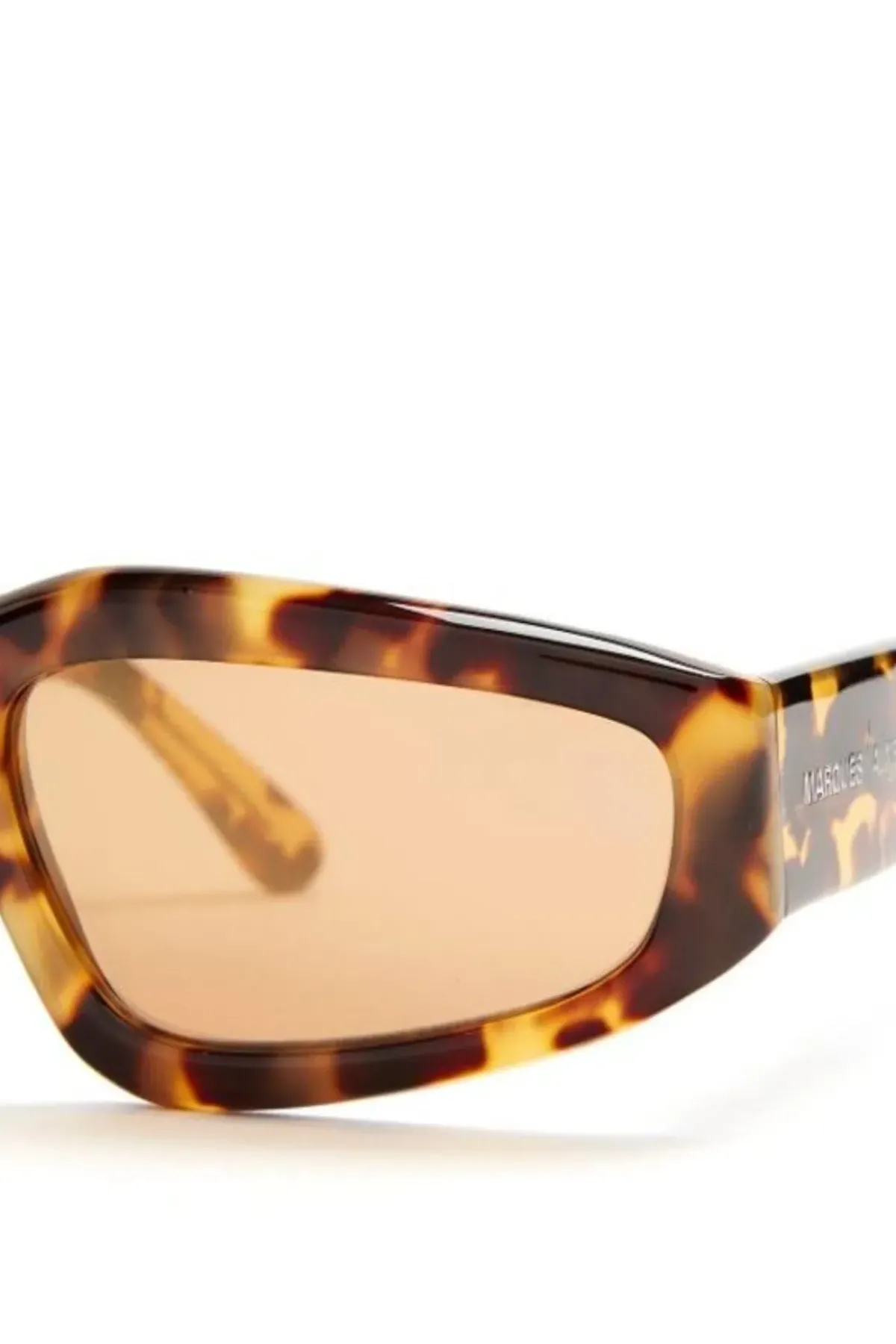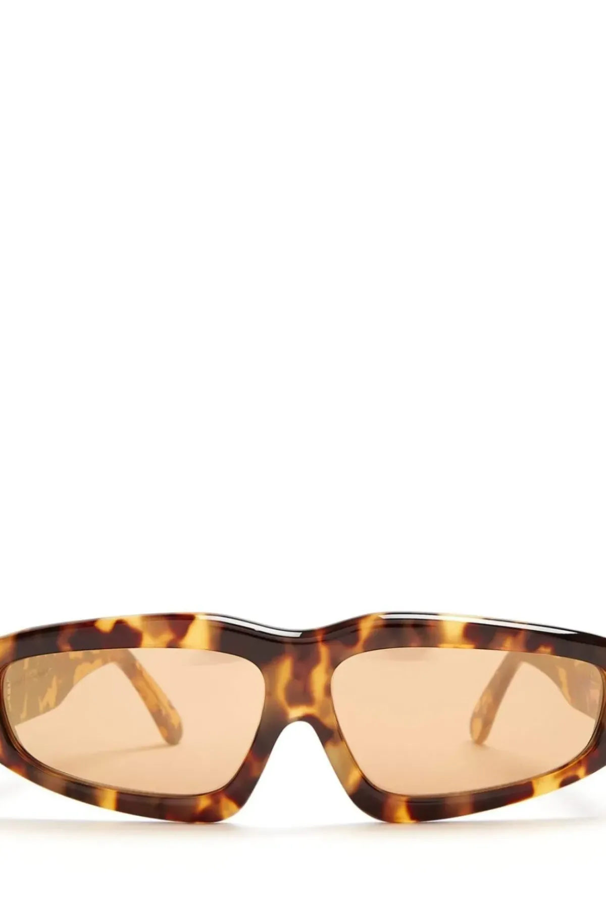 Angular sunnies made from a brown tortoiseshell frame and sepia-mirrored lenses, plus a silver debossed logo on the arms.