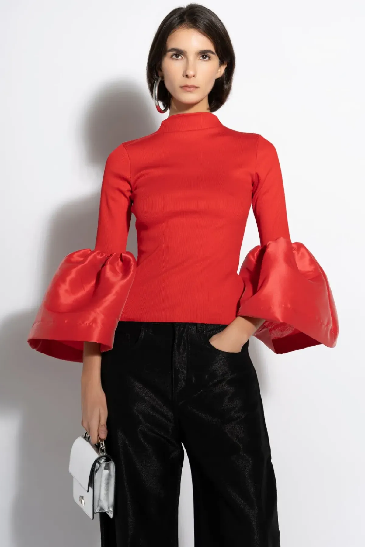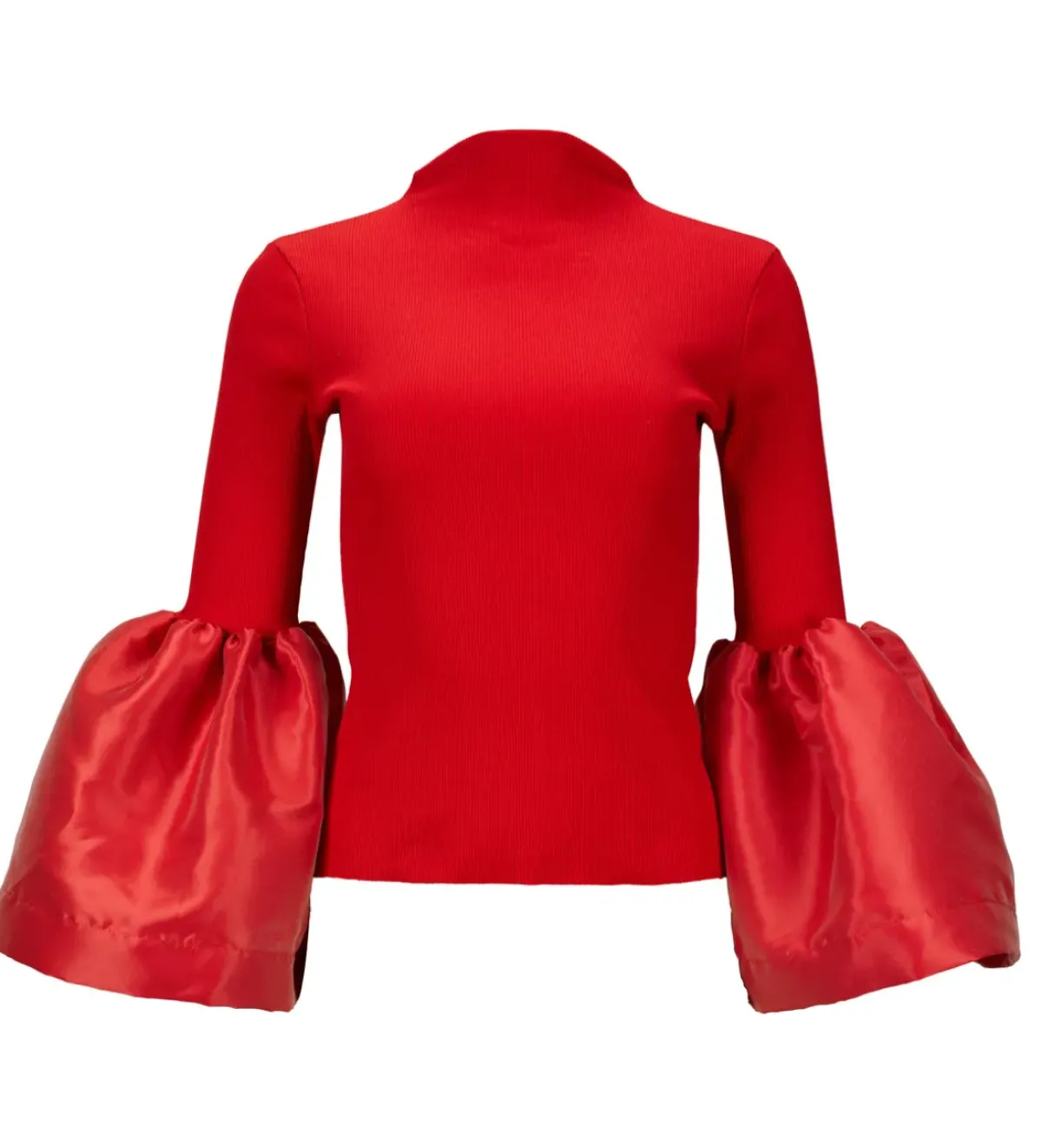 This red fitted top radiates style with its high neckline and statement sleeves. Its high neckline and puffed bell sleeves add a touch of flair to any outfit.