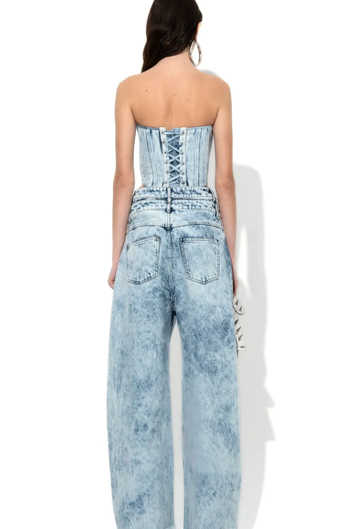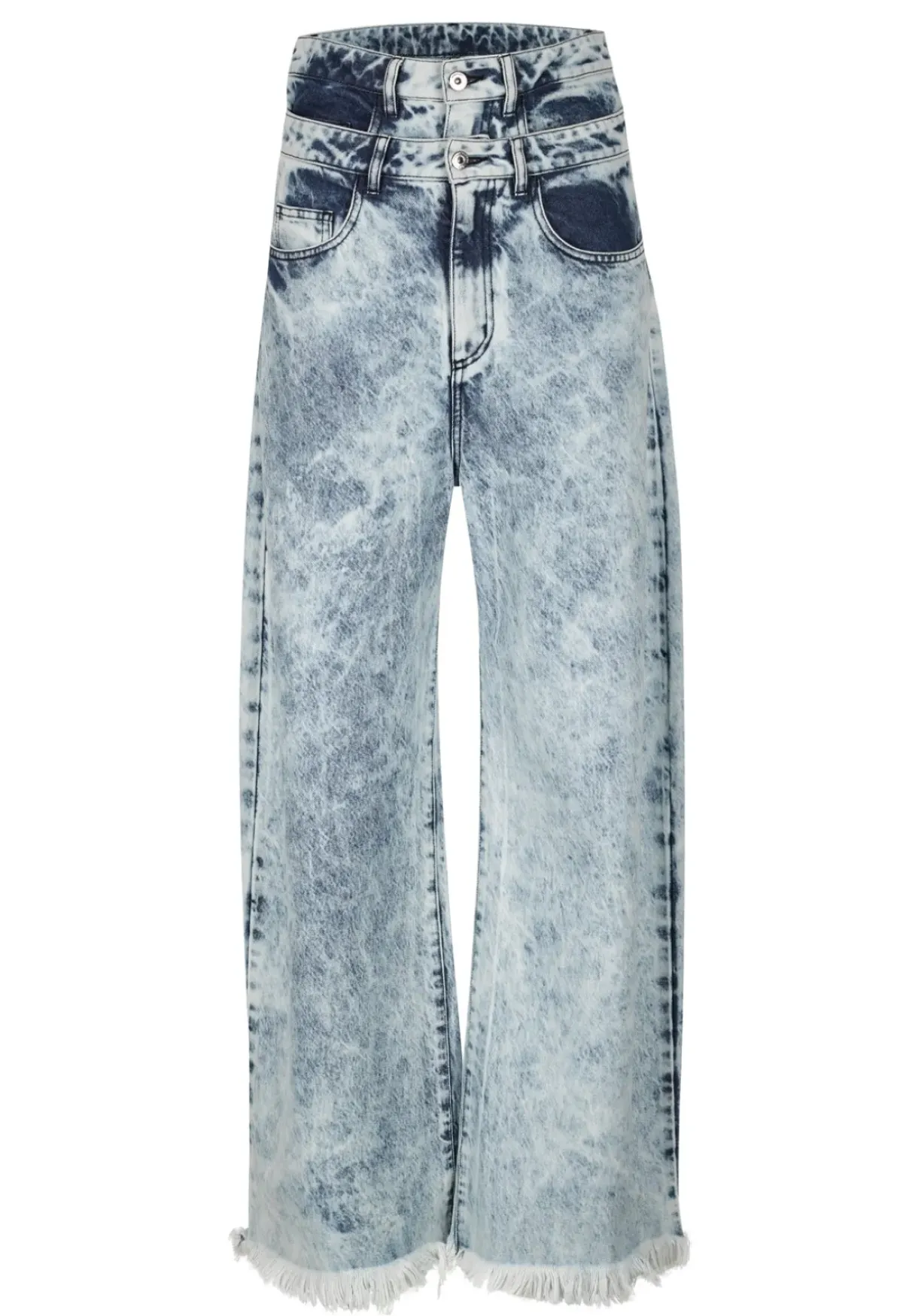 Indulge your style with these acid wash denim double waist boyfriend trousers. They feature a wide-leg cut, raw hems and a loose fit.
