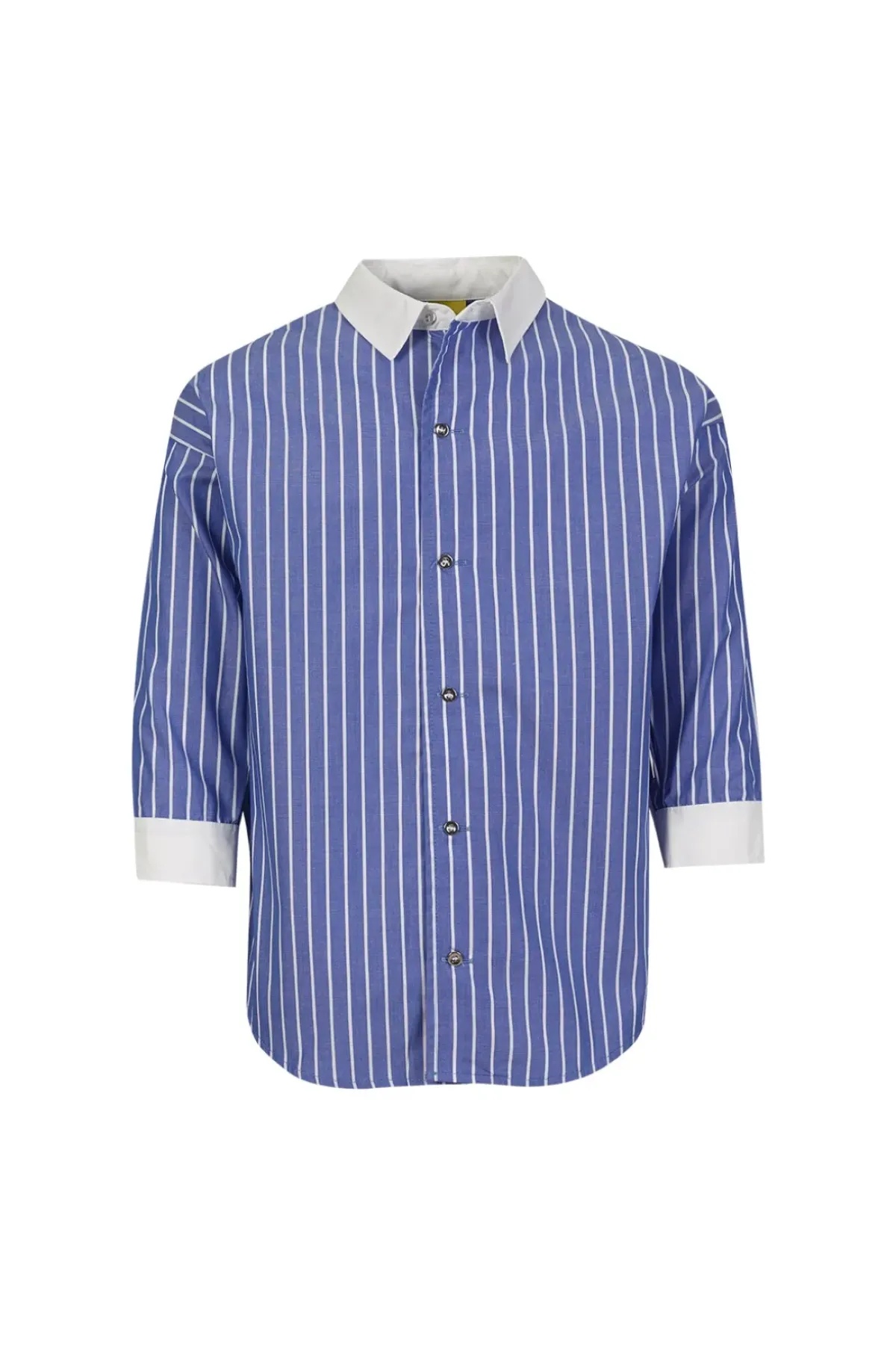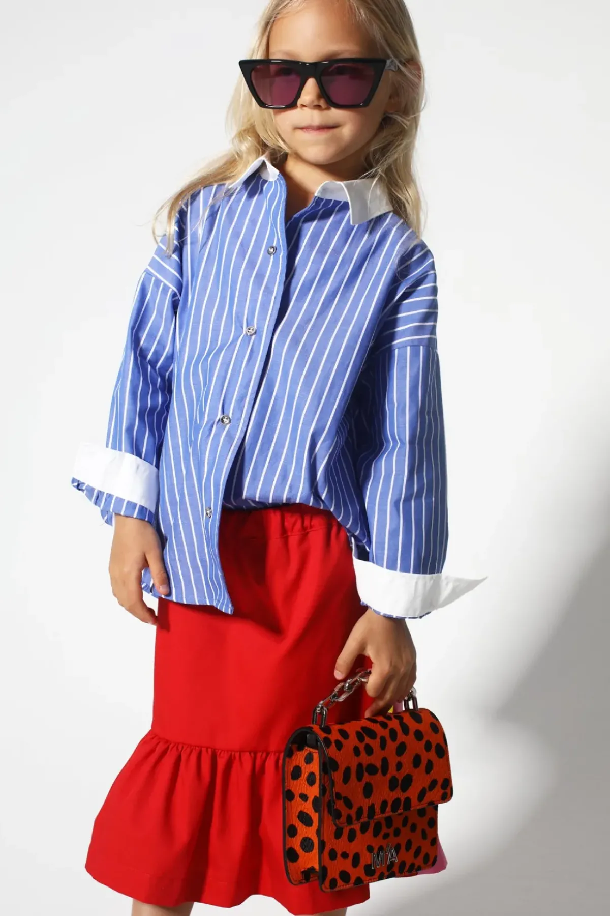 This comfy kid-sized shirt has blue and white stripes, long sleeves, a white point collar, and fold-up white cuffs. No need to be a grown-up when you're styling in this sweet top!
