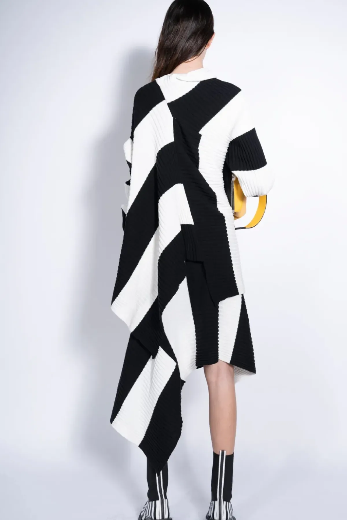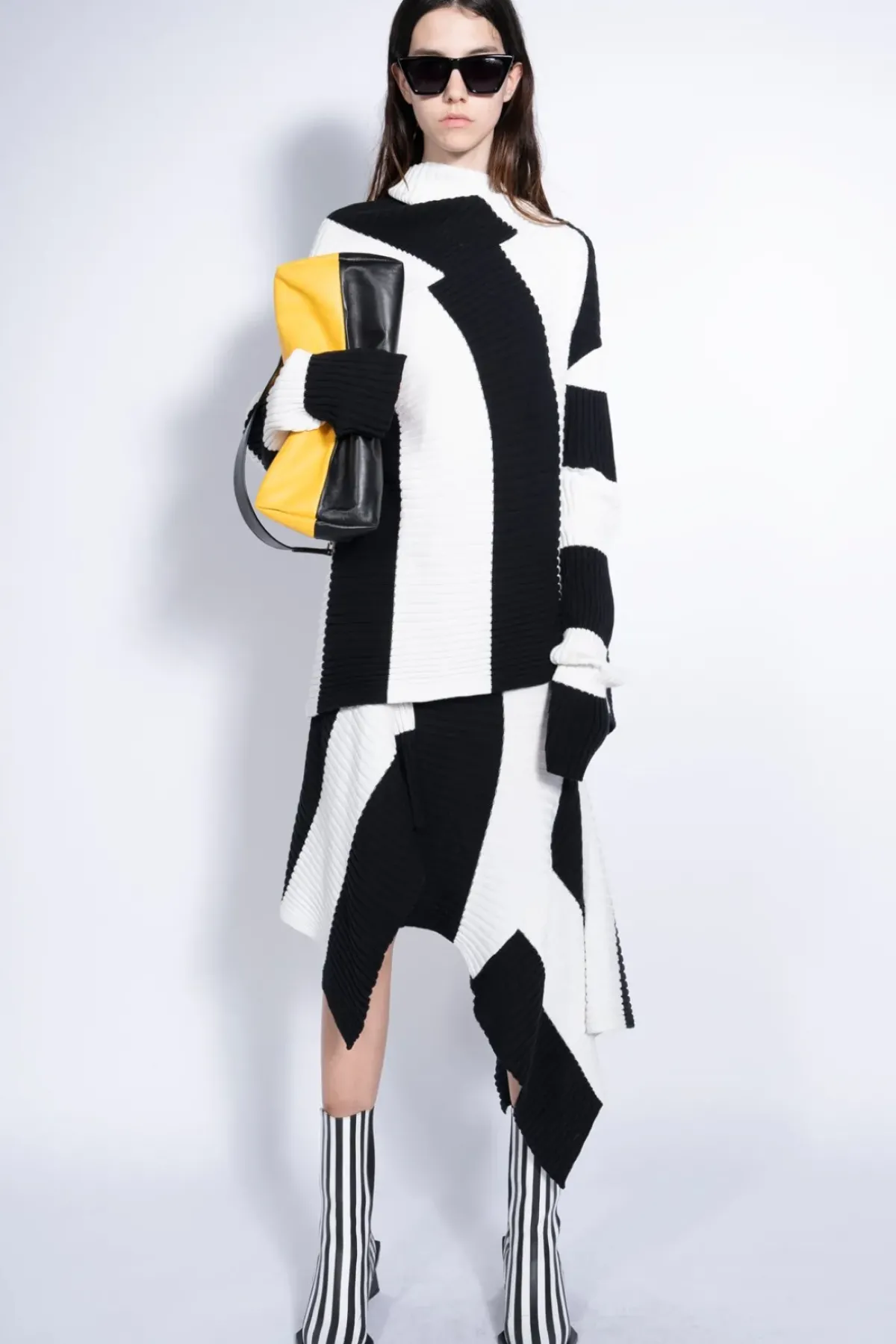 Our black and white draped jumper in striped cotton knit, M'A's signature unfinished edges and a cowl neck, will elevate your look.
