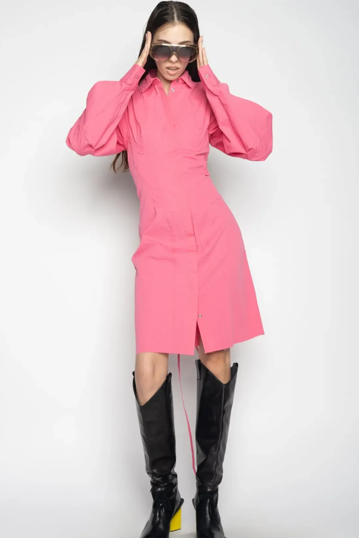 Stylish midi dress in a textured pink shirting fabric flaunts polished buttons along the front, balloon sleeves and a beautiful corset-style back finished with delicate lace.
