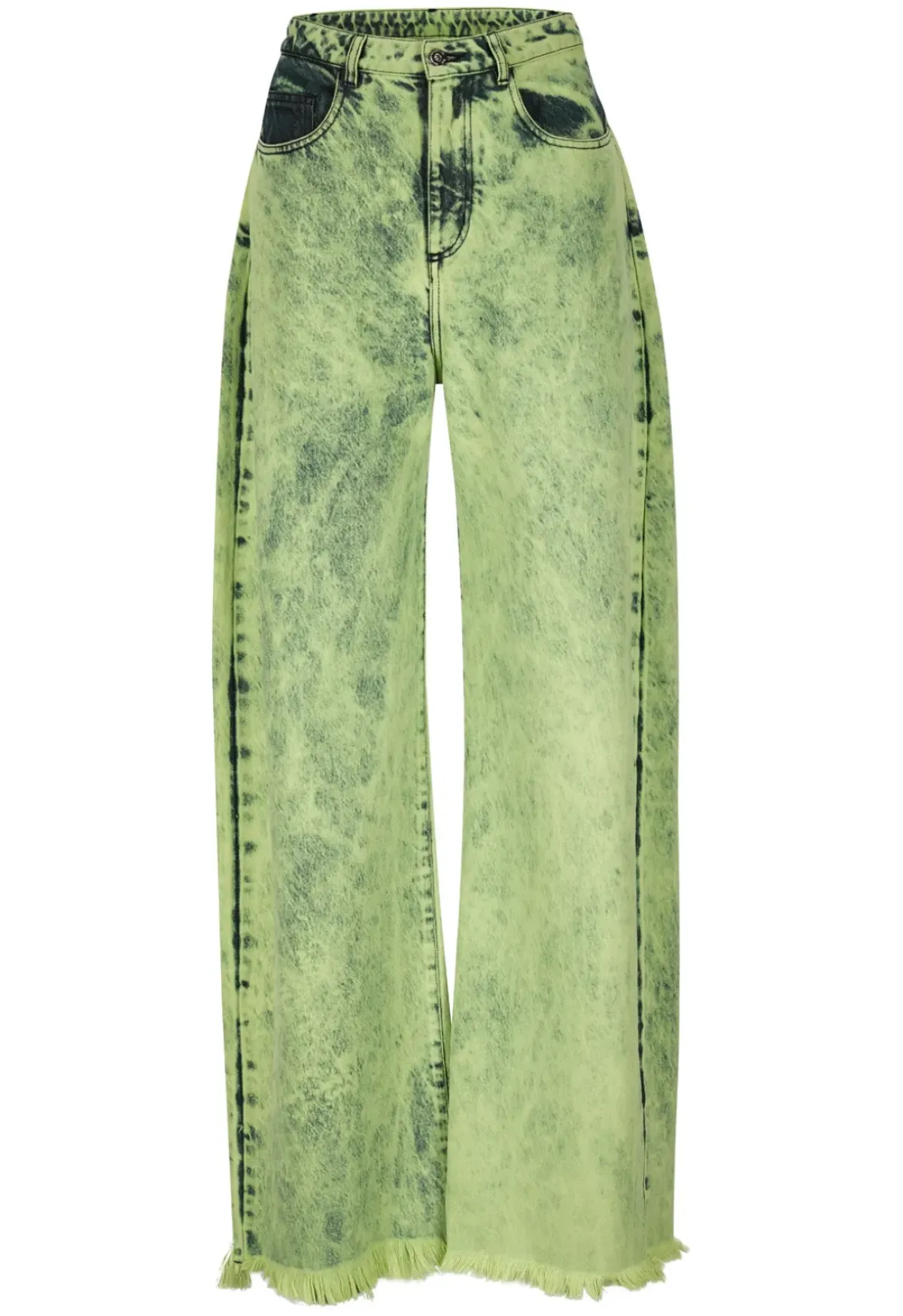 Check out these lime M'A boyfriend trousers! They boast a wide-leg design, 5-pocket style, raw hems and a drop waist style.