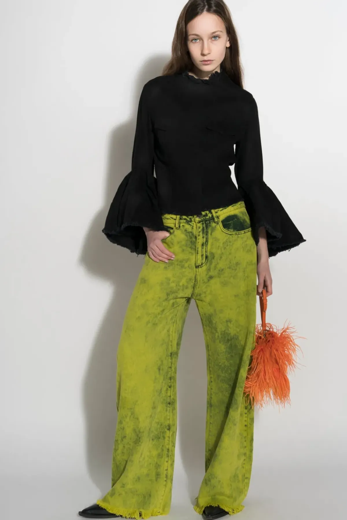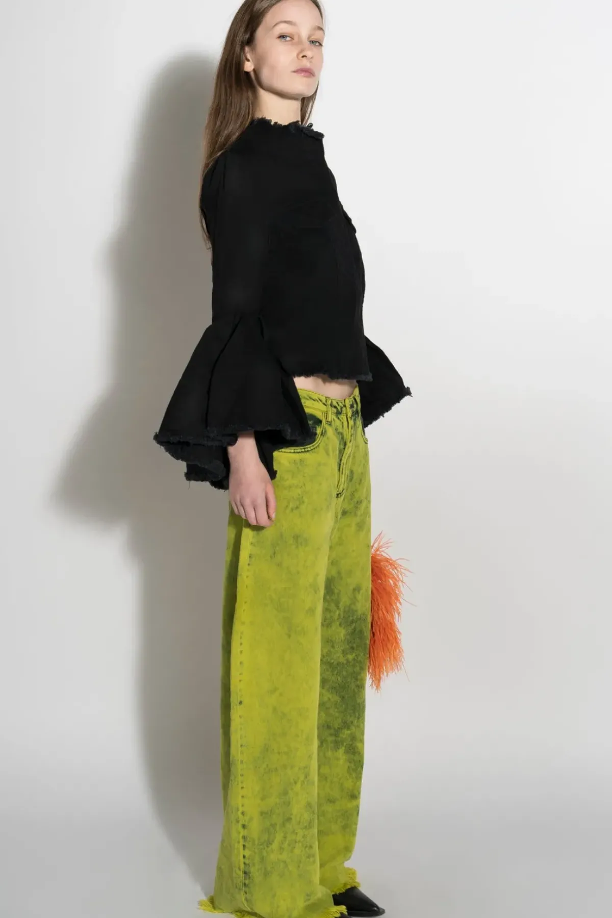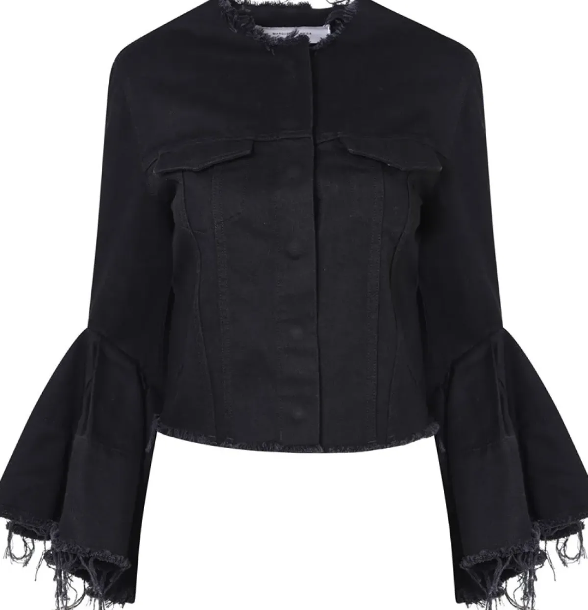 This denim classic jacket is fitted and finished with bell sleeves. Its frayed edges, round neckline, front button fastening and two chest pockets create the ultimate look.