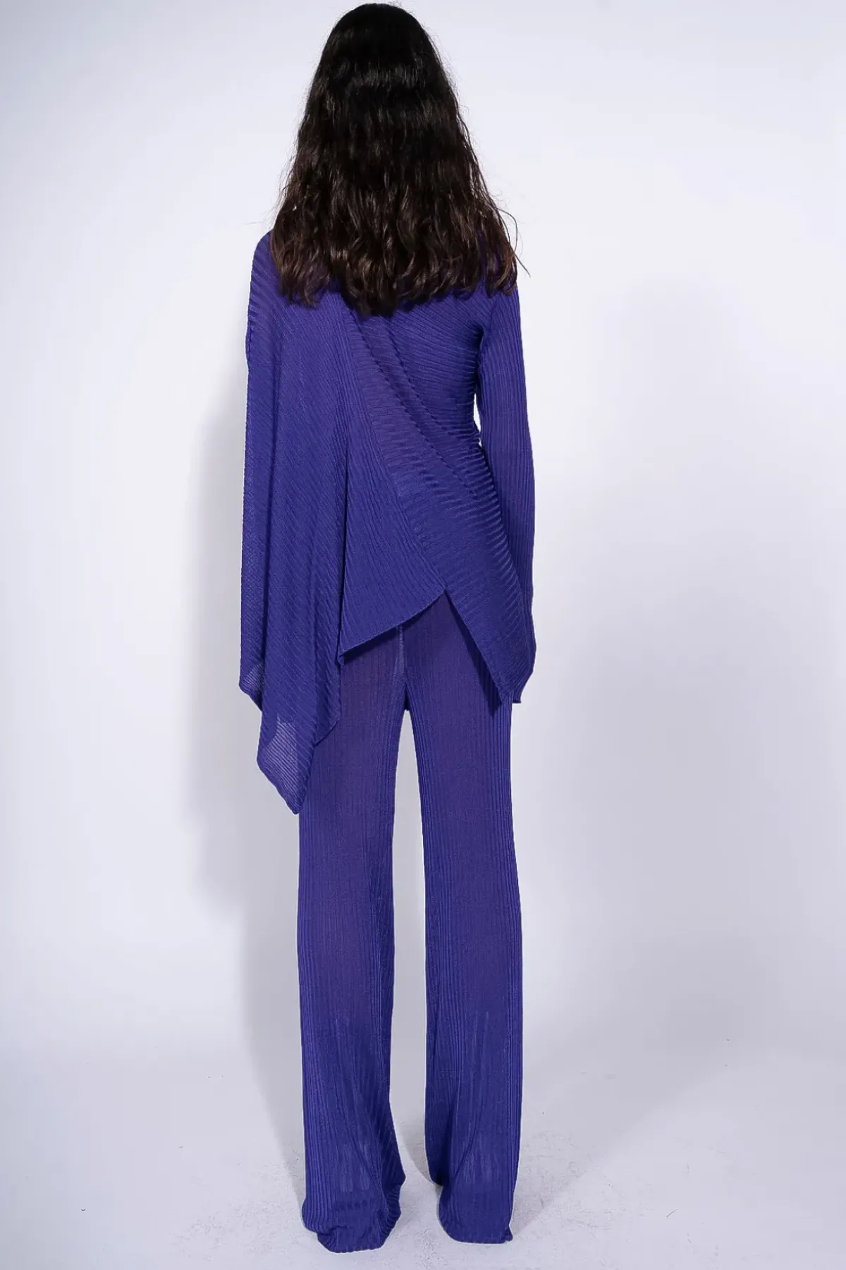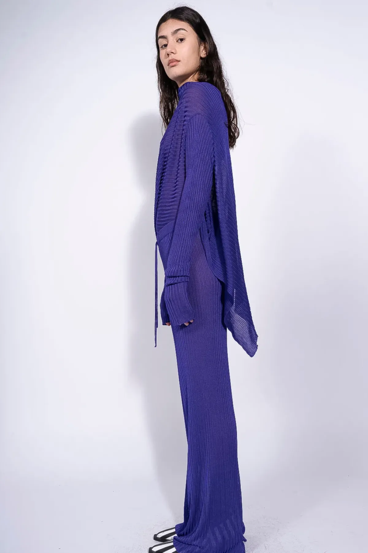 This asymmetric jumper in a translucent purple lightweight knit features a slashed cowl neck, M'A's signature raw hems, and longline sleeves. Make a statement when you step out in this must-have jumper.
